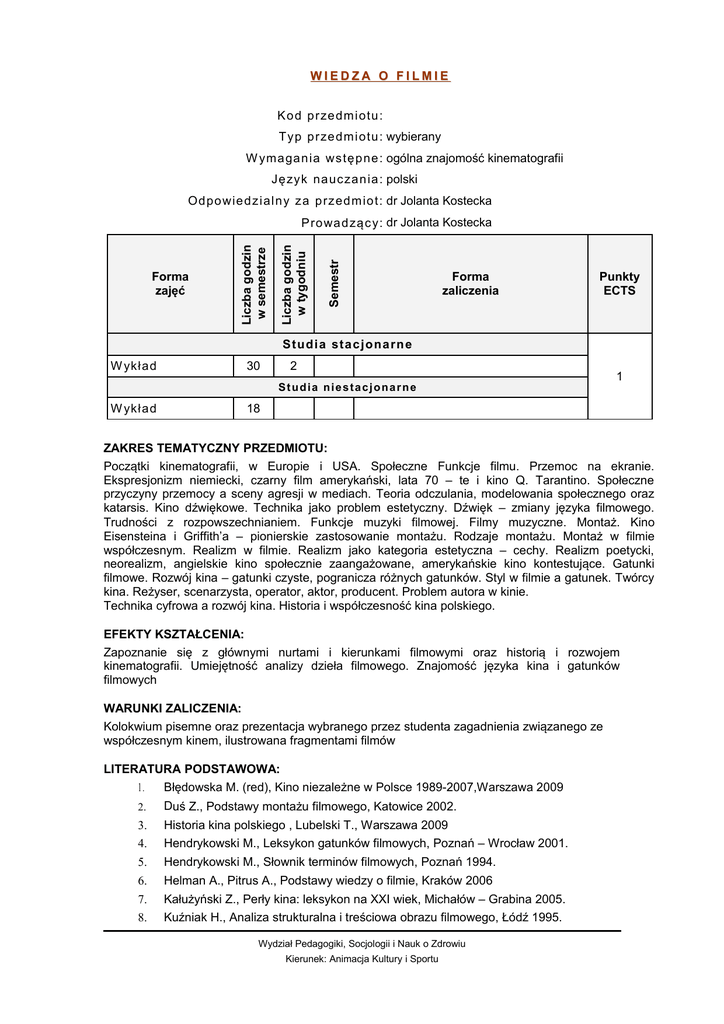 WIEDZA O FILMIE K od p rze dm io tu : T yp p rze dm io tu : wybierany W yma ga n ia wst ę p ne : ogólna znajomość kinematografii Ję zyk na ucza n ia : polski Od po wie d zia ln y za p rze dm io t: dr Jolanta Kostecka Semestr Liczba godzin w tygodniu Forma zajęć Liczba godzin w semestrze P ro wa d zą c y: dr Jolanta Kostecka Forma zaliczenia Punkty ECTS S tudi a sta c jona rne W ykład 30 2 Studia niestacjonarne W ykład 1 18 ZAKRES TEMATYCZNY PRZEDMIOTU: Początki kinematografii, w Europie i USA. Społeczne Funkcje filmu. Przemoc na ekranie. Ekspresjonizm niemiecki, czarny film amerykański, lata 70 – te i kino Q. Tarantino. Społeczne przyczyny przemocy a sceny agresji w mediach. Teoria odczulania, modelowania społecznego oraz katarsis. Kino dźwiękowe. Technika jako problem estetyczny. Dźwięk – zmiany języka filmowego. Trudności z rozpowszechnianiem. Funkcje muzyki filmowej. Filmy muzyczne. Montaż. Kino Eisensteina i Griffith’a – pionierskie zastosowanie montażu. Rodzaje montażu. Montaż w filmie współczesnym. Realizm w filmie. Realizm jako kategoria estetyczna – cechy. Realizm poetycki, neorealizm, angielskie kino społecznie zaangażowane, amerykańskie kino kontestujące. Gatunki filmowe. Rozwój kina – gatunki czyste, pogranicza różnych gatunków. Styl w filmie a gatunek. Twórcy kina. Reżyser, scenarzysta, operator, aktor, producent. Problem autora w kinie. Technika cyfrowa a rozwój kina. Historia i współczesność kina polskiego. EFEKTY KSZTAŁCENIA: Zapoznanie się z głównymi nurtami i kierunkami filmowymi oraz historią i rozwojem kinematografii. Umiejętność analizy dzieła filmowego. Znajomość języka kina i gatunków filmowych WARUNKI ZALICZENIA: Kolokwium pisemne oraz prezentacja wybranego przez studenta zagadnienia związanego ze współczesnym kinem, ilustrowana fragmentami filmów LITERATURA PODSTAWOWA: 1. Błędowska M. (red), Kino niezależne w Polsce 1989-2007,Warszawa 2009 2. Duś Z., Podstawy montażu filmowego, Katowice 2002. 3. Historia kina polskiego , Lubelski T., Warszawa 2009 4. Hendrykowski M., Leksykon gatunków filmowych, Poznań – Wrocław 2001. 5. Hendrykowski M., Słownik terminów filmowych, Poznań 1994. 6. Helman A., Pitrus A., Podstawy wiedzy o filmie, Kraków 2006 7. Kałużyński Z., Perły kina: leksykon na XXI wiek, Michałów – Grabina 2005. 8. Kuźniak H., Analiza strukturalna i treściowa obrazu filmowego, Łódź 1995. Wydział Pedagogiki, Socjologii i Nauk o Zdrowiu Kierunek: Animacja Kultury i Sportu 9. Michalski A., Kino operatorów, Bydgoszcz 1995. 10. Płażewski J., Historia filmu 1895 – 2000, Warszawa 2000. 11. Przemoc na ekranie, pod red. M. Hendrykowskiego i M. Hendrykowskiej, Poznań 2001. 12. Sowińska J., Dźwięki i obrazy: o słuchaniu filmów, Katowice 2001. 13. Stachówna G., Władcy wyobraźni: sławni bohaterowie filmowi, Kraków 2006. 12. Stokarczyk D., Historia amerykańskiego musicalu filmowego, Wrocław 2002. 13. Skrzypczak P., Aktor i jego postać ekranowa, Toruń 2008 Wydział Pedagogiki, Socjologii i Nauk o Zdrowiu Kierunek: Animacja Kultury i Sportu