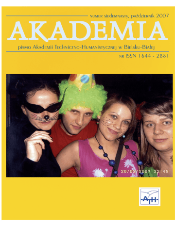 AKADEMIA numer siedemnasty, paŸdziernik 2007 pismo Akademii Techniczno-Humanistycznej w Bielsku-Bia³ej nr ISSN 1644 - 2881 Goœcie Akademii Wspomnienia Erasmusa Zdjêcia Paw³a Powszeka, laureata pierwszej nagrody oraz wyró¿nienia w konkursie „Wspomnienia Erasmusa” – na górze „Koty”, na dole „Lublanica”. ci¹g dalszy na str. 39 2 Witamy w Akademii W NUMERZE: str. 4 – Nagrody Fiata – szóstka z ATH str. 5-6 – informacje z ¿ycia uczelni, m.in. Nowe kierunki studiów podyplomowych; Pierwszy magister na Wydziale Humanistyczno-Spo³ecznym str. 7-9 – konferencje naukowe: Regiony pograniczne w dobie integracji europejskiej; Nowoczesne tendencje w logistyce; Rozwój. Godnoœæ cz³owieka – Gospodarowanie – Poszanowanie przyrody. str. 9 – Podskoczyliœmy o 11 miejsc: ATH w rankingu „Perspektyw” i „Rzeczpospolitej” str. 10-11 – Chocho³y – parafraza beskidzka: fotoreporta¿ str. 12-19 – Wydzia³ Nauk o Materia³ach i Œrodowisku: rozmowy – z dr. hab. Jaros³awem Janickim, prof. ATH, – z dr. hab. Janem ¯arnowcem, prof. ATH, – z dr. Ernestem Zawad¹, Laboratorium Badañ Wyrobów W³ókienniczych i Geosyntetyków str. 20-21 – Artes liberales: Marek Bernacki: Suwalskie tropy w twórczoœci Czes³awa Mi³osza str. 22 – Unia dla pielêgniarek str. 23-30 – Z albumu profesora Henryka Klamy: Korzystam z ka¿dej chwili; Uczelnia przyjazna studentom str. 32-34 – Ksi¹¿ki: Nowoœci Wydawnictwa Naukowego ATH; recenzja ksi¹¿ki pt. Maraton – wieczne wyzwanie str. 36-37 – Historia: Studenci chc¹ samorz¹du str. 38 – Bielsko-Bia³a w oczach cudzoziemki str. 2 i 39 – Goœæ Akademii: biskup PAWE£ ANWEILER Szanowni Pañstwo! Po raz pierwszy w historii naszej uczelni oddajemy do u¿ytku nowo wybudowany budynek. Budowa trwa nadal, ale uda³o nam siê ukoñczyæ trzy kondygnacje i zajêcia mog¹ siê rozpocz¹æ. Nigdy dotychczas nie dysponowaliœmy budynkiem wybudowanym od podstaw specjalnie dla potrzeb naszej uczelni. To dla nas niezwykle wa¿ne wydarzenie. Optymizmem napawa fakt, i¿ wynagrodzono nam niedoszacowania naszych potrzeb z poprzednich lat, co powoduje, ¿e sytuacja finansowa uczelni wyraŸnie siê poprawi³a. Mogliœmy zap³aciæ za nadgodziny, wywi¹zaæ siê z obowi¹zków socjalnych. Bêdziemy mogli wyp³aciæ nagrody, a tak¿e niewielkie podwy¿ki dla pracowników. Podobnie, jak inne uczelnie europejskie, tak i nas dotkn¹³ problem spadku liczby kandydatów na kierunki techniczne. Aby zachêciæ przysz³orocznych kandydatów do studiowania u nas, musimy po³o¿yæ wiêkszy nacisk na wspó³pracê ze szko³ami. Bierzemy pod uwagê mo¿liwoœæ otwarcia ju¿ w przysz³ym roku szkolnym w³asnej szko³y œredniej, podobnie jak to zrobi³a Politechnika £ódzka. Ponownie z³o¿ymy wnioski o przyznanie praw doktoryzowania na czterech kierunkach, które to wnioski poprzednio zosta³y rozpatrzone negatywnie. Uwa¿am, ¿e musimy podnosiæ status uczelni i wszystkie wydzia³y powinny mieæ prawa doktoryzowania. Ogromnym zaszczytem by³o dla mnie otrzymanie tytu³u doktora honoris causa nadanego mi przez Politechnikê £ódzk¹. S¹dzê, ¿e to równie¿ istotne dla ca³ej naszej uczelni. Politechnika £ódzka potwierdzi³a w ten sposób, i¿ rozwój Akademii Techniczno-Humanistycznej jest dla niej godny pochwa³y. Mamy dobre perspektywy i nie mo¿emy tego „Akademia” – zmarnowaæ! Musimy dbaæ o to, ¿eby studenci pismo Akademii chcieli u nas studiowaæ! W tym celu kadra musi Technicznozmieniæ swój stosunek do studentów i na to chcê -Humanistycznej po³o¿yæ szczególny nacisk. Student jest cz³owiew Bielsku-Bia³ej kiem, którego ka¿dy profesor powinien traktowaæ ul. Mickiewicza 24, z ¿yczliwoœci¹. To my jesteœmy dla studentów, 43-300 Bielsko-Bia³a a nie studenci dla nas. Profesor powinien byæ studentom przychylny i mieæ na uwadze ich Redaktor naczelny: Artur Pa³yga. problemy nie tylko naukowe, ale i ¿yciowe i po Sk³ad: Studio Cicero. prostu, po ludzku, im pomagaæ, jak to tylko Fotografie: mo¿liwe. Stosunek do studentów tworzy atmosFranciszek Dzida, ferê na uczelni i wokó³ uczelni. I tê atmosferê redakcja. musimy poprawiæ. Na ok³adce: zdjêcia Prof. dr hab. in¿. Marek Trombski rektor Akademii Techniczno-Humanistycznej w Bielsku-Bia³ej studentów, nagrodzone w konkusie fotograficznym „Wspomnienia Erasmusa” Informacje z ¿ycia uczelni opracowano na podstawie serwisu internetowego www.ath.bielsko.pl Rzecznik prasowy ATH Leszek Zaporowski. 3 Vivat Academia! 20 czerwca 2007 r. w £odzi odby³a siê uroczystoœæ nadania tytu³u i godnoœci Doktora Honoris Causa Politechniki £ódzkiej Profesorowi Markowi Trombskiemu, Rektorowi Akademii Techniczno-Humanistycznej w Bielsku-Bia³ej. Profesor Marek Trombski doktorem honoris causa P£ Profesor Marek Trombski urodzi³ siê 14 wrzeœnia 1937r. w £odzi. Ukoñczy³ studia na Wydziale Mechanicznym Politechniki £ódzkiej w 1960 r. i bezpoœrednio po ich ukoñczeniu rozpocz¹³ prace jako konstruktor w Katedrze Cieplnych Maszyn Przep³ywowych, któr¹ kierowa³ prof. W³adys³aw Gundlach. Stopieñ naukowy doktora nauk technicznych uzyska³ w 1967 r., a stopieñ doktora habilitowanego piêæ lat póŸniej. Tytu³ naukowy profesora nauk technicznych otrzyma³ w 1989 r. Od 1992 r. zatrudniony jest na stanowisku profesora zwyczajnego, w latach 1992-2001 w Filii Politechniki £ódzkiej w Bielsku Bia³ej, a od 2001r. w Akademii Techniczno-Humanistycznej, uczelni powsta³ej z przekszta³cenia siê filii Politechniki £ódzkiej. Zainteresowania naukowe prof. Marka Trombskiego koncentrowa³y siê g³ównie na: statyce i dynamice ustrojów powierzchniowych, a w szczególnoœci p³yt ko³owych i pierœcieniowych, analizie naprê¿eñ i od- 4 kszta³ceñ w elementach maszyn i konstrukcji, dynamice maszyn w³ókienniczych, statyce, statecznoœci i dynamice ¿urawi samochodowych i samojezdnych. Prof. M. Trombski jest autorem lub wspó³autorem oko³o 100 publikacji naukowych