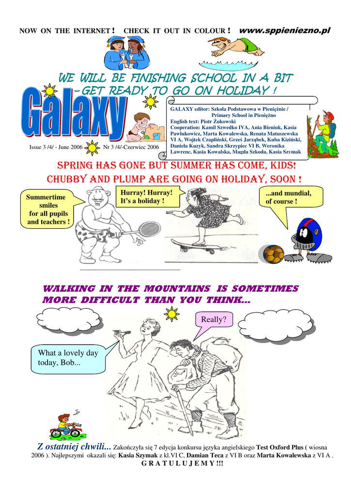 NOW ON THE INTERNET ! CHECK IT OUT IN COLOUR ! www.sppieniezno.pl WE WILL BE FINISHING SCHOOL IN A BIT – GET READY TO GO ON HOLIDAY ! Issue 3 /4/ - June 2006 Nr 3 /4/-Czerwiec 2006 GALAXY editor: Szkoła Podstawowa w PienięŜnie / Primary School in PienięŜno English text: Piotr śukowski Cooperation: Kamil Szwedko IVA, Ania Bieniuk, Kasia Pawlukowicz, Marta Kowalewska, Renata Matuszewska VI A, Wojtek Czapliński, Grześ Jarząbek, Kuba Kiziński, Issue 3 Daniela Kuzyk, Sandra Skrzypiec VI B, Weronika Lawrenc, Kasia Kowalska, Magda Szkoda, Kasia Szymak SPRING HAS GONE BUT SUMMER HAS COME, KIDS! CHUBBY AND PLUMP ARE GOING ON HOLIDAY, SOON ! Hurray! Hurray! It’s a holiday ! Summertime smiles for all pupils and teachers ! ...and mundial, of course ! __________________________________ WALKING IN THE MOUNTAINS IS SOMETIMES MORE DIFFICULT THAN YOU THINK… Really? What a lovely day today, Bob... Z ostatniej chwili... Zakończyła się 7 edycja konkursu języka angielskiego Test Oxford Plus ( wiosna 2006 ). Najlepszymi okazali się: Kasia Szymak z kl.VI C, Damian Teca z VI B oraz Marta Kowalewska z VI A . G R A T U L U J E M Y !!! REST IN THE WORLD A summer vacatio vacation acation in Indonesia – how do they look like? A summer vacation in Indonesia are short. They start on the15th of June and end on the15th of July – just one month. During the vacation children usually help their parents in all kinds of work, gathering rice or sowing the corn. Although they don’t go on special package holiday, they relax during this time, but only at home. They do it after work - go swimming in the sea, have picnics on the river or lake, play with other children and cook their Indonesian food. . After vacation children start going to school. They have classes till Sunday but the classes only take place in the mornings – from 7 am till 1 pm. Afternoons are free – kids spend them with their families at home. The text was prepared by Kasia Kowalska, based on an exclusive interview with Fr. Franciskus Laka, SVD, from Indonesia Glossary: rest – wypoczynek/ just – tylko/ all kinds of ...– wszystkie rodzaje.../ gathering rice – zbierając ryŜ/ sowing the corn – siejąc zboŜe/ although – chociaŜ/ package holiday – wakacje zorganizowane/ during – podczas/ on the river/lake - nad rzeką/jeziorem/ classes – zajęcia/ take place - odbywają si Animals on holidays collect – zbierać/ travel – podróŜ/ K.Kiziński and S.Skrzypiec just - właśnie/ piggy bank - skarbonka $$$$$$$$$$$$$$$$$$$$$$$$$$$$$$$$$$$$$$$$$$$$$$$$$$$$$$$$$$$$$$$ 2 MAKE A WORD SCOOTER JUNE - 15 words CHICK WINDSURFING LESSON BARBECUE SUNBATHE WANDERING GO CLIMBING SNOWMAN HEAD WEB BODY COLD CUPBOARD CANOEING GO SKIING SUNGLASSES SKATING WATERSLIDE HOLIDAY HIT QUESTION CLEAN THERE TALLBOY GO SWIMMING RIDE A BIKE WARDROBE ANSWER EXPEDITION OFTEN DIVING ARMCHAIR JANUARY K.Kowalska HOT ST. CLAUS ASSOCIATIONS - SKOJARZENIA SAND QUICKLY STOOL Think of person and things characteristic of the countries presented below and match them: Example: AUSTRALIA ----------boomerang, kangaroo, koala 1. BRITAIN 2. THE CZECH REPUBLIC 3. CHINA 4. EGIPT 5. FINLAND 6. FRANCE 7. HUNGARY 8. GERMANY 9. ITALY 10. JAPAN 11. KENYA 12. MEXICO 13. NORWAY 14. POLAND 15. RUSSIA 16. SPAIN 17. TURKEY 18. THE USA A) corrida, flamenco, guitar B) Copernicus, the Wawel Dragon, bigos C) balalaika, sputnik, cosmonaut D) the Coliseum, pizza, tarantella E) the Big Ben, double-decker, fish & chips F) kebab, gyros, youghurt G) gulash, czardas, Rubik’s cube H) mummy, pyramids, the Sphinx I) fjord, igloo, anorak J) baguette, cheese, the Eiffel Tower K) coke, cowboy, Statue of Liberty L) kung-fu, rice, rickshaw M) knedlik, Skoda, Vaclav Havel N) Bavaria, Claudia Schiffer, Porsche O) sumo, sushi, origami P) Nokia, Santa Claus, sauna R) sombrero, tortilla, bullfights S) elephant, safari, savannah 3 HUM HUM UR R.Matuszewska Two friends goes by train. Suddenly one of them pulls out a sandwich and starts eating. His friend says: .- Don’t eat so noisy or else you will be thrown out by ticket inspector - Why? - Can’t you see a notice: ‘’Transport of caustic materials is forbidden’’? Dwaj koledzy jadą pociągiem. Nagle jeden z nich wyciąga kanapkę i zaczyna jeść. - Nie jedz tak głośno, bo konduktor Cię wyrzuci. - Dlaczego? - Nie widzisz napisu ,,Zabrania się przewozić materiałów Ŝrących’’? ************************************* W.Lawrenc Maliniak’s wife is carefully listening to a doctor’s advice. – You need a lot of rest, bath, fresh air, and you have to be worn warmly. In the evening she is telling her husband about the visit : - Honey, the doctor said that I have to go on holiday on the Canaries, go in the mountains and then I have to buy a fur coat… śona Maliniaka uwaŜnie słucha rad doktora. - Potrzebuje pani duŜo wypoczynku, kąpieli, świeŜego powietrza no i trzeba się ciepło ubrać. Wieczorem opowiada męŜowi o wizycie. - Kochanie, doktor powiedział, Ŝe muszę pojechać na wakacje na wyspy Kanaryjskie ,jechać w góry, a potem muszę mieć futro... *************************************** A flee says to the other one : - Where have you been on holiday? - On Crete… Mówi pchła do pchły : - Gdzie byłaś na wakacjach? - Na Krecie... *************************************** K.Szwedko - How long does a mouse live? - It depends on a cat… - Jak długo Ŝyje mysz? - To zaleŜy od kota… *************************************** - Honey, how should I dress for the picnic? - Quickly… - Kochanie, jak powinnam się ubrać na ten piknik? - Szybko... *************************************** K.Szymak Your girlfriend looks stunning in her new clothes. – They aren’t new clothes, this is my new girlfriend. - Twoja dziewczyna wygląda w tych nowych ciuchach zachwycająco - To nie są nowe ciuchy, to nowa dziewczyna. *************************************** M.Szkoda - Jenny, are you sleeping? - No, I’m not. - So lend me 10 