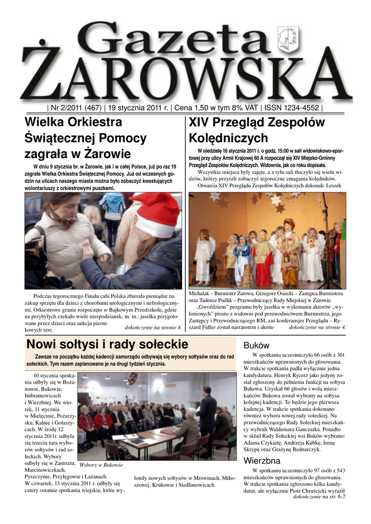 | Gazeta Żarowska Nr 2/2011 — strona 1 — 19 stycznia 2011 | | Nr 2/2011 (467) | 19 stycznia 2011 r. | Cena 1,50 w tym 8% VAT | ISSN 12344552 | Wielka Orkiestra Świątecznej Pomocy zagrała w Żarowie XIV Przegląd Zespołów Kolędniczych W dniu 9 stycznia br. w Żarowie, jak i w całej Polsce, już po raz 19 zagrała Wielka Orkiestra Świątecznej Pomocy. Już od wczesnych go dzin na ulicach naszego miasta można było zobaczyć kwestujących wolontariuszy z orkiestrowymi puszkami. W niedzielę 16 stycznia 2011 r. o godz. 15:00 w sali widowiskowospor towej przy ulicy Armii Krajowej 60 A rozpoczął się XIV MiejskoGminny Przegląd Zespołów Kolędniczych. Widownia, jak co roku dopisała. Wszystkie miejsca były zajęte, a z tyłu sali tłoczyło się wielu wi dzów, którzy przyszli zobaczyć tegoroczne zmagania kolędników. Otwarcia XIV Przeglądu Zespołów Kolędniczych dokonali: Leszek Podczas tegorocznego Finału cała Polska zbierała pieniądze na zakup sprzętu dla dzieci z chorobami urologicznymi i nefrologiczny mi. Orkiestrowe granie rozpoczęto w Bajkowym Przedszkolu, gdzie na przybyłych czekało wiele niespodzianek, m. in.: jasełka przygoto wane przez dzieci oraz aukcja pierni dokończenie na stronie 4. kowych serc. Michalak – Burmistrz Żarowa, Grzegorz Osiecki – Zastępca Burmistrza oraz Tadeusz Pudlik – Przewodniczący Rady Miejskiej w Żarowie. „Gwoździem” programu były jasełka w wykonaniu aktorów „wy łonionych” prosto z widowni pod przewodnictwem Burmistrza, jego Zastępcy i Przewodniczącego RM, zaś konferansjer Przeglądu – Ry dokończenie na stronie 4. szard Fidler został narratorem i akom Nowi sołtysi i rady sołeckie Buków Zawsze na początku każdej kadencji samorządu odbywają się wybory sołtysów oraz do rad sołeckich. Tym razem zaplanowano je na drugi tydzień stycznia. W spotkaniu uczestniczyło 66 osób z 361 mieszkańców uprawnionych do głosowania. W trakcie spotkania padła wyłącznie jedna kandydatura. Henryk Rycerz jako jedyny zo stał zgłoszony do pełnienia funkcji na sołtysa Bukowa. Uzyskał 66 głosów i wolą miesz kańców Bukowa został wybrany na sołtysa kolejnej kadencji. To będzie jego pierwsza kadencja. W trakcie spotkania dokonano również wyboru nowej rady sołeckiej. Na przewodniczącego Rady Sołeckiej mieszkań cy wybrali Waldemara Ganczarka. Ponadto w skład Rady Sołeckiej wsi Buków wybrano: Adama Czykietę, Andrzeja Kubkę, Irenę Skrypę oraz Grażynę Bednarczyk. 10 stycznia spotka nia odbyły się w Boża nowie, Bukowie, Imbramowicach i Wierzbnej. We wto rek, 11 stycznia w Mielęcinie, Pożarzy sku, Kalnie i Gołaszy cach. W środę 12 stycznia 2011r. odbyła się trzecia tura wybo rów sołtysów i rad so łeckich. Wybory odbyły się w Zastrużu, Wybory w Bukowie Marcinowiczkach, Pyszczynie, Przyłęgowie i Łażanach. W czwartek, 13 stycznia 2011 r. odbyły się cztery ostatnie spotkania wiejskie, które wy Wierzbna łoniły nowych sołtysów w Mrowinach, Miko szowej, Krukowie i Siedlimowicach. W spotkaniu uczestniczyło 97 osób z 543 mieszkańców uprawnionych do głosowania. W trakcie spotkania zgłoszono kilka kandy datur, ale wyłącznie Piotr Chruścicki wyraził dokończenie na str. 67. | Gazeta Żarowska Nr 2/2011 — strona 2 — 19 stycznia 2011 | Zimowe przebłyski? Prowizoryczne remonty Widoczna w ostatnich dniach odwilż oraz znaczne ocieplenie stworzyły dla nie których podmiotów warunki do przeprowa dzenia naglących remontów. Najważniejszym, jak i przynoszącym naj większą ulgę mieszkańcom, był niewątpliwie dokonany przez siły Służby Drogowej Powia tu Świdnickiego remont uszkodzonej po zi mie nawierzchni ulicy Armii Krajowej. Trzeba przyznać, że zarządca głównej drogi Żarowa stanął na wysokości zadania i nie zwłocznie po interwencji Burmistrza Miasta Żarów dokonał niezbędnych napraw. Wszak oczywistym jest, że każdy kto za śmieca nasze miasto, szkodzi głównie Żaro wianom. Choć tu należałoby westchnąć i powiedzieć – no właśnie, niestety cierpią przez to inni, a nie sam sprawca. Złapać ko goś popełniającego to wykroczenie jest z re guły ciężko, ponieważ akcje podrzucania śmieci są dokonywane z premedytacją. My ślę, że na nic tu cytowanie przepisów praw nych, które traktują o wysokich karach za tworzenie nielegalnych wysypisk czy zaśmie canie miejsc publicznych. Inną sprawą jest, iż koszty usuwania ta Jak w rynsztoku Poprawa pogody, tak przez wielu wycze kiwana, przyniosła nam na pewno wiele no wej życiowej energii. Wielu mieszkańców zapewne udało się na długie spacery, korzy stając z okazji do odzyskania zatraconej zimą witalności. Tutaj niestety, nasza piękna wczesnowio senna historia nieco się komplikuje. Widoki jakie rozciągają przed nami nie zachwycają swym walorem estetycznym, a wręcz odstra szają i zniechęcają do dłuższych wędrówek. Źródłem rozczarowania okazują się być czworonożni pupile, którzy pod bacznym okiem troskliwych właścicieli, beztrosko zosta wiają za sobą na środku chodników niezbyt przyjemne dla reszty świata pamiątki, doku mentujące ich codzienne radosne spacery. Wiemy, że temat jest mało poetycki, ale na taką postawę właścicieli psów zareagować można tylko politowaniem i ironią. Gmina Ża rów postanawia jednak wyjść takim osobom naprzeciw. W tym celu zamówione zostały specjalne dystrybutory, z których pobierać będzie moż na torebki na psie odchody. Planowane jest ich rozmieszczenie w najczęściej narażonych na problem miejscach: głównie przy placach zieleni oraz trasach popularnych wśród space rowiczów i ich pupili. Nowe urządzenia po winny pojawić się na mieście jeszcze przed nadejściem wiosny. Nielegalne wysypiska Drugim z problemów, który dał się we znaki szczególnie w ostatnich, cieplejszych dniach, są coraz częściej widywane, nielegal ne wysypiska śmieci. Topniejący śnieg albo odsłonił już istni