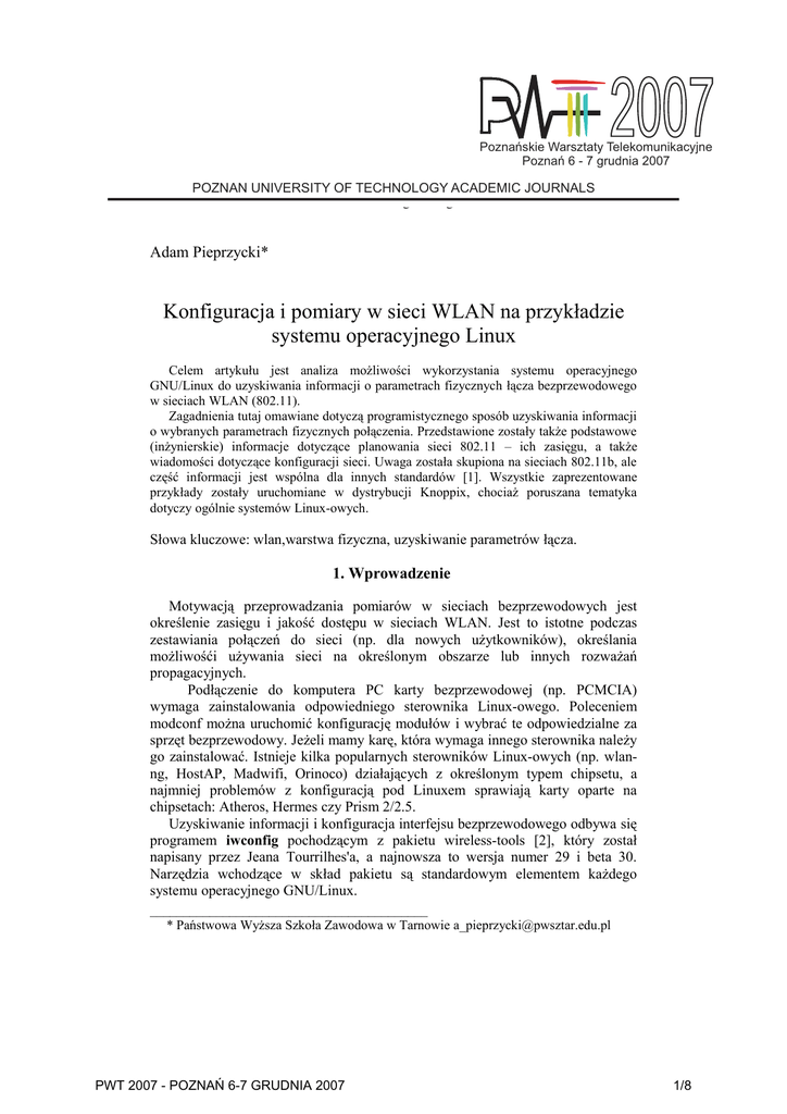 2007 Poznańskie Warsztaty Telekomunikacyjne Poznań 6 - 7 grudnia 2007 P O Z NPOZNAN A N U N IV E R S IT Y OOF F TTECHNOLOGY E C H N O LO G YACADEMIC A C A D E MJOURNALS IC J O U R N A LS UNIVERSITY No 54 Electrical Engineering 2007 Adam Pieprzycki* Konfiguracja i pomiary w sieci WLAN na przykładzie systemu operacyjnego Linux Celem artykułu jest analiza możliwości wykorzystania systemu operacyjnego GNU/Linux do uzyskiwania informacji o parametrach fizycznych łącza bezprzewodowego w sieciach WLAN (802.11). Zagadnienia tutaj omawiane dotyczą programistycznego sposób uzyskiwania informacji o wybranych parametrach fizycznych połączenia. Przedstawione zostały także podstawowe (inżynierskie) informacje dotyczące planowania sieci 802.11 – ich zasięgu, a także wiadomości dotyczące konfiguracji sieci. Uwaga została skupiona na sieciach 802.11b, ale część informacji jest wspólna dla innych standardów [1]. Wszystkie zaprezentowane przykłady zostały uruchomiane w dystrybucji Knoppix, chociaż poruszana tematyka dotyczy ogólnie systemów Linux-owych. Słowa kluczowe: wlan,warstwa fizyczna, uzyskiwanie parametrów łącza. 1. Wprowadzenie Motywacją przeprowadzania pomiarów w sieciach bezprzewodowych jest określenie zasięgu i jakość dostępu w sieciach WLAN. Jest to istotne podczas zestawiania połączeń do sieci (np. dla nowych użytkowników), określania możliwośći używania sieci na określonym obszarze lub innych rozważań propagacyjnych. Podłączenie do komputera PC karty bezprzewodowej (np. PCMCIA) wymaga zainstalowania odpowiedniego sterownika Linux-owego. Poleceniem modconf można uruchomić konfigurację modułów i wybrać te odpowiedzialne za sprzęt bezprzewodowy. Jeżeli mamy karę, która wymaga innego sterownika należy go zainstalować. Istnieje kilka popularnych sterowników Linux-owych (np. wlanng, HostAP, Madwifi, Orinoco) działających z określonym typem chipsetu, a najmniej problemów z konfiguracją pod Linuxem sprawiają karty oparte na chipsetach: Atheros, Hermes czy Prism 2/2.5. Uzyskiwanie informacji i konfiguracja interfejsu bezprzewodowego odbywa się programem iwconfig pochodzącym z pakietu wireless-tools [2], który został napisany przez Jeana Tourrilhes'a, a najnowsza to wersja numer 29 i beta 30. Narzędzia wchodzące w skład pakietu są standardowym elementem każdego systemu operacyjnego GNU/Linux. __________________________________________ * Państwowa Wyższa Szkoła Zawodowa w Tarnowie [email protected] PWT 2007 - POZNAŃ 6-7 GRUDNIA 2007 1/8 Adam Pieprzycki Samo używanie polecenia iwconfig może sprowadzać się do ustawień interfejsu bezprzewodowego, jak i uzyskiwania informacji o parametrach połaczenia. Rysunek 1 Działanie iwconfig – interfejs eth1 Oprócz iwconfig w pakiecie wireless-tools znajdują się programy: iwevent – wyświetlanie komunikatów generowanych przez sterownik (też do zmiany ustawień karty), iwgetid – służące do pobierania adresów i nazw ESSID, iwlist – które umożliwia pobranie dokładnych informacji z wybranego interfejsu( także skanowanie sieci), iwpriv – za jego pomocą można konfigurować prywatne parametry interfejsu i opcjonalnych (prywatnych) parametrów interfejsu, iwspy narzędzie służące do wyszukiwania szczegółów dotyczących sieci. Innym narzędziem służącym do znajdowania sieci bezprzewodowych jest AP Radar. Program umożliwia także łączenie się z wykrytymi punktami dostępowymi (ang. Access Point). 2. KONFIGURACJA SIECI BEZPRZEWODOWEJ Najczęściej, konfiguracja karty bezprzewodowej sprowadza się do wydania odpowidnich poleceń: iwlist wlan0 scanning - dostępność sieci bezprzewodowej ifconfig wlan0 up //gdy tryb Ad hoc to ifconfig wlan0 192.168.1.1 up iwconfig wlan0 essid nazwa_AP _identyfikator SSID iwconfig wlan0 key klucz_szesnastkowo iwconfig wlan0 mode Ad-Hoc //tryb Ad-Hoc, Managed, Master iwpriv wlan0 authmode 2 (1 - open, 2 - shared) ifconfig wlan0 adres_ip netmask maska_podsieci route add default gateway adres_bramy dhclient wlan0 - gdy używany jest serwer DHCP lub wpis serwera dhcp w pliku /etc/resolv.conf PWT 2007 - POZNAŃ 6-7 GRUDNIA 2007 2/8 Konfiguracja i pomiary w sieci WLAN na przykładzie systemu operacyjnego Linux W zależności o typu sterownika (i chipsetu) nazwa interfejsu może być inna np.: eth0 (1), ath0(1), wlan0(1) i inne. W zależności od typu karty i użytego sterownika, to samo polecenie (iwconfig) może generować różne informacje. 3. PARAMETRY ŁĄCZA FIZYCZNEGO WLAN Parametry i bilans łącza bezprzewodowego WLAN są analogiczne innych sposobów komunikacji bezprzewodowej. Z inżynierskiego punktu widzenia, należy tak dobrać parametry urządzeń (zazwyczaj odbiornika i anten), aby przez większość czasu uzyskać wymagany poziom sygnału. Poziom sygnału na wejściu odbiornika z uwzględnieniem marginesu na zaniki [6] (RSL_FM w dBm – ang. Receive Signal Level – Fade Margin) możemy obliczyć jako: RSL_FM [dBm]= poziom sygnał na zaciskach nadajnika [dBm] - starty sygnału w przewodzie i w złączach [dB] + zysk anteny nadawczej [dBi] - starty sygnału (w wolnej przestrzeni)[dB] + zysk anteny odbiorczej [dBi] - starty sygnału w przewodzie i w złączach odbiornika [dB] – margines na zaniki [dB] (1) Wartości podanych parametrów zależą od parametrów technicznych sprzętu, odległości pomiędzy nadajnikiem i odbiornikiem (straty sygnału zgodnie z przyjętym modelem propagacyjnym) oraz z założonymi czy rzeczywistymi zanikami sygnału. Szacunkowo można przyjąć, że w paśmie 2.4 GHz na dystansie 1 km tłumienie wynosi 100.4 dB. Warto też pamiętać, że dwukrotny przyrost odległości pomiędzy nadajnikiem a odbiornikiem powoduje wzrost tłumienia sygnału o 6 dB. Ważnym zagadnieniem, którego nie będziemy tu poruszać, jest wysokość umiejscowienia anten (strefa Fresnela, krzywizna ziemi, przeszkody itp.). Informacje o parametrach połączenia można także bezpośrednio uzyskać ze st