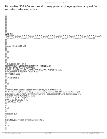 Wojewódzki Szpital Zespolony w Koninie PN poniżej 206.000 euro na dostawę grawitacyjnego systemu czynników wzrostu i sztucznej skóry WSZ-NZ40/2008                                                Â Konin, 12.06.2008 r.    OGŁOSZENIE O PRZETARGU NIEOGRANICZONYM PONIŻEJ 206 000 EURO NA DOSTAWĘ GRAWITACYJNEGO SYSTEMU CZYNNIKÓW WZROSTU I SZTUCZNEJ SKÓRY DLA  POTRZEB WSZ  W KONINIE  1.WojewÃłdzki Szpital Zespolony w Koninie, ul. Szpitalna 45, 62-504 Konin ogłasza przetarg nieograniczony poniżej 206.000 euro na dostawę grawitacyjnego systemu czynnikÃłw wzrostu i sztucznej skÃłry dla potrzeb WSZ w Koninie w asortymencie i ilościach jak niżej CPV: 33.14.17.00-7 ; 33.18.41.00-4.  Pakiet nr 1 Grawitacyjny system czynnikÃłw wzrostu  http://www.szpital-konin.pl Kreator PDF Utworzono 2 March, 2017, 20:11 Wojewódzki Szpital Zespolony w Koninie 1.Grawitacyjny system separacji płytek krwi (czynnikÃłw wzrostu) oraz urządzenie do produkcji autologicznej trombiny  Kompletny zestaw pojedynczy - 10 szt. Kompletny zestaw podwÃłjny - 10 szt. System ma umożliwiać wyprodukowanie koncentratu płytek krwi – preparatu potrzebnego podczas terapii czynnikami wzrostu - zawiesiny o bardzo wysokiej koncentracji płytek krwi. Około 8 razy większe stężenie płytek krwi na µL niż w krwi obwodowej człowieka (stężenie około 1,5 - 2 milionÃłw trombocytÃłw na µL). Każdy zestaw powinien posiadać rÃłżnorodne łączniki i kaniule mieszające oraz specjalne urządzenie do separowania autologicznej trombiny osocza krwi. Instrumenty: wirÃłwka, przeciwwaga, pojemniki na probÃłwki z trombiną.  2.Grawitacyjny system separacji płytek krwi (czynnikÃłw wzrostu) oraz system do produkcji dużego stężenia fibrynogenu (autogenny klej fibrynowy) - 5 szt.  System ma umożliwiać wyprodukowanie koncentratu płytek krwi – preparatu potrzebnego podczas terapii czynnikami wzrostu - zawiesiny o bardzo wysokiej koncentracji płytek krwi. Około 8 razy większe stężenie płytek krwi na µL niż w krwi obwodowej człowieka (stężenie około 1,5 - 2 milionÃłw trombocytÃłw na µL). Każdy zestaw powinien posiadać rÃłżnorodne łączniki i kaniule mieszające oraz specjalne urządzenie do separowania autologicznej trombiny z osocza krwi. Instrumenty: wirÃłwka, przeciwwaga, specjalne pojemniki  3.Grawitacyjny system separacji komÃłrek macierzystych  http://www.szpital-konin.pl Kreator PDF Utworzono 2 March, 2017, 20:11 Wojewódzki Szpital Zespolony w Koninie Zestaw mały - 5 szt. Zestaw duży - 5 szt.     System ma umożliwiać wyprodukowanie koncentratu komÃłrek macierzystych – preparatu potrzebnego podczas terapii szpikiem kostnym - zawiesiny o bardzo wysokiej koncentracji komÃłrek macierzystych. Około 6 razy większe stężenie komÃłrek macierzystych na µL niż w szpiku kostnym człowieka. Instrumenty: wirÃłwka, przeciwwaga, pojemniki na probÃłwki z trombiną  Wykonawca w cenie oferty zapewnia szkolenie oraz wirÃłwkę GPS  Pakiet nr 2 Opatrunek typu sztuczna skÃłra – 20 szt. MateriałÂ typu „sztuczna skÃłra― , ktÃłry jest resorbowalnym opatrunkiem do czasowego pokrywania ubytkÃłw skÃłry ran nie zainfekowanych i/lub świeżo skażonych. Najlepiej w postaci biokompatybilnej folii wchłanialnej wraz z klejem służącym do stabilnego przymocowania do brzegÃłw nie uszkodzonej skÃłry.  2.Wymagany termin realizacji zamÃłwienia: 12 miesięcy od dnia podpisania umowy.  3.Specyfikacja istotnych warunkÃłw zamÃłwienia dostępna jest na stronie internetowej WojewÃłdzkiego Szpitala Zespolonego w Koninie pod adresem: www.szpital-konin.pl. Specyfikację można odebrać rÃłwnież w siedzibie Zamawiającego: Konin, ul. Szpitalna 45, pokÃłj nr 3/33 II piętro lub za zaliczeniem pocztowym od 12.06.2008 r. Cena formularza 20,00 zł, + koszty przesyłki. http://www.szpital-konin.pl Kreator PDF Utworzono 2 March, 2017, 20:11 Wojewódzki Szpital Zespolony w Koninie  4.Zamknięte koperty zawierające oferty należy złożyć w WojewÃłdzkim Szpitalu Zespolonym w Koninie, ul. Szpitalna 45, (Kancelaria, pokÃłj 3/13) w nieprzekraczalnym terminie do dnia 23.06.2008 r., godz. 10:00. Koperty winny być oznakowane: „Oferta w przetargu nieograniczonym poniżej 206 tys. euro na dostawę grawitacyjnego systemu czynnikÃłw wzrostu i sztucznej skÃłry dla potrzeb WSZ w Koninie (WSZ-NZ-40/2008). Nie otwierać przed 23.06.2008 r., godz. 11:00―  5.Pracownikami uprawnionymi do kontaktowania się z oferentami są: - w sprawach formalnych: Beata Klasińska – tel. (0-63) 240-41-33, faks 240-41-34, - w sprawach merytorycznych: lek. med. Jarosław Lubiatowski – Ordynator Oddziału Ortopedii i Traumatologii Narządu Ruchu, tel. (063) 240-43-10 lub 240-43-11.  6.Otwarcie ofert nastąpi w dniu 23.06.2008 r., o godz. 11:00 w siedzibie Zamawiającego: Konin, ul. Szpitalna 45, świetlica, pokÃłj nr 3/8.  7.Zgodnie z art. 22 ust. 1 ustawy z dnia 29.01.2004 r. - Prawo zamÃłwień publicznych (tekst jednolity Dz. U. z 2006 r., Nr 164., poz. 1163 z pÃłźń. zm.) o udzielenie ZamÃłwienia mogą ubiegać się Wykonawcy, ktÃłrzy: a)są uprawnieni do wykonywania określonej działalności lub czynności, jeżeli ustawy nakładają obowiązek posiadania takich uprawnień, b)posiadają niezbędną wiedzę i doświadczenie oraz dysponują potencjałem technicznym i osobami zdolnymi do wykonania zamÃłwienia, c)znajdują się w sytuacji ekonomicznej i finansowej zapewniającej wykonanie zamÃłwienia, d)nie podlegają wykluczeniu z postępowania o udzielenie zamÃłwienia. Ocena spełniania warunkÃłw będzie dokonywana na zasadzie oceny „spełnia― / „nie spełnia― w oparciu o przedłożone oświadczenie o spełnieniu warunkÃłw udziału w postępowaniu http://www.szpital-konin.pl Kreator PDF Utworzono 2 March, 2017, 20:11 Wojewódzki Szpital Zespolony w 