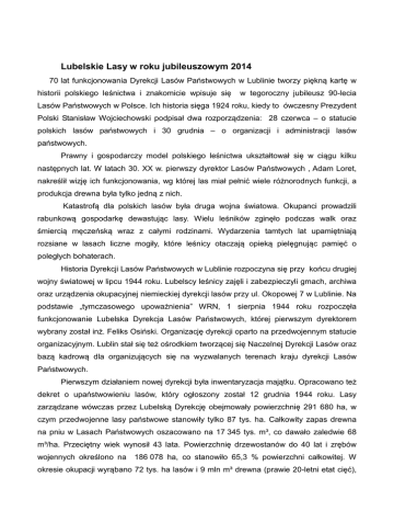 Lubelskie Lasy w roku jubileuszowym 2014 70 lat funkcjonowania Dyrekcji Lasów Państwowych w Lublinie tworzy piękną kartę w historii polskiego leśnictwa i znakomicie wpisuje się w tegoroczny jubileusz 90-lecia Lasów Państwowych w Polsce. Ich historia sięga 1924 roku, kiedy to ówczesny Prezydent Polski Stanisław Wojciechowski podpisał dwa rozporządzenia: 28 czerwca – o statucie polskich lasów państwowych i 30 grudnia – o organizacji i administracji lasów państwowych. Prawny i gospodarczy model polskiego leśnictwa ukształtował się w ciągu kilku następnych lat. W latach 30. XX w. pierwszy dyrektor Lasów Państwowych , Adam Loret, nakreślił wizję ich funkcjonowania, wg której las miał pełnić wiele różnorodnych funkcji, a produkcja drewna była tylko jedną z nich. Katastrofą dla polskich lasów była druga wojna światowa. Okupanci prowadzili rabunkową gospodarkę dewastując lasy. Wielu leśników zginęło podczas walk oraz śmiercią męczeńską wraz z całymi rodzinami. Wydarzenia tamtych lat upamiętniają rozsiane w lasach liczne mogiły, które leśnicy otaczają opieką pielęgnując pamięć o poległych bohaterach. Historia Dyrekcji Lasów Państwowych w Lublinie rozpoczyna się przy końcu drugiej wojny światowej w lipcu 1944 roku. Lubelscy leśnicy zajęli i zabezpieczyli gmach, archiwa oraz urządzenia okupacyjnej niemieckiej dyrekcji lasów przy ul. Okopowej 7 w Lublinie. Na podstawie „tymczasowego upoważnienia” WRN, 1 sierpnia 1944 roku rozpoczęła funkcjonowanie Lubelska Dyrekcja Lasów Państwowych, której pierwszym dyrektorem wybrany został inż. Feliks Osiński. Organizację dyrekcji oparto na przedwojennym statucie organizacyjnym. Lublin stał się też ośrodkiem tworzącej się Naczelnej Dyrekcji Lasów oraz bazą kadrową dla organizujących się na wyzwalanych terenach kraju dyrekcji Lasów Państwowych. Pierwszym działaniem nowej dyrekcji była inwentaryzacja majątku. Opracowano też dekret o upaństwowieniu lasów, który ogłoszony został 12 grudnia 1944 roku. Lasy zarządzane wówczas przez Lubelską Dyrekcję obejmowały powierzchnię 291 680 ha, w czym przedwojenne lasy państwowe stanowiły tylko 87 tys. ha. Całkowity zapas drewna na pniu w Lasach Państwowych oszacowano na 17 345 tys. m³, co dawało zaledwie 68 m³/ha. Przeciętny wiek wynosił 43 lata. Powierzchnię drzewostanów do 40 lat i zrębów wojennych określono na 186 078 ha, co stanowiło 65,3 % powierzchni całkowitej. W okresie okupacji wyrąbano 72 tys. ha lasów i 9 mln m³ drewna (prawie 20-letni etat cięć), zniszczono 310 osad leśnych, szereg budowli i tartaków, zginęło 881 leśników. Lesistość obszaru Lubelszczyzny po wojnie wynosiła zaledwie 16%. W konsekwencji wysiłek pierwszych lat po wojnie skierowano na zalesianie zrębów wojennych, przy dotkliwym braku sadzonek, sprzętu i ludzi. Skutecznie też ograniczono kradzieże drewna. Nie obyło się bez ofiar – zginęło 7 pracowników. Kolejnym wielkim problemem były pożary lasu – tylko w latach 1946-47 spłonęło prawie 3400 ha. Od 1 stycznia 1950 r. podstawą zarządzania lasami była ustawa z 20 grudnia 1949 roku o Państwowym Gospodarstwie Leśnym, która wraz z wydanymi do niej rozporządzeniami była podstawą kolejnych zmian w organizacji gospodarki leśnej kraju. Ukształtowana w procesie tych zmian wielkość powierzchni RDLP w Lublinie, wynosząca 420 tys. ha, obejmująca zasięgiem terytorialnym całe województwo lubelskie, 3 powiaty Podkarpacia i 1 powiat województwa mazowieckiego, przetrwała do chwili obecnej. Położenie i warunki przyrodnicze. Regionalna Dyrekcja Lasów Państwowych w Lublinie jest jedną z 17 dyrekcji w kraju. Leży w południowo - wschodniej części Polski. W jej wchodzi 25 nadleśnictw: Biała Podlaska, Biłgoraj, Chełm, Chotyłów, Gościeradów, Janów Lubelski, Józefów, Krasnystaw, Kraśnik, Lubartów, Międzyrzec, Mircze, Nowa Dęba, Parczew, Puławy, Radzyń Podlaski, Rozwadów, Rudnik, Sarnaki, Sobibór Strzelce, Świdnik, Tomaszów, Włodawa oraz Zwierzyniec. Od wschodu na znacznym odcinku granicą dyrekcji jest granica Polski z Ukrainą i Białorusią na rzece Bug, od zachodu zaś granicę tę wyznacza Wisła z jej najpiękniejszym odcinkiem, jakim jest Małopolski Przełom Wisły. Według regionalizacji fizyczno-geograficznej Polski (J. Kondracki) obszar Regionalnej Dyrekcji Lasów Państwowych w Lublinie obejmuje makroregiony: − w części północnej i północno-zachodniej - Nizinę Południowopodlaską − w części północno–wschodniej i wschodniej – Polesie Zachodnie i Polesie Wołyńskie, − w części środkowej – Wyżynę Lubelską, Wyżynę Wołyńską i niewielki fragment Niziny Środkowomazowieckiej, − w części południowo-wschodniej – Roztocze i niewielki fragment Kotliny Pobuża, − w części południowej i południowo-zachodniej – Kotlinę Sandomierską. Obszar dyrekcji leży w dorzeczu Sanu, Wisły i Bugu. Północna i północno-zachodnia część, leżąca na Nizinie Południowopodlaskiej położona jest na lekko falistej równinie z ostańcowymi pagórkami polodowcowymi. Północno–wschodnią część (Polesie Zachodnie i Wołyńskie) stanowi płaska równina, na której płytko zalegające wody gruntowe powodują występowanie bagien, torfowisk i jezior. Środkową i południowo-wschodnią część obejmuje rozczłonkowana wąwozami i dolinami rzek Wyżyna Lubelska i Wyżyna Wołyńska. Od południa ogranicza je wyżynny wał Roztocza. Tereny na południe od Roztocza są częścią nisko położonej Kotliny Sandomierskiej. Zróżnicowanie gleb na terenie RDLP w Lublinie uwarunkowane jest głównie cechami podłoża. Na północy w obrębie Niziny Południowopodlaskiej występuje mozaika gleb brunatnych właściwych i bielicowych. Duże obszary, szczególnie na wschodzie, zajmują gleby bagienne i pobagienne. Środkowa i południowa, lessowa część obszaru pokryta jest glebami 