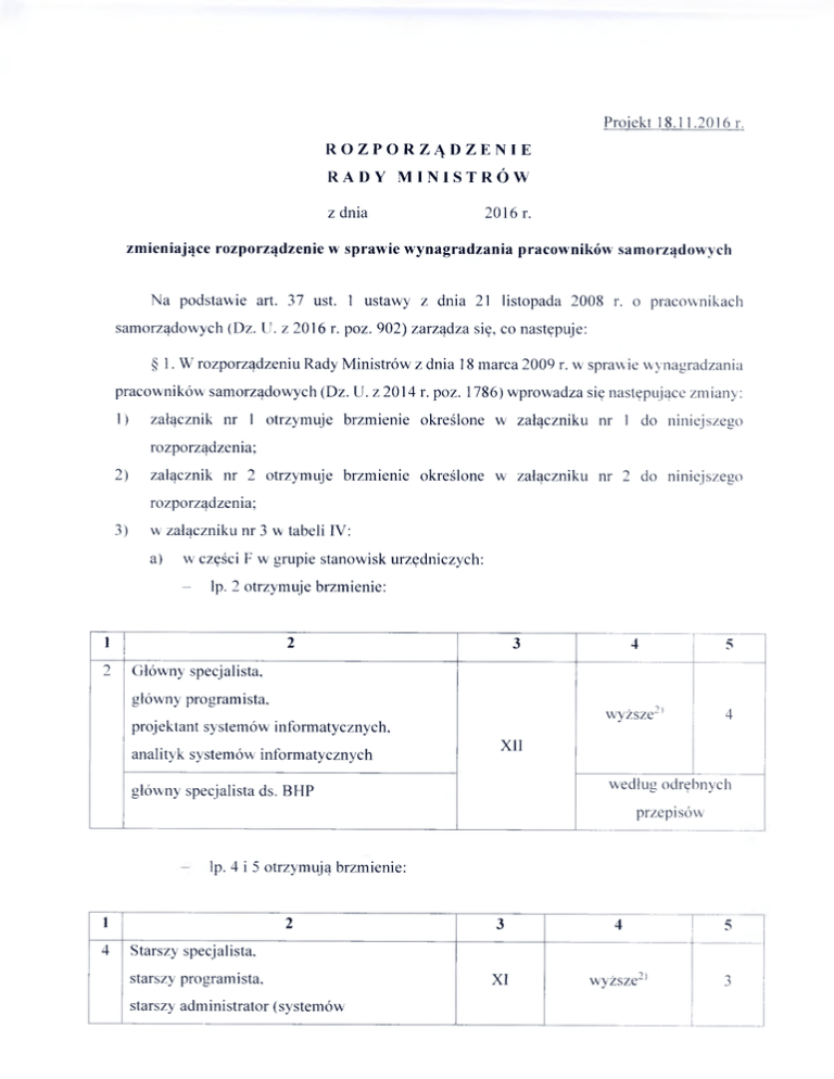Projekt 18.11.2016 r. ROZPORZĄDZENIE RADY MINISTRÓW z dnia 2016 r. zmieniające rozporządzenie w sprawie wynagradzania pracowników samorządowych N a podstaw ie art. 37 ust. 1 ustaw y z dnia 21 listopada 2008 r. o pracow nikach sam orządow ych (Dz. U. z 2016 r. poz. 902) zarządza się, co następuje: § 1. W rozporządzeniu Rady M inistrów z dnia 18 m arca 2009 r. w spraw ie w ynagradzania pracow ników sam orządow ych (Dz. U. z 2014 r. poz. 1786) w prow adza się następujące zm iany: 1) załącznik nr 1 otrzym uje brzm ienie określone w załączniku nr 1 do niniejszego rozporządzenia; 2) załącznik nr 2 otrzym uje brzm ienie określone w załączniku nr 2 do niniejszego rozporządzenia; 3) w załączniku nr 3 w tabeli IV : a) w części F w grupie stanow isk urzędniczych: - lp. 2 otrzym uje brzm ienie: 1 2 2 3 4 5 w yższe21 4 G łów ny specjalista, głów ny program ista, projektant system ów inform atycznych, analityk system ów inform atycznych XII w edług odrę m ych głów ny specjalista ds. BHP przepisó w lp. 4 i 5 otrzym ują brzm ienie: 1 4 2 3 4 5 XI w yższe2) 3 Starszy specjalista, starszy program ista, starszy adm inistrator (system ów -2 - teleinform atycznych, sieci kom puterow ych, baz danych), starszy projektant, starszy inform atyk starszy specjalista ds. BHP w edług odrębnych przepisów starszy geodeta, w yższe geodezyjne 'j J starszy k arto g raf 5 i kartograficzne Podinspektor, program ista, w yższe2* - adm inistrator (system ów teleinform atycznych. sieci kom puterow ych, baz danych), projektant, inform atyk, X średnie3) 3 konsultant w yższe geodezyjne - geodeta. i kartograficzne k arto g raf średnie geodezyjne -> i kartograficzne lp. 11 otrzym uje brzm ienie: 1 1 2 3 4 VIII śre d n ie ’* M łodszy program ista, m łodszy adm inistrator (system ów teleinform atycznych, sieci kom puterow ych, baz danych). m łodszy projektant, m łodszy inform atyk, m łodszy konsultant, m łodszy referent, m łodszy księgow y 5 -3 - b) w części H: w części I w grupie stanow isk urzędniczych: — lp. 1 otrzym uje brzm ienie: 1 1 2 3 4 5 w yższe21 5 G łów ny specjalista, głów ny program ista, projektant system ów inform atycznych, analityk system ów inform atycznych XII w edług odrę :>nych głów ny specjalista ds. BH P przepisó w — lp. 5 otrzym uje brzm ienie: 1 5 2 3 4 5 w yższe2' 5 Starszy specjalista, starszy program ista, starszy adm inistrator (system ów teleinform atycznych, sieci kom puterow ych, baz danych), starszy projektant. X starszy inform atyk. starszy specjalista-laborant, starszy technolog w edług odrę m ych starszy specjalista ds. BHP przepisów ----- ---------------— lp. 9 otrzym uje brzm ienie: 1 9 2 3 4 5 IX w yższe2’ 4 Starszy inspektor, adm inistrator (system ów -4 - teleinform atycznych, sieci kom puterow ych. baz danych), projektant, inform atyk. konsultant, specjalista-laborant, technolog w edług odrębnych starszy inspektor ds. BH P przepisów — po lp. 12 dodaje się lp. 12a w brzm ieniu: 1 12a 2 3 4 5 VII ś re d n ie '’ - M łodszy program ista, m łodszy adm inistrator (system ów teleinform atycznych, sieci kom puterow ych, baz danych), m łodszy inform atyk, m łodszy konsultant w części I w grupie stanow isk pom ocniczych i obsługi lp. 60 otrzym uje brzm ienie: 1 60 2 Sprzątaczka 3 4 5 III podstaw ow e41 - w części III w grupie stanow isk pom ocniczych i obsługi: po lp. 12 dodaje się lp. 12a i 12b w brzm ieniu: 1 2 3 4 5 12a Starszy fizjoterapeuta X IV w yższe2) 5 12b Starszy terapeuta zajęciow y X IV w yższe2) 5 -5 - policealna szkoła odpow iedniej specjalności i tytuł XII zaw odow y lub dyplom w zaw odzie - po lp. 16 dodaje się lp .ló a i 16b w brzm ieniu: 1 16a 16b 2 Fizjoterapeuta Terapeuta zajęciow y 3 4 5 XIII w yższe2’ - X III w yższe2’ policealna szkoła odpow iedniej specjalności i tytuł - XI zaw odow y lub dyplom w zaw odzie — po lp. 20 dodaje się lp. 20a w brzm ieniu: 1 20a 2 Starszy opiekun dzienny 3 XII 4 5 w edług odrębnych przepisów - po lp. 25 dodaje się lp. 25a w brzm ieniu: 1 25a 2 O piekun dzienny — po lp. 31 dodaje się lp. 3 l a w brzm ieniu: 3 XI 4 5 w edług odrębnych przepisów -6 - 1 31 a 2 3 M łodszy opiekun dzienny VII 4 5 w edług odrębnych przepisów w części X X I w grupie stanow isk pom ocniczych i obsługi Ip. 4 i 5 otrzym ują brzm ienie: 1 4 2 3 4 5 Starsza pielęgniarka, XIII starszy ratow nik m edyczny 5 w edług odrębnych przepisów Pielęgniarka, XII ratow nik m edyczny § 2. R ozporządzenie w chodzi w życie z dniem 1 m arca 2017 r. PREZES RADY MINISTRÓW ■ - c " w y pua względem prawnym i redakcyjnym ZASTĘPCA DYREKTORA Departamentu Prawa Pracy ZA STĘPCA BYRF: Departa " (l t -7 - Załączniki do rozporządzenia Rady Ministrów z dnia 2016 r. Załączniki nr 1 TABELA MINIMALNEGO MIESIĘCZNEGO POZIOMU W YNAGRODZENIA ZASADNICZEGO DLA PRACOWNIKÓW SAM ORZĄDOWYCH ZATRUDNIONYCH NA PODSTAWIE UMOW Y O PRACĘ Kategoria Minimalna kwota zaszeregowania w złotych I 1.700 II 1.720 III 1.740 IV 1.760 V 1.780 VI 1.800 VII 1.820 VIII 1.840 IX 1.860 X 1.880 XI 1.900 XII 1.920 XIII 1.940 X IV 1.960 XV 1.980 XVI 2.000 XV II 2.100 X V III 2.200 X IX 2.400 XX 2.600 XXI 2.800 XX II 3.000 .. -8 - Zaląc/nik nr 2 TABELA STAWEK DODATKU FUNKCYJNEGO DLA PRACOWNIKÓW SAM ORZĄDOW YCH ZATRUDNIONYCH NA PODSTAWIE W YBORU I POWOŁANIA Stawka dodatku Maksymalny poziom funkcyjnego dodatku funkcyjnego (kwota w złotych) 1 440 2 660 3 880 4 1100 5 1320 5 1540 7 1760 8 2200 9 2750