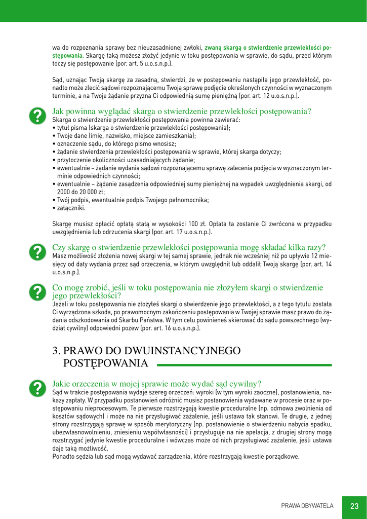 wa do rozpoznania sprawy bez nieuzasadnionej zwłoki, zwaną skargą o stwierdzenie przewlekłości postępowania. Skargę taką możesz złożyć jedynie w toku postępowania w sprawie, do sądu, przed którym toczy się postępowanie (por. art. 5 u.o.s.n.p.). Sąd, uznając Twoją skargę za zasadną, stwierdzi, że w postępowaniu nastąpiła jego przewlekłość, ponadto może zlecić sądowi rozpoznającemu Twoją sprawę podjęcie określonych czynności w wyznaczonym terminie, a na Twoje żądanie przyzna Ci odpowiednią sumę pieniężną (por. art. 12 u.o.s.n.p.). Jak powinna wyglądać skarga o stwierdzenie przewlekłości postępowania? Skarga o stwierdzenie przewlekłości postępowania powinna zawierać: • tytuł pisma (skarga o stwierdzenie przewlekłości postępowania); • Twoje dane (imię, nazwisko, miejsce zamieszkania); • oznaczenie sądu, do którego pismo wnosisz; • żądanie stwierdzenia przewlekłości postępowania w sprawie, której skarga dotyczy; • przytoczenie okoliczności uzasadniających żądanie; • e wentualnie – żądanie wydania sądowi rozpoznającemu sprawę zalecenia podjęcia w wyznaczonym terminie odpowiednich czynności; • e wentualnie – żądanie zasądzenia odpowiedniej sumy pieniężnej na wypadek uwzględnienia skargi, od 2000 do 20 000 zł; • Twój podpis, ewentualnie podpis Twojego pełnomocnika; • załączniki. Skargę musisz opłacić opłatą stałą w wysokości 100 zł. Opłata ta zostanie Ci zwrócona w przypadku uwzględnienia lub odrzucenia skargi (por. art. 17 u.o.s.n.p.). Czy skargę o stwierdzenie przewlekłości postępowania mogę składać kilka razy? Masz możliwość złożenia nowej skargi w tej samej sprawie, jednak nie wcześniej niż po upływie 12 miesięcy od daty wydania przez sąd orzeczenia, w którym uwzględnił lub oddalił Twoją skargę (por. art. 14 u.o.s.n.p.). Co mogę zrobić, jeśli w toku postępowania nie złożyłem skargi o stwierdzenie jego przewlekłości? Jeżeli w toku postępowania nie złożyłeś skargi o stwierdzenie jego przewlekłości, a z tego tytułu została Ci wyrządzona szkoda, po prawomocnym zakończeniu postępowania w Twojej sprawie masz prawo do żądania odszkodowania od Skarbu Państwa. W tym celu powinieneś skierować do sądu powszechnego (wydział cywilny) odpowiedni pozew (por. art. 16 u.o.s.n.p.). 3. PRAWO DO DWUINSTANCYJNEGO POSTĘPOWANIA Jakie orzeczenia w mojej sprawie może wydać sąd cywilny? Sąd w trakcie postępowania wydaje szereg orzeczeń: wyroki (w tym wyroki zaoczne), postanowienia, nakazy zapłaty. W przypadku postanowień odróżnić musisz postanowienia wydawane w procesie oraz w postępowaniu nieprocesowym. Te pierwsze rozstrzygają kwestie proceduralne (np. odmowa zwolnienia od kosztów sądowych) i może na nie przysługiwać zażalenie, jeśli ustawa tak stanowi. Te drugie, z jednej strony rozstrzygają sprawę w sposób merytoryczny (np. postanowienie o stwierdzeniu nabycia spadku, ubezwłasnowolnieniu, zniesieniu współwłasności) i przysługuje na nie apelacja, z drugiej strony mogą rozstrzygać jedynie kwestie proceduralne i wówczas może od nich przysługiwać zażalenie, jeśli ustawa daje taką możliwość. Ponadto sędzia lub sąd mogą wydawać zarządzenia, które rozstrzygają kwestie porządkowe. PRAWA OBYWATELA 23 Jakie najważniejsze środki zaskarżenia mi przysługują? Orzeczenie lub czynność Środek odwoławczy Wyrok apelacja Wyrok zaoczny sprzeciw (pozwany), apelacja (powód) Nakaz zapłaty w postępowaniu nakazowym zarzuty (pozwany), apelacja (powód) Nakaz zapłaty w postępowaniu upominawczym sprzeciw (pozwany), apelacja (powód) Niektóre postanowienia w postępowaniu procesowym zażalenie Postanowienie co do istoty sprawy w postępowaniu nieprocesowym Niektóre postanowienia w postępowaniu nieprocesowym nierozstrzygające sprawy co do istoty apelacja zażalenie Postanowienie wydane przez referendarza sądowego skarga na orzeczenie referendarza Czynność komornika skarga na czynności komornika Zarządzenie przewodniczącego o zwrocie pozwu zażalenie Wstąpienie interwenienta ubocznego opozycja Czy przed złożeniem środka odwoławczego powinienem podjąć jakieś działania? Zanim zdecydujesz się na złożenie apelacji, powinieneś najpierw wystąpić do sądu o sporządzenie uzasadnienia orzeczenia, od którego zamierzasz się odwołać. Wniosek taki musisz złożyć w ciągu tygodnia od dnia ogłoszenia orzeczenia lub, jeżeli w trakcie trwania postępowania byłeś pozbawiony wolności i nie miałeś pełnomocnika (adwokata, radcy prawnego), w ciągu tygodnia od doręczenia Ci sentencji orzeczenia. Wniosek składa się do sądu, który wydał wyrok (por. art. 328 k.p.c.). W przypadku zażalenia również musisz zgłosić odpowiedni wniosek w terminie jednego tygodnia od dnia ogłoszenia postanowienia (por. art. 357 § 1 k.p.c.). Postanowienie wydane na posiedzeniu niejawnym sąd doręczy Ci z urzędu, sporządzając od razu uzasadnienie w wypadku, gdy na to postanowienie przysługuje zażalenie (por. art. 357 § 2 k.p.c.). W jakich wypadkach mogę złożyć zażalenie na postanowienie lub zarządzenie? Co do zasady zażalenie przysługuje Ci na (por. art. 394 k.p.c.): • p ostanowienia sądu kończące postępowanie w sprawie, ale niepowodujące jej merytorycznego rozstrzygnięcia, np. postanowienie odrzucające pozew, postanowienie umarzające postępowanie, postanowienie odrzucające apelację; • inne postanowienia sądu, w stosunku do których prawo przyznaje Ci możliwość zaskarżenia orzeczenia. Lista tych postanowień jest bardzo długa, ale na pewno zostaniesz poinformowany przez sąd o możliwości zaskarżenia określonego postanowienia w drodze zażalenia. Do najważniejszych z tej grupy należą postanowienia, których przedmiotem jest: – odmowa odrzucenia pozwu, przekazanie sprawy sądowi równorzędnemu lub niższemu albo podjęcie postępowania w innym trybie; – odmowa zw