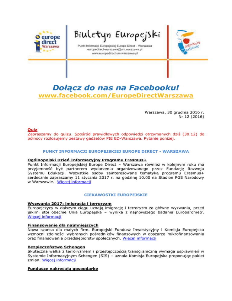 Dołącz do nas na Facebooku! www.facebook.com/EuropeDirectWarszawa Warszawa, 30 grudnia 2016 r. Nr 12 (2016) Quiz Zapraszamy do quizu. Spośród prawidłowych odpowiedzi otrzymanych dziś (30.12) do północy rozlosujemy zestawy gadżetów PIE ED-Warszawa. Pytanie poniżej. PUNKT INFORMACJI EUROPEJSKIEJ EUROPE DIRECT - WARSZAWA Ogólnopolski Dzień Informacyjny Programu Erasmus+ Punkt Informacji Europejskiej Europe Direct – Warszawa również w kolejnym roku ma przyjemność być partnerem wydarzenia organizowanego przez Fundację Rozwoju Systemu Edukacji. Wszystkie osoby zainteresowane tematyką programu Erasmus+ serdecznie zapraszamy 11 stycznia 2017 r. na godzinę 10.00 na Stadion PGE Narodowy w Warszawie. Więcej informacji CIEKAWOSTKI EUROPEJSKIE Wyzwania 2017: imigracja i terroryzm Europejczycy w dalszym ciągu uznają imigrację i terroryzm za główne wyzwania, przed jakimi stoi obecnie Unia Europejska – wynika z najnowszego badania Eurobarometr. Więcej informacji Finansowanie dla najmniejszych Nowa szansa dla małych firm. Europejski Fundusz Inwestycyjny i Komisja Europejska wzmocni zdolności wybranych pośredników finansowych w obszarze mikrofinansowania oraz finansowania przedsiębiorstw społecznych. Więcej informacji Bezpieczeństwo Schengen Skuteczna walka z terroryzmem i przestępczością transgraniczną wymaga usprawnień w Systemie Informacyjnym Schengen (SIS) – uznała Komisja Europejska proponując pakiet zmian. Więcej informacji Fundusze nakręcają gospodarkę Dzięki europejskim funduszom strukturalnym i inwestycyjnym gospodarka realna w Europie wygenerowała już 130 mld euro. Więcej informacji Więcej pracy w Europie Unijne gospodarki tworzą miejsca pracy i rośnie dochód netto gospodarstw domowych. Jednak wiele osób, które pracują, wciąż jest ubogich – mówi komisarz Marianne Thyssen prezentując najnowszy raport "Zatrudnienie i kwestie społeczne w Europie". Więcej informacji Polska i kredyty hipoteczne Polska musi dążyć do pełnego wprowadzenia w życie przepisów UE w sprawie kredytów hipotecznych – upomina Warszawę Komisja Europejska. Więcej informacji Społeczne gwarancje KE uaktualnia przepisy dotyczące koordynacji zabezpieczenia społecznego. Dzięki tym regulacjom w przypadku przeprowadzki do innego państwa członkowskiego nie traci się praw do zabezpieczenia społecznego. Więcej informacji Relokacje i przesiedlenia przyspieszają KE przedstawiła sprawozdanie z postępów z wdrażania ustaleń zawartych w oświadczeniu UE-Turcja oraz w realizacji unijnych programów relokacji i przesiedleń. Więcej informacji Inwestowanie w młodych: Europejski Korpus Solidarności 100 tys. młodych wolontariuszy – tyle do 2020 r. ma liczyć Europejski Korpus Solidarności. Inicjatywa Komisji Europejskiej ma angażować Europejczyków w wieku 1830 lat w projekty pomocowe w sytuacjach nadzwyczajnych na terenie całej wspólnoty. Więcej informacji E-handel już bez blokad Nowe przepisy o VAT od sprzedaży towarów i usług w internecie, prostsze regulacje w przypadku mikroprzedsiębiorstw i start-upów, jednakowe zasady opodatkowania eksiążek, e-gazet i ich drukowanych odpowiedników – to główne zmiany mające ostatecznie "odblokować" europejski e-handel. Więcej informacji Prąd z dotacją Mechanizmy zapewniające dostawy energii elektrycznej nie mogą otwierać furtki dla dotowania wybranych technologii np. paliw kopalnych – ocenia KE w sprawozdaniu z badania sektorowego. Więcej informacji Europejski Fundusz Obrony Komisja Europejska proponuje utworzenie Europejskiego Funduszu Obrony oraz inne działania, aby zwiększyć efektywność wydatków państw członkowskich na stworzenie wspólnych zdolności obronnych. Więcej informacji INFORMACJE O AKTUALNIE TRWAJĄCYCH KONKURSACH PO IR 2.3.2 Bony na innowacje dla MŚP Dofinansowanie przeznaczone jest na realizację projektów obejmujących zakup od wykonawcy usługi polegającej na opracowaniu nowego lub znacząco ulepszonego wyrobu, usługi, technologii produkcji lub nowego projektu wzorniczego. Więcej informacji RPO WM 3.2.2 Modele biznesowe Wsparcie w ramach konkursu skierowane jest do grup przedsiębiorców w zakresie wzrostu ich internacjonalizacji, poprzez udział m.in. w misjach gospodarczych, krajowych i międzynarodowych imprezach targowo-wystawienniczych, czy też w ramach wizyt studyjnych zmierzających do rozszerzania działalności gospodarczej na nowe, zagraniczne rynki i poszukiwania partnerów biznesowych w innych krajach. Więcej informacji „Gotówka na start” Krajowe Stowarzyszenie Wspierania Przedsiębiorczości prowadzi nabór wniosków do projektu „Gotówka na start”, w ramach którego osoby fizyczne mogą skorzystać z pożyczki na preferencyjnych warunkach. Więcej informacji WARSZTATY, KONKURSY, SZKOLENIA Europejskie Wykłady Otwarte Punkt Informacji Europejskiej Europe Direct – Warszawa ma przyjemność zaprosić Państwa do udziału w bezpłatnych Europejskich Wykładach Otwartych dotyczących tematyki europejskiej. Wykłady otwarte mają na celu zwiększenie wiedzy Warszawiaków na temat procesu integracji Polski z Unią Europejską, w tym pozyskiwania środków z jej budżetu. Spotkania odbywają się regularnie o godz. 16.00 w sali konferencyjnej Centrum Przedsiębiorczości Smolna przy ul. Smolnej 4. Jednocześnie przypominamy, że spotkania wymagają wcześniejszej rejestracji pod adresem: [email protected]. CETA w praktyce Umowa handlowa UE z Kanadą nadal wywołuje wątpliwości wśród Europejczyków? Czy polscy rolnicy stracą z powodu CETA? Jakie nowe szanse zyskają mali i średni przedsiębiorcy? Przedstawicielstwo KE w Polsce zaprasza na spotkanie informacyjne. Więcej informacji Wolontariusz Roku – nowy konkurs MEN Uczniowie szkół podstawowych, gimnazjów i szkół ponadgimnazjalnych mogą wziąć udział w konkursie na najaktywniejszych wolontariuszy. Wystarczy przygotować dwuminutowy film! Więcej informacji Konkurs d