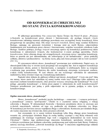 Ks. Stanisław Szczepaniec – Kraków OD KONSEKRACJI CHRZCIELNEJ DO STANU ŻYCIA KONSEKROWANEGO W adhortacji apostolskiej Vita consecrata Ojciec Święty Jan Paweł II pisze: „Wszyscy w Kościele są konsekrowani przez chrzest i bierzmowanie, ale posługa święceń i życie konsekrowane zakładają istnienie odrębnego powołania oraz szczególnej formy konsekracji, która przygotowuje do specjalnej misji. Dla misji wiernych świeckich, którzy mają «szukać Królestwa Bożego, zajmując się sprawami świeckimi i kierując nimi po myśli Bożej», odpowiednim fundamentem jest konsekracja przez chrzest i bierzmowanie, wspólna wszystkim członkom Ludu Bożego. Szafarze pełniący posługę święceń otrzymują oprócz tej konsekracji podstawowej także konsekrację w sakramencie święceń, aby kontynuować w czasie posługę apostolską. Osoby konsekrowane, które obierają drogę rad ewangelicznych, otrzymują nową i specjalną konsekrację, która co prawda nie jest sakramentalna, ale zobowiązuje je do naśladowania – przez praktykę celibatu, ubóstwa i posłuszeństwa – tej formy życia, jaką sam Jezus przyjął i dał za wzór uczniom” (VC 31). W cytowanym tekście słowo „konsekracja” powtarzane jest wielokrotnie. Papież uczy, że chrześcijanin kilka razy w swoim życiu przyjmuje ten szczególny dar. Jest to najpierw konsekracja w sakramencie chrztu, potem w bierzmowaniu, a następnie w celebracjach, które są związane z realizacją jego powołania. Właściwą dla siebie konsekrację otrzymują wyświęceni szafarze, a także osoby konsekrowane. W tym obrazie nie ma wyraźnego odwołania do sakramentu małżeństwa, który również wiąże się z konsekracją małżonków. Papieski tekst skłania do głębszej refleksji nad darem „konsekracji”. Czym ona jest? Jaką ma naturę, skoro może być udzielana tej samej osobie wiele razy? Dlaczego tylko niektórzy są nazywani osobami konsekrowanymi, choć przecież wszyscy otrzymują dar konsekracji? Na czym polega „specjalna konsekracja”, o której pisze papież w odniesieniu do osób konsekrowanych? Niniejsze przedłożenie jest jedną z prób odpowiedzi na te pytania, podjętą w roku życia konsekrowanego. Ogólne znaczenie słowa „konsekracja” Słowo „konsekrować” pochodzi języka łacińskiego – consecrare – i oznacza poświęcać, a „konsekracja” oznacza ”poświęcenie”. Chodzi tu o czynności natury religijnej, o relację człowieka z Bogiem. W dokumentach Kościoła i literaturze przedmiotu słowo to używane jest w dwóch znaczeniach, zależnie od tego czy podkreśla się działanie człowieka czy Boga. W konsekracji jest bowiem zawsze współpraca Boga z człowiekiem. Konieczne jest działanie Boga, ale ważne znaczenie ma również dar, który przynosi człowiek. Jest zrozumiałe, że w sensie ścisłym konsekruje tylko Bóg, dlatego przez konsekrację rozumie się „uświęcające działanie Boga na osobę ludzką, czyniące z niej Bożą własność oraz uzdalniające do wiernego wypełniania Jego woli i osiągnięcia doskonałości na wzór Jezusa Chrystusa”.1 Oprócz tego podstawowego znaczenia konsekracji, spotykamy również inne, w którym wyróżnione jest działanie człowieka, podejmowane pod wpływem łaski Bożej. Niektórzy autorzy używają określenia „człowiek konsekruje się Bogu” w znaczeniu najpełniejszego oddania 1 E. Kasjaniuk, Konsekracja, EK, t. 9, kol. 676. Od konsekracji chrzcielnej do stanu życia konsekrowanego 2 Siedlce, 14 marca 2015 r. się Jemu. Ojciec Święty Jan Paweł II w adhortacji Redemptionis donum pisze: „Odpowiedź na wezwanie miłości odkupieńczej – a jest to również odpowiedź miłości: miłości oddania, która jest duszą konsekracji, czyli poświęcenia osoby. Tę to właśnie miłość – miłość całkowitego i wyłącznego poświęcenia się Bogu – zdaje się pieczętować Izajaszowe słowa: «wykupiłem cię – jesteś moim»”.2 W niniejszym opracowaniu słowo „konsekracja” rozumiane jest w sensie ścisłym jako działanie Boga, który konsekruje człowieka. Jednak, aby taka konsekracja nastąpiła, konieczne jest oddanie się człowieka Bogu. Bóg konsekruje dar, który człowiek przynosi, przede wszystkim zaś uświęca samego człowieka. Dlatego ludzka aktywność w dziele konsekracji jest również bardzo istotna. „Konsekracja” i „misja” Świadomość, że konsekracja jest działaniem Boga, w którym uczestniczy człowiek, nie określa jeszcze charakteru tego działania i nie wskazuje wyraźnie daru, jaki człowiek od Boga otrzymuje. Dlatego konieczna jest dalsza refleksja na ten temat. Odwołujemy się w niej do tekstów Katechizmu Kościoła Katolickiego. Używa on stosunkowo często określenia konsekracja (ponad 100 razy). Odnosi je już do działań Boga w Starym Testamencie: „W Izraelu namaszczano w imię Boże tych, którzy zostali konsekrowani przez Boga do misji zleconej przez Niego. Byli to królowie , kapłani , a w rzadkich przypadkach prorocy Takim namaszczonym miał być przede wszystkim Mesjasz” (KKK 436).3 Konsekracja Jezusa Ważnym elementem refleksji nad konsekracją, jaką ukazuje Katechizm, jest odniesienie jej do Jezusa. W numerze 438 czytamy: „Konsekracja mesjańska Jezusa ukazuje Jego Boskie posłanie. «Na to zresztą wskazuje samo Jego imię, ponieważ w imieniu Chrystusa kryje się Ten, który namaścił, Ten, który został namaszczony, i samo namaszczenie, którym został namaszczony. Tym, który namaścił, jest Ojciec; Tym, który został namaszczony, jest Syn; a został namaszczony w Duchu, który jest Namaszczeniem»” W skrócie prawda ta wyrażona została słowami: „Syn Boży w czasie swego Wcielenia jest konsekrowany na Chrystusa (Mesjasza) przez namaszczenie Duchem Świętym” (KKK 745) . Do prawdy o konsekracji Chrystusa wiele razy powraca Ojciec Święty Jan Paweł II. W adhortacji apostolskiej Pastores dabo vobis pisze: „Konsekrac