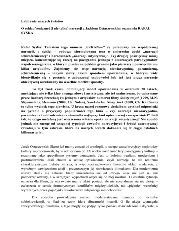 Labirynty naszych światów O schizofrenicznej (i nie tylko) narracji z Jackiem Ostaszewskim rozmawia RAFAŁ SYSKA Rafał Syska: Tematem tego numeru „EKRANów” są przemiany we współczesnej narracji, a ściślej – roboczo sformułowana teza o zmierzchu epoki „narracji schizofrenicznej” i narodzinach „narracji autystycznej”. Tej drugiej poświęcimy mniej miejsca, koncentrując się raczej na pożegnaniu jednego z kluczowych paradygmatów współczesnego kina, o którym pisałeś na polskim gruncie jako pierwszy i poświęciłeś mu kilka artykułów. Zajmiemy się więc narracją niewiarygodną, paranoiczną, schizofreniczną – innymi słowy, takim sposobem opowiadania, w którym widz identyfikuje się z postacią o zaburzonej osobowości lub też jest przez narrację obiektywną oszukiwany na wszelkie możliwe sposoby. To był znak czasu, dominujący model opowiadania w ostatnich 20 latach, anektujący nie tylko kino awangardowe i artystyczne, ale też mainstream, bo opisywane przez Barbarę Szczekałę (w jednym z artykułów numeru) filmy Szósty zmysł (1999, M.N. Shyamalan), Memento (2000, Ch. Nolan), Synekdocha, Nowy Jork (2008, Ch. Kaufman) to tylko wycinek tego zjawiska. U kresu naszej rozmowy chciałbym uzyskać odpowiedź na pytanie o przyczyny popularności tego kina – czy narracja niewiarygodna, paranoiczna i schizofreniczna stanowiła najlepszy kod opisu naszej rzeczywistości? Jeśli tak, to czego metaforą jest wieszczona właśnie epoka narracji autystycznej? Nie sposób jednak nie zacząć od wstępnej typologii chwytów narracyjnych i źródeł autentycznej rewolucji w tym zakresie, która na naszych oczach dokonała się w ciągu ostatnich kilkunastu lat. Jacek Ostaszewski: Skoro już mamy zacząć od typologii, to swego czasu brytyjscy socjolodzy kultury zaproponowali, by w odniesieniu do XX wieku rozróżniać trzy paradygmaty kultury – rozumiane jako specyficzne systemy oznaczania. Jest to kolejno: realizm, modernizm i postmodernizm. Jeśli chodzi o sztukę opowiadania, czyli narrację, to dla realizmu charakterystyczna byłaby intryga, a więc uporządkowany linearnie układ wydarzeń, z wyraźnym zawiązaniem akcji i przynoszącym jej rozwiązanie klimaksem. Dla modernizmu istotny stałby się bohater, który uniezależnia się od intrygi, więc nie jest jej już podporządkowany, a w skrajnych wypadkach wręcz się od niej uwalnia. Ta ostatnia sytuacja oznacza dla filmu, że wprawdzie mamy jakieś postaci, ale nic specjalnego się nie dzieje – zwłaszcza w sensie dramatycznych konfliktów międzyludzkich, tak „pięknie” wcześniej wyrażanych przez pojedynki rewolwerowe lub pościgi samochodowe. Dla sposobu prowadzenia narracji modernistycznej oznacza to technikę subiektywizacji, w ślad za czym idzie alinearność historii. O ile akcja wymagała zdecydowanego działania, a tego mogły się podjąć tylko postaci doświadczone i dojrzałe, o tyle w opowiadaniach modernistycznych, w konsekwencji braku akcji, pojawia się brak zdecydowania. Tematem stają się wątpliwości i rozterki bohatera, a celem, do którego co najwyżej zmierza postać, jest osiągnięcie dojrzałości i pogodzenie z samym sobą. Dodać tu jeszcze trzeba, że w duchu estetyki modernistycznej nie należy liczyć na łatwe rozwiązania, nie mówiąc już o tym, że znakiem firmowym takiej narracji, którą papież narratologii filmoznawczej – David Bordwell – ochrzcił mianem narracji kina artystycznego, jest brak rozwiązania. Symptomatyczny byłby tutaj finał 400 batów (1959, F. Truffaut). Idąc tym tropem, można powiedzieć, że filmowy postmodernizm (czyli trzeci paradygmat narracyjny) przejawia się w opowiadaniach, w których nie tylko występują nieprzewidziane wypadki, lecz wręcz króluje przypadkowość. Co jednak ważniejsze, kwestionowana jest nie tyle akcja, bo ta powraca na zasadzie bezpiecznej iluzji, ile bohater, którego tożsamość się rozsypuje, a wraz z nią świat przedstawiony, będący albo jedynie czyjąś symulacją, albo urojeniem samego bohatera-narratora jak w Podziemnym kręgu (1999, D. Fincher). W ten sposób dochodzimy do tego, co nazwałeś narracją schizofreniczną. Ja wolę określenie Thomasa Elsaessera: „patologie produktywne”, a więc ten rodzaj opowiadań, w których punkt widzenia na świat przedstawiony jest powiązany z osobą cierpiącą na schizofrenię – jak we wspomnianym Podziemnym kręgu, Tożsamości (2003, J. Mangold) lub Palimpseście (2006, K. Niewolski), albo na amnezję – jak w Memento i Mechaniku (2004, B. Anderson), lub też na paranoję. Mamy w nich do czynienia z czymś, co Artur Sandauer w nieco innym kontekście nazwał „poetyką negatywną”. Przesłanie filmu sprowadzałoby się do stwierdzenia „to nie to” i „to nie tak” – pierwsze kwestionowałoby tożsamość, a na pewno jej koherencję, drugie podważałoby samo jej istnienie, negując odniesienie do jakiegoś realnego świata. Dobrą manifestacją jest film Bryana Singera Podejrzani (1995). Generalnie można powiedzieć, że filmy są może nie tyle nihilistyczne, ile manifestują zwątpienie w możliwość poznania, jakiegokolwiek… – Wydaje się, że tak jak nurt nowofalowy uległ w pewnym momencie wyczerpaniu, tak obecnie filmy oparte na niewiarygodności narratora, czyli – jak mówisz – „produktywnych patologiach”, wykazują tendencję schyłkową. Czyżby znowu powrót do bardziej uporządkowanych wzorców opowiadania? Swoista kontrrewolucja? – Wydaje mi się, że po pierwsze trudno o precyzyjną diagnozę w tak krótkiej perspektywie czasowej, a po drugie mam coraz głębsze przekonanie, iż formy narracji są o wiele bardziej zróżnicowane, niż zdaje się to wynikać z różnych prób systematyzacji. Model narracji klasycznej nadal zdaje się dominować ilościowo, ale nie jest on już tak monolityczny i komunikatywny jak w kinie hollywoodzkim. Ono zresztą też nie było do końca ani monolityczn