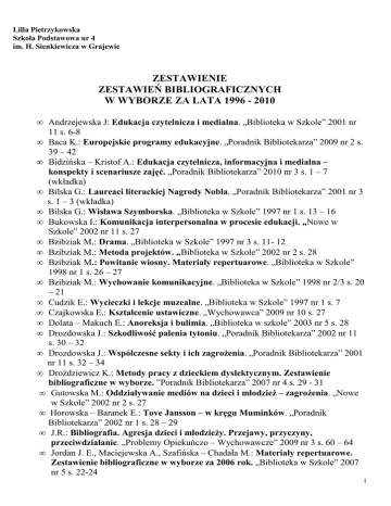 Lilla Pietrzykowska Szkoła Podstawowa nr 4 im. H. Sienkiewicza w Grajewie ZESTAWIENIE ZESTAWIEŃ BIBLIOGRAFICZNYCH W WYBORZE ZA LATA 1996 - 2010 • Andrzejewska J: Edukacja czytelnicza i medialna. „Biblioteka w Szkole” 2001 nr 11 s. 6-8 • Baca K.: Europejskie programy edukacyjne. „Poradnik Bibliotekarza” 2009 nr 2 s. 39 – 42 • Bidzińska – Kristof A.: Edukacja czytelnicza, informacyjna i medialna – konspekty i scenariusze zajęć. „Poradnik Bibliotekarza” 2010 nr 3 s. 1 – 7 (wkładka) • Bilska G.: Laureaci literackiej Nagrody Nobla. „Poradnik Bibliotekarza” 2001 nr 3 s. 1 – 3 (wkładka) • Bilska G.: Wisława Szymborska. „Biblioteka w Szkole” 1997 nr 1 s. 13 – 16 • Bukowska I.: Komunikacja interpersonalna w procesie edukacji. „Nowe w Szkole” 2002 nr 11 s. 27 • Bzibziak M.: Drama. „Biblioteka w Szkole” 1997 nr 3 s. 11- 12 • Bzibziak M.: Metoda projektów. „Biblioteka w Szkole” 2002 nr 2 s. 28 • Bzibziak M.: Powitanie wiosny. Materiały repertuarowe. „Biblioteka w Szkole” 1998 nr 1 s. 26 – 27 • Bzibziak M.: Wychowanie komunikacyjne. „Biblioteka w Szkole” 1998 nr 2/3 s. 20 – 21 • Cudzik E.: Wycieczki i lekcje muzealne. „Biblioteka w Szkole” 1997 nr 1 s. 7 • Czajkowska E.: Kształcenie ustawiczne. „Wychowawca” 2009 nr 10 s. 27 • Dolata – Makuch E.: Anoreksja i bulimia. „Biblioteka w szkole” 2003 nr 5 s. 28 • Drozdowska J.: Szkodliwość palenia tytoniu. „Poradnik Bibliotekarza” 2002 nr 11 s. 30 – 32 • Drozdowska J.: Współczesne sekty i ich zagroŜenia. „Poradnik Bibliotekarza” 2001 nr 11 s. 32 – 34 • Droździewicz K.: Metody pracy z dzieckiem dyslektycznym. Zestawienie bibliograficzne w wyborze. ”Poradnik Bibliotekarza” 2007 nr 4 s. 29 - 31 • Gutowska M.: Oddziaływanie mediów na dzieci i młodzieŜ – zagroŜenia. „Nowe w Szkole” 2002 nr 2 s. 27 • Horowska – Baranek E.: Tove Jansson – w kręgu Muminków. „Poradnik Bibliotekarza” 2002 nr 1 s. 28 – 29 • J.R.: Bibliografia. Agresja dzieci i młodzieŜy. Przejawy, przyczyny, przeciwdziałanie. „Problemy Opiekuńczo – Wychowawcze” 2009 nr 3 s. 60 – 64 • Jordan J. E., Maciejewska A., Szafińska – Chadała M.: Materiały repertuarowe. Zestawienie bibliograficzne w wyborze za 2006 rok. „Biblioteka w Szkole” 2007 nr 5 s. 22-24 1 • Kilijan M.: Przemoc w rodzinie. „Nowa Szkoła” 2000 nr 4 s. 56 – 57 • Klimaszewska A.: Bibliografia i recenzje. Przegląd literatury dotyczącej kształcenia polonistyczno -językowego dzieci w młodszym wieku szkolnym. ,,Nauczanie Początkowe” 2003/2004 nr 4 s. 102 – 108 • Klimaszewska A.: Przegląd literatury dotyczącej problematyki europejskiej w nauczaniu dzieci i młodzieŜy. „Nauczanie Początkowe” 2004 /2005 nr 1 s. 102 – 104 • Klimaszewska A.: Przegląd literatury dotyczącej rozwoju dziecka na tle środowiska społecznego i przyrodniczego. „Nauczanie Początkowe” 2005/2006 nr 4 s. 95-104 • Klimaszewska A.: Przegląd literatury na temat aktywności fizycznej dzieci i jej wpływu na ich wszechstronny rozwój. ”Nauczanie Początkowe” 2006/2007 nr 4 s. 99-104 • Klimaszewska A.: Zestawienie bibliograficzne obejmujące wybrane propozycje dotyczące innowacji pedagogicznej we współczesnej szkole. „Nauczanie Początkowe” 2003/2004 nr 2 s. 98 – 105 • Klimaszewska A., Rogozińska K.: Wybrana literatura dotycząca wpływu sztuki na rozwój osobowości uczniów w młodszym wieku szkolnym. ”Nauczanie Początkowe” 2004/2005 nr 3 s. 102- 108 • Kowalczykówna J.: Był człowiekiem Ŝyczliwym ludziom i światu. „Biblioteka w Szkole” 1998 nr 6 s. 29 - 30 • Kowalczykówna J.: Janusz Korczak – 1878 - 1942. „Biblioteka w Szkole” 1997 nr 6 s. 11 – 13 • Kowalczykówna J.: On był pierwszy - Stanisław Jachowicz. „Biblioteka w Szkole” 1996 nr 2 s. 16 – 17 • Kozik B.: Mazurek Dąbrowskiego i jego twórca. „Biblioteka w Szkole” 1997 nr 6 s. 8 • Kozłowska D.: Poradniki i programy profilaktyczne. „Biblioteka w Szkole” 2003 nr 4 s. 28 • Loch B.: Dom rodzinny. „Wychowawca” 2009 nr 12 s. 29 • Loch B.: Relacje rówieśnicze. „Wychowawca” 2010 nr 10 s. 29 • Lubieniecka – Siadaczka M.: Marketing w bibliotece. Zestawienie bibliograficzne w wyborze za lata 1997 – 2008. „Biblioteka w Szkole” 2008 nr 10 s. 30 – 31 • Łojek A.: Dialog jako forma kontaktu interpersonalnego. „Nauczanie Początkowe” 2009/2010 nr 1 s. 104 – 106 • Łojek A.: Grupa rówieśnicza jako obszar nabywania doświadczeń społecznych (Biografia w wyborze). „Nauczanie Początkowe” 2007/2008 nr 106 – 108 • Łojek A.: Literatura dziecięca w edukacji wczesnoszkolnej. Bibliografia w wyborze za lata 2000-2006. „Nauczanie Początkowe” 2006/2007 nr 2 s. 99 - 102 • Łojek A.: Przegląd literatury na temat współczesnej edukacji matematycznej. „Nauczanie Początkowe” 2007/2008 nr 4 s. 89 - 92 • Łojek A.: Rozwijanie wraŜliwości muzycznej dzieci w młodszym wieku szkolnym. „Nauczanie Początkowe” 2008/2009 nr 4 s. 95 - 99 2 • Łojek A.: Rozwój fizyczny i zdrowie dziecka a problemy edukacji (wybór bibliografii). „Nauczanie Początkowe” 2010/2011 nr 1 s. 104 – 109 • Łojek A.: Stymulowanie rozwoju ucznia zdolnego w klasach I – III (bibliografia w wyborze). „Nauczanie Początkowe” 2009/2010 nr 3 s.101 – 104 • Łojek A.: Wycieczka formą integrującą róŜne rodzaje edukacji. „Nauczanie Początkowe”2009/2010 nr 4 s. 101 – 103 • Maciejewska A.: Materiały repertuarowe – zestawienie bibliograficzne w wyborze. „Biblioteka w Szkole” 2004 nr 12 s. 24 – 25 • Materiały repertuarowe zestawienie bibliograficzne w wyborze. „Biblioteka w Szkole” 2002 nr 11 s. 1 –19 • Materiały repertuarowe. Zestawienie bibliograficzne w wyborze za rok 2007. „Biblioteka w Szkole” 2008 nr 5 s. 28 – 30 • Matuszczak J.: Zawód bibliotekarza dziś i jutro: wizerunek i e