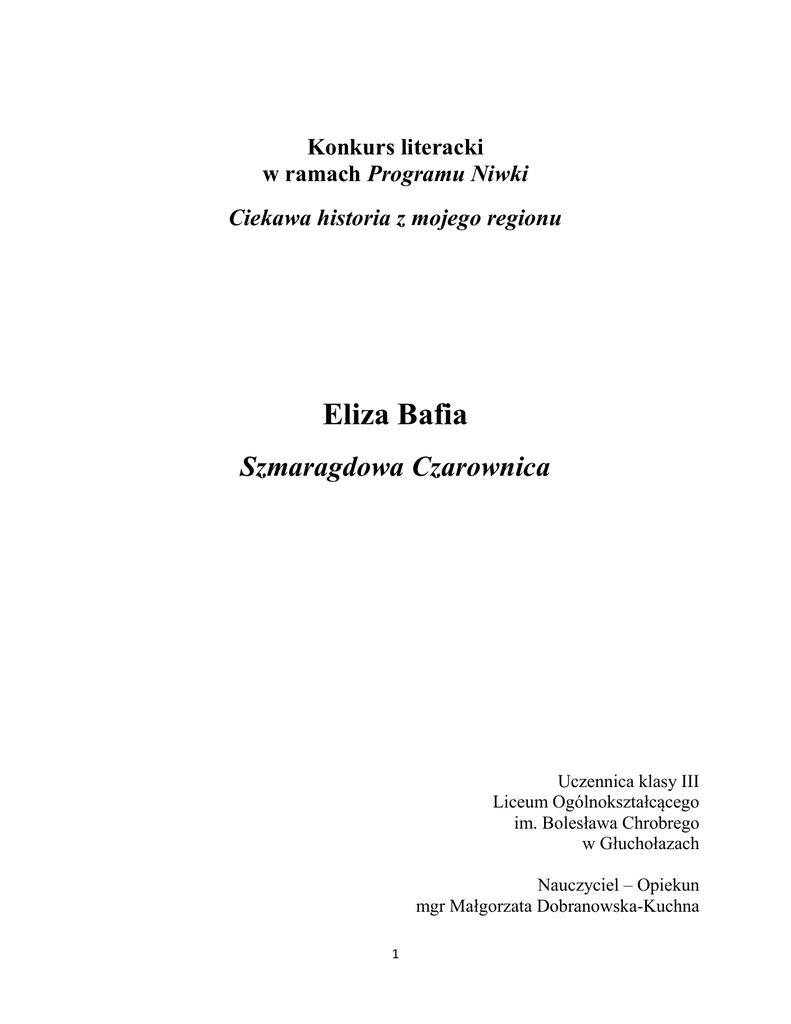 Konkurs literacki w ramach Programu Niwki Ciekawa historia z mojego regionu Eliza Bafia Szmaragdowa Czarownica Uczennica klasy III Liceum Ogólnokształcącego im. Bolesława Chrobrego w Głuchołazach Nauczyciel – Opiekun mgr Małgorzata Dobranowska-Kuchna 1 Szmaragdowa Czarownica Mało kto cokolwiek wie o malowniczej miejscowości Głuchołazy, położonej u podnóża Gór Opawskich. Jest to bowiem niewielkie miasteczko, które niczym nie wyróżnia się spośród setek innych w całej Polsce. Tymczasem wiele miejsc na Ziemi, nawet najbardziej niepozornych, kryje tajemnice. Głuchołazy mogą pochwalić się między innymi małą altanką na Górce Szubienicznej, znaną przez miejscowych raczej jako Grzybek lub Górka Papiernicza. Tylko nieliczni spacerowicze wiedzą, że ta malownicza okolica w średniowieczu była miejscem okrutnych kaźni i rzezi. Mieściła się tam bowiem szubienica, która służyła do karania grzeszników i winowajców za popełnione zbrodnie. Szczególnie często skazywane były za uprawianie nielegalnych praktyk czarownice i wiedźmy. Według podań i legend ciała skazańców nie były od razu ściągane, czasem pozostawały na szubienicy nawet kilka lat! Miało to być przestrogą dla przechodzących tamtą drogą mieszkańców miasta. Po dziś dzień przekazywane z ust do ust wciąż krążą historie związane z głuchołaskimi egzekucjami. Kto wie, może jeszcze nie wszystkie tajemnice zostały wyjaśnione... Młody, energiczny Jakub wychodził ze szkoły przepełniony szczęściem. Nareszcie upragnione wakacje! Świetne wyniki w nauce i wręcz doskonale zdany egzamin maturalny - nie mógł martwić. Jako najlepszy absolwent, wybitny sportowiec i przesympatyczny kolega, uwielbiany był przez wszystkich. Znajomi i nauczyciele wróżyli mu świetlaną przyszłość, jednak on sam, póki co, nie miał ochoty o tym myśleć. Nastał bowiem czas, na który czekał z niecierpliwością - najdłuższe, najpiękniejsze w jego życiu wakacje. Skreślał poszczególne dni w kalendarzu już właściwie od Świąt Bożego Narodzenia. Nie martwiła go matura - wiedział, że jest szalenie zdolny, podszedł do sprawy bez paniki. Systematycznie uczył się z lekcji na lekcję i poświęcał trochę więcej czasu na zdobywanie wiedzy niż w poprzednich latach. W tej chwili spoczywające na dnie torby świadectwo, które z pewnością było powodem do dumy, miało już mniejsze znaczenie. Oprócz satysfakcji czuł ogromną ulgę. Teraz, przez kilka długich i ciepłych miesięcy będzie mógł zająć się swoimi prawdziwymi zainteresowaniami, mianowicie fotografią, czytaniem książek, jazdą na rowerze. Uwielbiał uwieczniać piękne krajobrazy swojego rodzinnego miasta skąpane w czerwcowym słońcu. Najchętniej już dziś chwyciłby aparat i uchwycił na fotografii ten piękny dzień. Miał jednak do wypełnienia jeszcze jeden obowiązek - jego koledzy i koleżanki z klasy urządzali pożegnalną imprezę, na której po prostu nie wypadało się nie pojawić. W głębi duszy darzył ich wielkim sentymentem, spędził z nimi kilka naprawdę wspaniałych momentów swojego życia. Był świadom, iż w przyszłości mogą go spotkać złe chwile, a wtedy na pewno miło wspominać będzie szkolne lata oraz kolegów, którzy często nie szczędzili mu życzliwości i dobrego serca. Następnego dnia postanowił jak najszybciej zrealizować plan. W swoim malutkim pokoiku na poddaszu odszukał czyste ubrania, aparat, statyw i pospiesznie spakował cały potrzebny sprzęt do plecaka, który od wczoraj przestał służyć mu do transportowania książek i zeszytów. Zbiegł po schodach, błyskawicznie chwycił, leżącego w kuchni, pokrytego brązowymi plamami banana i opuścił dom. Mama, chociaż nie pochwalała jego nawyków żywieniowych i ciągłego braku czasu, była niezmiernie dumna ze swojego syna. Wiele razy słyszała pochlebne uwagi na jego temat ze strony innych rodziców oraz koleżanek z pracy. Takie spostrzeżenia z pewnością były spełnieniem marzeń każdej matki. Już za progiem chłopiec poczuł na skórze powiew chłodnego wiatru. Ponieważ było jeszcze wcześnie, źdźbła trawy pokrywała poranna rosa. Kuba był przeszczęśliwy. Teraz naprawdę mógł napawać się wakacyjnym słońcem. Wsiadł na swój ukochany rower i ruszył 2 przed siebie. Cel był jeden sesja fotograficzna w plenerze na szczycie uroczej Górki Papierniczej. Głuchołazy w centrum nie były zbyt urodziwym miastem. Stare, nieremontowane budynki, szare ulice i ludzie smętnie, snujący się bez konkretnego celu, nie napawały optymizmem. Na przedmieściach, krajobraz zmieniał się nie do poznania. Przepiękne góry i łąki szczególnie o tej porze roku sprawiały, że człowiek nie mógł powstrzymać się od nieustannego patrzenia w dal na dzieła Matki Natury. To właśnie tę część swojej małej ojczyzny chłopak kochał najbardziej. Rozłożył na wilgotnej jeszcze trawie gruby koc i potrzebny sprzęt. Wybrał idealne miejsce do fotografowania. Słońce znajdowało się w doskonałym położeniu. Rozpoczął rytuał, który z minuty na minutę wywoływał w nim coraz większe podniecenie. Takie uczucie towarzyszyło chłopakowi zawsze, gdy chwytał do ręki aparat. Nie lubił fotografować ludzi. Ci zawsze postępowali zbyt schematycznie, sztuczne pozowanie doprowadzało Kubę do szału i odbierało przyjemność robienia zdjęć. Natura zaś żyła własnym życiem, wiatr delikatnie uginał giętkie korony drzew, chmury chowały w cień część lasu, tworząc trudne do opisania, wręcz nadprzyrodzone zjawisko. Uwiecznienie każdej sekundy funkcjonowania przyrody sprawiało, że nie dało się oderwać oka od aparatu. Wtem na skraju lasu chłopiec ujrzał piękną, młodziutką sarenkę, która samotnie wybrała się w poszukiwaniu pożywienia. Doszedł do wniosku, że takiej okazji nie można puścić płazem, ruszył więc w kierunku lasu. Powolutku, na palcach prze