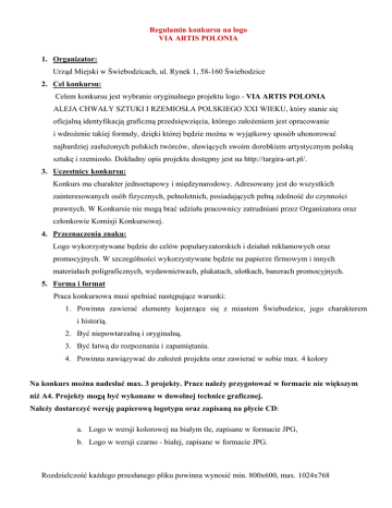 Regulamin konkursu na logo VIA ARTIS POLONIA 1. Organizator: Urząd Miejski w Świebodzicach, ul. Rynek 1, 58-160 Świebodzice 2. Cel konkursu: Celem konkursu jest wybranie oryginalnego projektu logo - VIA ARTIS POLONIA ALEJA CHWAŁY SZTUKI I RZEMIOSŁA POLSKIEGO XXI WIEKU, który stanie się oficjalną identyfikacją graficzną przedsięwzięcia, którego założeniem jest opracowanie i wdrożenie takiej formuły, dzięki której będzie można w wyjątkowy sposób uhonorować najbardziej zasłużonych polskich twórców, sławiących swoim dorobkiem artystycznym polską sztukę i rzemiosło. Dokładny opis projektu dostępny jest na http://targira-art.pl/. 3. Uczestnicy konkursu: Konkurs ma charakter jednoetapowy i międzynarodowy. Adresowany jest do wszystkich zainteresowanych osób fizycznych, pełnoletnich, posiadających pełną zdolność do czynności prawnych. W Konkursie nie mogą brać udziału pracownicy zatrudniani przez Organizatora oraz członkowie Komisji Konkursowej. 4. Przeznaczenia znaku: Logo wykorzystywane będzie do celów popularyzatorskich i działań reklamowych oraz promocyjnych. W szczególności wykorzystywane będzie na papierze firmowym i innych materiałach poligraficznych, wydawnictwach, plakatach, ulotkach, banerach promocyjnych. 5. Forma i format Praca konkursowa musi spełniać następujące warunki: 1. Powinna zawierać elementy kojarzące się z miastem Świebodzice, jego charakterem i historią. 2. Być niepowtarzalną i oryginalną. 3. Być łatwą do rozpoznania i zapamiętania. 4. Powinna nawiązywać do założeń projektu oraz zawierać w sobie max. 4 kolory Na konkurs można nadesłać max. 3 projekty. Prace należy przygotować w formacie nie większym niż A4. Projekty mogą być wykonane w dowolnej technice graficznej. Należy dostarczyć wersję papierową logotypu oraz zapisaną na płycie CD: a. Logo w wersji kolorowej na białym tle, zapisane w formacie JPG, b. Logo w wersji czarno - białej, zapisane w formacie JPG. Rozdzielczość każdego przesłanego pliku powinna wynosić min. 800x600, max. 1024x768 Nadesłane lub dostarczone na konkurs projekty powinny znajdować się w kopertach z napisem: "Konkurs na Logo VIA ARTIS POLONIA”. Projekty należy dostarczyć osobiście organizatorowi lub nadesłać pocztą na adres: Urząd Miejski w Świebodzicach, ul. Rynek 1, 58-160 Świebodzice, do dnia 30.09.2016 r. Decyduje data stempla pocztowego lub data przyjęcia przez adresata. UWAGA: projekty przesłane po tym terminie nie będą rozpatrywane przez jury konkursu. Organizator konkursu nie ponosi odpowiedzialności za ewentualne zaginięcie lub uszkodzenie projektu powstałe w czasie przesyłki. W kopercie należy umieścić także następujące informacje o uczestniku konkursu: a. Imię i nazwisko uczestnika konkursu, b. Adres, telefon, e-mail, c. Oświadczenie autora, że projekt jest jego osobistym dziełem oraz, że prawa autorskie do projektu nie są niczym ograniczone i nie naruszają praw osób trzecich. (załącznik nr 1), d. Zgodę na przetwarzanie i publikację danych osobowych. (załącznik nr 2). 6. Kryteria oceny prac Komisja oceni prace według następujących kryteriów: 1. Kryterium kreatywności i estetyki - logo powinno cechować oryginalność i innowacyjność, rozumiana jako walor wyjątkowości i niepowtarzalności koncepcji graficznej, która wzbudza ciekawość oraz zainteresowanie. logo powinno wyróżniać się kreatywnością w zakresie idei, znaczenia i symboliki którą wykorzystuje. 2. Kryterium przejrzystości przekazu - logo ma służyć identyfikacji wizualnej projektu. 3. Kryterium funkcjonalności - logo musi funkcjonować w wersji kolorowej oraz czarno – białej (pozytyw, negatyw) monochromatycznej. Logo musi być łatwo skalowane pod kątem wykorzystania go w różnych typach mediów, na różnych nośnikach informacyjno - promocyjnych, w tym: papierze firmowym, broszurach, prezentacjach, stronach internetowych, filmach promocyjnych oraz reklamach. 7. Rozstrzygnięcie konkursu Rozstrzygnięcie konkursu odbędzie się do 15.11.2016 r.Zwycięzca konkursu przenosi nieodpłatnie na organizatora konkursu autorskie prawa majątkowe związane z przedłożoną pracą konkursową w zakresie utrwalania, zwielokrotniania określoną techniką, wprowadzania do obrotu, wprowadzania do pamięci komputera, publicznego wykonania albo publicznego odtwarzania, wystawiania, wyświetlania i prezentowania w internecie pracy konkursowej. Laureat złoży pisemne oświadczenie o posiadaniu wszystkich praw autorskich do przedstawionego projektu nieobciążone prawami osób trzecich. 8. Nagroda Zwycięzca Konkursu otrzyma nagrodę w postaci aparatu fotograficznego o wartości 500 zł (słownie: pięćset złotych). Informacje na temat konkursu można uzyskać w Urzędzie Miejskim w Świebodzicach, Wydział Promocji, Informacji i Współpracy Zagranicznej, ul. Świdnicka 7, pok. nr 3, tel. 74 666 95 71, e-mail: [email protected]. OŚWIADCZENIE (załącznik numer 1) 1. Oświadczam, że jestem autorem pracy nadesłanej na konkurs na logo VIA ARTIS POLONIA oraz, że nie narusza ona jakichkolwiek praw osób trzecich, ani obowiązujących przepisów prawa. 2. W przypadku uzyskania nagrody wyrażam zgodę na przeniesienie praw autorskich do pracy zgłoszonej na konkurs na Logo Stowarzyszenia„Zielony Pierścień Tarnowa” na Stowarzyszenie. ………………………………………. Imię i nazwisko ……………………………………….. podpis OŚWIADCZENIE (Załącznik numer 2) 1.Wyrażam zgodę na przetwarzanie moich danych osobowych zgodnie z ustawą z dnia 29.08.1997 r. o ochronie danych osobowych (tekst jedn. Dz. U. z 2002 r., Nr 101, poz. 926 z późn. zm.) przez organizatora konkursu na logo Stowarzyszenia „Zielony Pierścień Tarnowa” dla celów związanych z przeprowadzeniem i rozstrzygnięciem konkursu zgodnie z regulaminem, o którym mowa powyżej, w tym na ich opublikowanie w Internecie. ……………