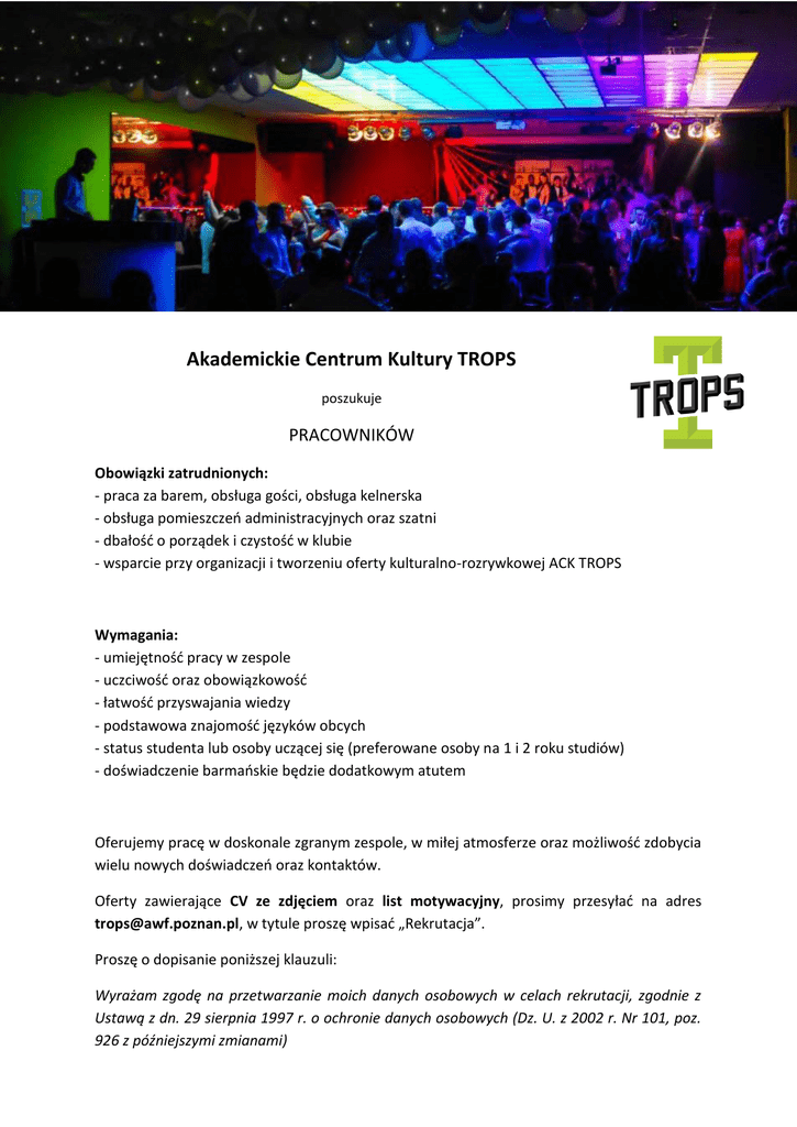 Akademickie Centrum Kultury TROPS poszukuje PRACOWNIKÓW Obowiązki zatrudnionych: - praca za barem, obsługa gości, obsługa kelnerska - obsługa pomieszczeń administracyjnych oraz szatni - dbałość o porządek i czystość w klubie - wsparcie przy organizacji i tworzeniu oferty kulturalno-rozrywkowej ACK TROPS Wymagania: - umiejętność pracy w zespole - uczciwość oraz obowiązkowość - łatwość przyswajania wiedzy - podstawowa znajomość języków obcych - status studenta lub osoby uczącej się (preferowane osoby na 1 i 2 roku studiów) - doświadczenie barmańskie będzie dodatkowym atutem Oferujemy pracę w doskonale zgranym zespole, w miłej atmosferze oraz możliwość zdobycia wielu nowych doświadczeń oraz kontaktów. Oferty zawierające CV ze zdjęciem oraz list motywacyjny, prosimy przesyłać na adres [email protected], w tytule proszę wpisać „Rekrutacja”. Proszę o dopisanie poniższej klauzuli: Wyrażam zgodę na przetwarzanie moich danych osobowych w celach rekrutacji, zgodnie z Ustawą z dn. 29 sierpnia 1997 r. o ochronie danych osobowych (Dz. U. z 2002 r. Nr 101, poz. 926 z późniejszymi zmianami)