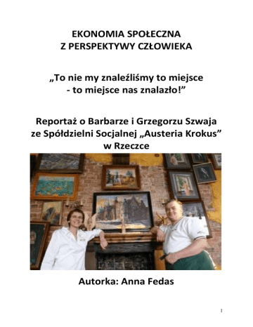 EKONOMIA SPOŁECZNA Z PERSPEKTYWY CZŁOWIEKA „To nie my znaleźliśmy to miejsce - to miejsce nas znalazło!” Reportaż o Barbarze i Grzegorzu Szwaja ze Spółdzielni Socjalnej „Austeria Krokus” w Rzeczce Autorka: Anna Fedas 1 EKONOMIA SPOŁECZNA Z PERSPEKTYWY CZŁOWIEKA „To nie my znaleźliśmy to miejsce - to miejsce nas znalazło!” Reportaż o Barbarze i Grzegorzu Szwaja ze spółdzielni socjalnej „Austeria Krokus” W niewielkiej miejscowości Rzeczka, położonej w malowniczych Górach Sowich znajduje się wspaniała posiadłość państwa Szwajów, którzy swoją działalnością wciąż pokazują, że tradycyjne polskie przysłowie „chcieć to móc” jest możliwe do zrealizowania. Nietrudno trafić do Austerii Krokus – miejscowość Rzeczka znana jest doskonale wszystkim zwolennikom białego szaleństwa z rejonu Dolnego Śląska. Barbara i Grzegorz Szwaja prowadzą gospodarstwo agroturystyczne od 2006, a spółdzielnię socjalną „Austeria Krokus” od 2007 roku. Są doświadczonymi, a przy tym niezwykle skromnymi gospodarzami, którzy swoją gościnnością i niepowtarzalną, domową atmosferą są w stanie urzec każdego gościa. „Może nasze gospodarstwo nie jest tak piękne i tak wspaniale wyposażone jak najlepsze hotele europejskie, ale za nami przemawia wiele innych czynników, a przede wszystkim cudowna atmosfera. Nasi goście nie tylko korzystają z tej atmosfery, ONI ją kreują.” – piszą na swojej stronie internetowej gospodarze (www.austeriakrokus.pl). Początki zwykle bywają trudne Jako osoby bezrobotne, państwo Szwajowie trafili do Rzeczki bez kapitału - za to pełni pasji, pomysłów i zapału. Tworzyli wszystko od podstaw. Ale nie narzekali. Nawet na to, że w Rzeczce – miejscowości ze stosunkowo sporym odsetkiem bezrobotnych paradoksalnie trudno było znaleźć osoby chętne do pracy. Grzegorz i Barbara Szwaja, powołując do życia spółdzielnię socjalną Austeria Krokus, dali zatrudnienie nie tylko sobie, ale także kilku innym 2 bezrobotnym mieszkańcom gminy Walim. Spółdzielnia Socjalna Austeria Krokus została zarejestrowana przed Bożym Narodzeniem - 21 grudnia 2007 roku. Grzegorz Szwaja - pomysłodawca i mózg całego przedsięwzięcia - namówił do współdziałania nie tylko swoją żonę, ale jeszcze trzech innych bezrobotnych mieszkańców okolic Walimia. Do utworzenia spółdzielni socjalnej potrzeba minimum pięciu osób. „Znaleźliśmy jednak trzech brakujących członków. Dzięki wielkiej pomocy ówcześnie działającego Regionalnego Ośrodka Wspierania Przedsiębiorczości Socjalnej (w ramach Partnerstwa na Rzecz Rozwoju „Muflon”) w Wałbrzychu udało się nam przebrnąć przez biurokratyczną machinę i rozpocząć działalność przed okresem świąteczno-noworocznym” – relacjonuje Grzegorz Szwaja. Dziś – z perspektywy lat pani Barbara Szwaja czuje ogromny sentyment do swojego obecnego miejsca zamieszkania, nie żałuje żadnej decyzji i z nostalgią podkreśla: „To nie my znaleźliśmy to miejsce – to miejsce nas znalazło”. Państwo Szwajowie zdecydowali się założyć spółdzielnię socjalną, gdy prowadzili już gospodarstwo agroturystyczne. Na początku oczywiście nie było łatwo – gąszcz przepisów, wymaganych dokumentów, księgowość – nietrudno się zniechęcić. Jednak z czasem – w miarę przybywania kolejnych gości - było coraz lepiej. W końcu znalazły się fundusze na realizowanie coraz to nowych inicjatyw. A to organizacja plenerów malarskich, a to galeria malarska. Państwo Szwajowie nie boją się żadnych przedsięwzięć. Potrafią zorganizować niemal każdą imprezę – od przyjęć okolicznościowych (wesela, komunie, chrzciny) poprzez bale (studniówka, andrzejki, sylwester, karnawał), aż do imprez firmowych (szkolenia, prezentacje, zabawy integracyjne, bankiety). Jako spółdzielnia socjalna mają wśród swoich członków zarówno osoby niepełnosprawne, jak i bezrobotne. „Pomysł na powołanie do życia spółdzielni socjalnej „Austeria Krokus” zrodził się z potrzeby wypełnienia luki w kadrach przy przedsięwzięciu, takim, jakie chcieliśmy poprowadzić. Ale również uważaliśmy wraz z żoną, że będzie to dobra recepta na bezrobocie dla gminy Walim, w której mieszkamy.” – opowiada pan Grzegorz Szwaja. „A skąd ta nazwa? Choć do końca niejasna – jest bardzo oryginalna i szybko zapada w pamięć. Austeria to (galicyjska) karczma. Drugiego członu nazwy – „krokus” nie trzeba tłumaczyć – warto jednak dodać, że jest to nazwa schroniska młodzieżowego, które niegdyś mieściło się w Rzeczce.” Sukces owocem ciężkiej pracy Proces wcielania ambitnych planów w życie nie jest prosty. Państwo Szwajowie nigdy nie zapomną początków swojej działalności. Nie od razu udaje się osiągnąć sukces. „Trudno przekonać ludzi do działania i wyrwać ich z marazmu, który zagościł w gminie Walim na dobre. Pomogli życzliwi ludzie i urzędnicy. Sukces to ciężka praca, czasami ponad siły. Nasz sukces możemy nieskromnie przypisać tylko sobie. Ale pomysł i prowadzenie całego przedsięwzięcia faktycznie spoczywa na naszych barkach - inni członkowie idą do domu, a my z żoną zostajemy w pracy tyle, ile wymaga tego sytuacja. Dla nas praca i mieszkanie to to samo miejsce.” Oczywiście nie należy zapomnieć, że spółdzielnia socjalna „Austeria Krokus” to nie tylko państwo Szwajowie. „No i właśnie o pozostałych członkach też należy wspomnieć. Przecież oni również ciężko pracują. Bez nich te tryby w całej spółdzielczej maszynie dobrze by się nie kręciły. Marek Wata – człowiek nieoceniony. Bardzo lojalny i oddający całego siebie dla dobra spółdzielni. Mówi, że „spółdzielnia to jego drugi dom”. Karmi zwierzęta: kózki, króliki, kotki. Zajmuje się całym obejściem - między innymi koszeniem, odśnieżaniem, paleniem w piecu. Tego typu prace porządkowe to jego d