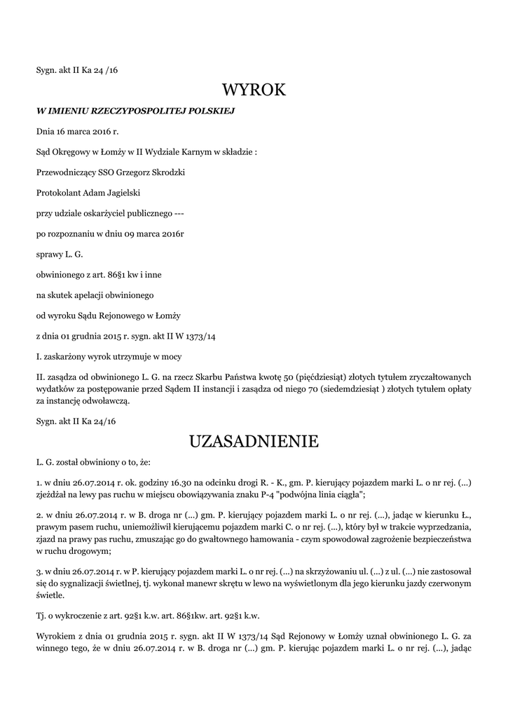 Sygn. akt II Ka 24 /16 WYROK W IMIENIU RZECZYPOSPOLITEJ POLSKIEJ Dnia 16 marca 2016 r. Sąd Okręgowy w Łomży w II Wydziale Karnym w składzie : Przewodniczący SSO Grzegorz Skrodzki Protokolant Adam Jagielski przy udziale oskarżyciel publicznego --po rozpoznaniu w dniu 09 marca 2016r sprawy L. G. obwinionego z art. 86§1 kw i inne na skutek apelacji obwinionego od wyroku Sądu Rejonowego w Łomży z dnia 01 grudnia 2015 r. sygn. akt II W 1373/14 I. zaskarżony wyrok utrzymuje w mocy II. zasądza od obwinionego L. G. na rzecz Skarbu Państwa kwotę 50 (pięćdziesiąt) złotych tytułem zryczałtowanych wydatków za postępowanie przed Sądem II instancji i zasądza od niego 70 (siedemdziesiąt ) złotych tytułem opłaty za instancję odwoławczą. Sygn. akt II Ka 24/16 UZASADNIENIE L. G. został obwiniony o to, że: 1. w dniu 26.07.2014 r. ok. godziny 16.30 na odcinku drogi R. - K., gm. P. kierujący pojazdem marki L. o nr rej. (...) zjeżdżał na lewy pas ruchu w miejscu obowiązywania znaku P-4 "podwójna linia ciągła"; 2. w dniu 26.07.2014 r. w B. droga nr (...) gm. P. kierujący pojazdem marki L. o nr rej. (...), jadąc w kierunku Ł., prawym pasem ruchu, uniemożliwił kierującemu pojazdem marki C. o nr rej. (...), który był w trakcie wyprzedzania, zjazd na prawy pas ruchu, zmuszając go do gwałtownego hamowania - czym spowodował zagrożenie bezpieczeństwa w ruchu drogowym; 3. w dniu 26.07.2014 r. w P. kierujący pojazdem marki L. o nr rej. (...) na skrzyżowaniu ul. (...) z ul. (...) nie zastosował się do sygnalizacji świetlnej, tj. wykonał manewr skrętu w lewo na wyświetlonym dla jego kierunku jazdy czerwonym świetle. Tj. o wykroczenie z art. 92§1 k.w. art. 86§1kw. art. 92§1 k.w. Wyrokiem z dnia 01 grudnia 2015 r. sygn. akt II W 1373/14 Sąd Rejonowy w Łomży uznał obwinionego L. G. za winnego tego, że w dniu 26.07.2014 r. w B. droga nr (...) gm. P. kierując pojazdem marki L. o nr rej. (...), jadąc w kierunku Ł. prawym pasem ruchu na pasie ruchu o dwóch jezdniach, po wykonanym manewrze wyprzedzania go przez kierującego samochodem marki C. o nr rej. (...) J. I. (1), uniemożliwił kierującemu C. zasygnalizowany kierunkowskazem powrót na prawy pas jezdni poprzez zwiększenie prędkości, zmuszając go w celu uniknięcia zderzenia do gwałtownego hamowania, a następnie wjazdu na wydzieloną z ruchu część jezdni, czym spowodował realne zagrożenie bezpieczeństwa w ruchu drogowym tj. wykroczenia z art. art. 86§1kw w zw. z art.24 ust.6 ustawy prawo o ruchu drogowym oraz tego, że w dniu 26.07.2014 r w P. kierując samochodem marki L. o nr rej. (...) na skrzyżowaniu ul. (...) z ul. (...) nie zastosował się do sygnalizacji świetlnej wykonując manewr skrętu w lewo przy wyświetlonym dla jego kierunku jazdy czerwonym świetle tj. wykroczenia z art.92§1kw w zw. z §95 ust.1 pkt.3 rozporządzenia Ministrów Infrastruktury oraz Spraw Wewnętrznych z dnia 31.07.2002r w sprawie znaków i sygnałów drogowych i za to z mocy art.86§1kw w zw. z art.9§2kw w zw. z art.24§1i3kw wymierzył mu łącznie karę grzywny w kwocie 700 (siedemset) złotych, uniewinnił obwinionego od popełnienia zarzucanego mu w pkt. I czynu oraz zasądził od obwinionego L. G. na rzecz Skarbu Państwa kwotę 70 złotych tytułem opłaty oraz kwotę 100 złotych tytułem zryczałtowanych wydatków postępowania. Powyższy wyrok na podstawie art. 103 § 2 k.p.s.w. w całości zaskarżył obwiniony. Na podstawie art. 427 § 1 k.p.k. i art. 438 pkt 2 i 3 k.p.k. w zw. z art. 109 § 2 k.p.s.w. powyższemu wyrokowi zarzucił: 1. odnośnie czynu przypisanego obwinionemu w punkcie 2 wyroku obrazę przepisów postępowania tj. art. 7 k.p.k. w zw. z art. 8 k.p.s.w. przez dowolną a nie swobodną ocenę zeznań świadków J. I. oraz B. I. i danie im wiary w całości, co mogło mieć wpływ na treść orzeczenia, przez poczynienie błędnych ustaleń faktycznych co do popełnienia przez obwinionego wykroczenia z art. 86 § 1 k.w. 2. odnośnie czynu przypisanego obwinionemu w punkcie 3 wyroku błąd w ustaleniach faktycznych przyjętych za podstawę orzeczenia, który mógł mieć wpływ na treść tego orzeczenia, polegający na dowolnym ustaleniu, że obwiniony wjechał na skrzyżowanie i opuścił je skręcając w lewo pomimo że dla tego kierunku włączyło się światło czerwone. Wskazując na powyższe zarzuty na podstawie art. 437 k.p.k. w zw. z art. 109 § 2 k.p.s.w. wniósł o zmianę zaskarżonego wyroku w punkcie 2 oraz 3 i uniewinnienie go od zarzucanych mu czynów a także o uznanie za niewinnego w zakresie czynu wskazanego w pkt. 1 wyroku, ewentualnie o uchylenie zaskarżonego wyroku w całości i jeżeli sąd uzna to za konieczne i dopuszczalne przekazanie sprawy sądowi pierwszej instancji do ponownego rozpoznania. Sąd Okręgowy zważył, co następuje: Apelacja obwinionego jest bezzasadna. W pierwszej kolejności wskazać należy iż w zakresie pierwszego z zarzucanych mu czynów to zaskarżonym wyrokiem został on uniewinniony od jego popełnienia a w związku z powyższym wniosek apelacji o jego uniewinnienie także od tego zarzutu należy traktować jako element stanowiska o podtrzymanie wyroku w tym zakresie albowiem po stronie obwinionego brak jest interesu prawnego w jego zaskarżeniu . W ocenie Sądu Okręgowego Sąd I instancji w sposób prawidłowy przeprowadził postępowanie dowodowe w sprawie oraz dokonał oceny zebranych dowodów, a wyciągnięte z tej oceny wnioski przedstawił w prawidłowo sporządzonym pisemnym uzasadnieniu wyroku motywując przyczyny wydanego wyroku. Ocena dowodów dokonana przez Sąd I instancji jest rzetelna, wszechstronna i rzeczowa, nie zawiera błędów natury logicznej i została przeprowadzona zgodnie z regułą wyrażoną w art. 7 k.p.k. Znajduje wyraz w prawidłowo ustalonym stanie faktycznym, a jej prawidłowość da się skontrolować w postępowaniu odwoławczym, nie wymagając korekty. Apelację skarżącego sprowadzić