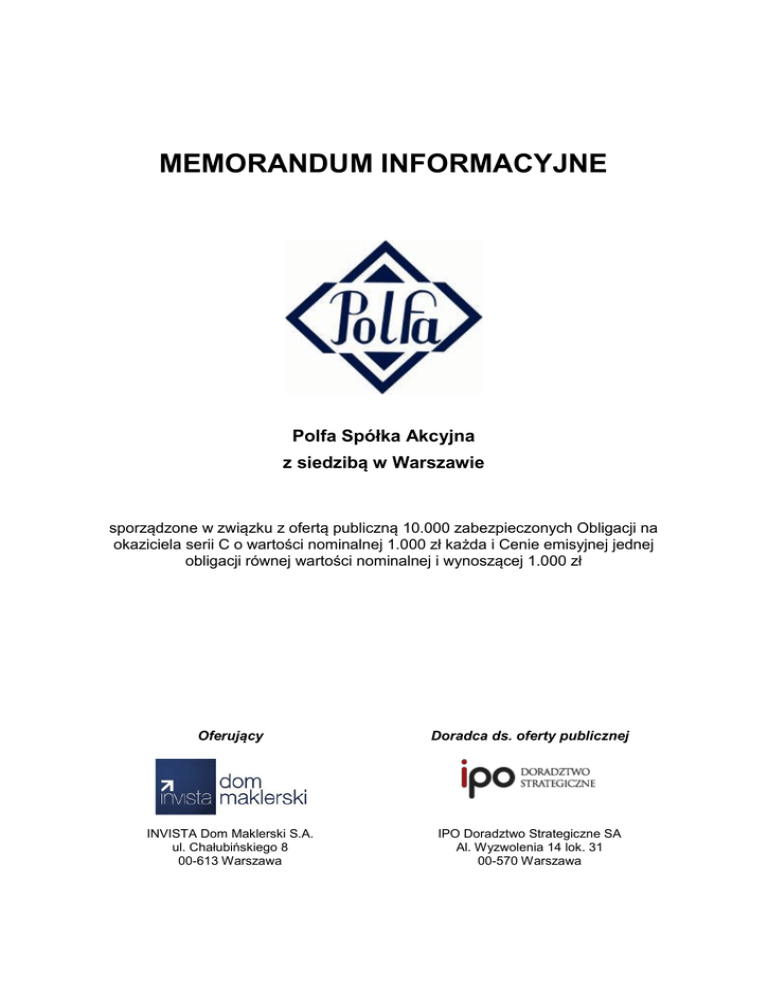 MEMORANDUM INFORMACYJNE Polfa Spółka Akcyjna z siedzibą w Warszawie sporządzone w związku z ofertą publiczną 10.000 zabezpieczonych Obligacji na okaziciela serii C o wartości nominalnej 1.000 zł każda i Cenie emisyjnej jednej obligacji równej wartości nominalnej i wynoszącej 1.000 zł Oferujący Doradca ds. oferty publicznej INVISTA Dom Maklerski S.A. ul. Chałubińskiego 8 00-613 Warszawa IPO Doradztwo Strategiczne SA Al. Wyzwolenia 14 lok. 31 00-570 Warszawa Memorandum Informacyjne Polfa S.A. Wstęp Wstęp Niniejsze Memorandum Informacyjne zostało przygotowane w związku z Ofertą Publiczną 10.000 zabezpieczonych Obligacji na okaziciela serii C o wartości nominalnej 1.000 zł każda spółki Polfa S.A. z siedzibą w Warszawie. Oferowanie Obligacji na okaziciela serii C odbywa się wyłącznie na warunkach i zgodnie z zasadami określonymi w niniejszym Memorandum Informacyjnym, które jest jedynym prawnie wiążącym dokumentem zawierającym informacje o Obligacjach serii C, ich ofercie i Emitencie. 1) Emitent: Nazwa (firma): Nazwa (skrócona): Forma prawna: Kraj siedziby: Siedziba: Adres: Telefon: Fax: Poczta elektroniczna: Strona internetowa: Numer KRS: Oznaczenie Sądu: REGON: NIP: Polfa Spółka Akcyjna Polfa S.A. Spółka Akcyjna Polska Warszawa ul. Tytusa Chałubińskiego 8, 00-613 Warszawa (+48) 22 647 50 00 (+48) 22 536 71 41 [email protected] www.polfa.eu 0000358261 Sąd Rejonowy dla m. St. Warszawy w Warszawie XII Wydział Gospodarczy Krajowego Rejestru Sądowego 300792724 781-181-65-84 2) Liczba, rodzaj, jednostkową wartość nominalną i oznaczenie emisji papierów wartościowych oferowanych w trybie Oferty Publicznej Na podstawie niniejszego Memorandum oferuje się 10.000 zabezpieczonych Obligacji na okaziciela serii C o wartości nominalnej 1.000 zł każda. 3) Podmiot udzielający zabezpieczenia (gwarantujący), ze wskazaniem zabezpieczenia Obligacje są zabezpieczone (gwarantowane). Zabezpieczeniem jest ustanowienie zastawu rejestrowego o wartości do 20.000.000 zł na znaku handlowym „POLFA”. Administratorem zastawu jest INVISTA Dom Maklerski Spółka Akcyjna z siedzibą w Warszawie. 4) Cena emisyjna (sprzedaży) oferowanych papierów wartościowych Cena emisyjna jednej obligacji jest równa wartości nominalnej i wynosi 1.000 zł. 5) Cel emisji Obligacji Środki uzyskane z emisji Obligacji zostaną przeznaczone na następujące cele: 1) wprowadzenie na wszystkie rynki działania innowacyjnych urządzeń medycznych; 2) wprowadzenie na wszystkie rynki działania onkologicznych leków refundowanych lub sprzedawanych w przetargach; 3) rozwój krajowej i zagranicznej sieci sprzedaży. 2 Wstęp Memorandum Informacyjne Polfa S.A. Na dzień sporządzenia Memorandum w przypadku pozyskania maksymalnych wpływów z emisji Emitent planuje przeznaczyć na każdy z wyżej wymienionych celów proporcjonalnie po 1/3 pozyskanej kwoty pieniężnej. W przypadku pozyskania niższych wpływów z emisji Emitent rozważy sposób podziału wpływów z emisji w zależności od bieżących możliwości innego dodatkowego sfinansowania każdego z celów. Emitent poinformuje o przeznaczeniu wpływów z emisji na każdy z celów raportem bieżącym w systemie EBI. Na dzień sporządzenia Memorandum nie są znane żadne przeszkody i ograniczenia, które utrudniałyby realizację ww. celów emisji. Emitent nie przyznaje żadnemu z ww. celów priorytetu. Emitent nie zakłada zmiany celów emisji. Niemniej jednak Emitent zastrzega sobie możliwość odstąpienia od realizacji opisanych celów emisji lub ich zmiany w przypadku, gdyby ich realizacja okazała się niecelowa bądź gdyby wystąpiły nieprzewidziane zdarzenia mogące negatywnie wpłynąć na działalność Grupy. Emitent poinformuje o realizacji celów emisji na stronie internetowej Emitenta oraz raportem bieżącym w systemie EBI, jako spółka, której akcje są notowane w alternatywnym systemie obrotu na rynku NewConnect, którego organizatorem jest Giełda Papierów Wartościowych w Warszawie S.A. 6) Przepis ustawy, zgodnie z którym oferta publiczna może być prowadzona na podstawie Memorandum Obligacje Serii C oferowane na podstawie niniejszego Memorandum Informacyjnego są oferowane w trybie oferty publicznej w rozumieniu art. 3 ust 1 Ustawy o Ofercie Publicznej i w sposób wskazany w art. 7 ust. 9 tej Ustawy. Zgodnie z art. 41 ust. 1 Ustawy o Ofercie Publicznej, w przypadkach, o których mowa w art. 7 ust. 9 Ustawy, Emitent udostępnia do publicznej wiadomości memorandum informacyjne. Treść niniejszego Memorandum nie wymaga zatwierdzenia przez Komisję Nadzoru Finansowego. 7) Podmioty biorące udział w przygotowaniu i przeprowadzeniu Oferty Publicznej – podmiot oferujący, subemitenci i pozostałe podmioty Oferujący: Nazwa (firma): Siedziba: Adres: Telefon: Fax: Adres poczty elektronicznej: Adres strony internetowej: INVISTA Dom Maklerski Spółka Akcyjna Warszawa, Polska ul. Chałubińskiego 8, 00-613 Warszawa (+48) 22 647 50 52, (+48) 22 403 57 35 (+48) 22 403 52 35 [email protected] www.invistadm.pl Doradca ds. oferty publicznej: Nazwa (firma): Siedziba: Adres: Telefon: Fax: Adres poczty elektronicznej: Adres strony internetowej: IPO Doradztwo Strategiczne Spółka Akcyjna Warszawa Al. Wyzwolenia 14 lok. 31, 00-570 Warszawa (+48) 22 412 36 48 (+48) 22 412 36 48 [email protected] www.ipo.com.pl 3 Memorandum Informacyjne Polfa S.A. Wstęp Na dzień publikacji niniejszego Memorandum Emitent nie zawarł i nie planuje zawarcia umowy o submisję usługową lub inwestycyjną. 8) Data ważności Memorandum oraz data, do której informacje aktualizujące Memorandum zostały uwzględnione w jego treści Niniejsze Memorandum zostało opublikowane w dniu 26 listopada 2013 r. Termin ważności Memorandum rozpoczyna się z chwilą jego publikacji i kończy się z Dniem Przydziału Obligacji, tj. z dniem 11 grudnia 2013 r. Informacje aktualizujące zostały uwzględnione w jego treści do dnia 26 listopada 2013 r. 