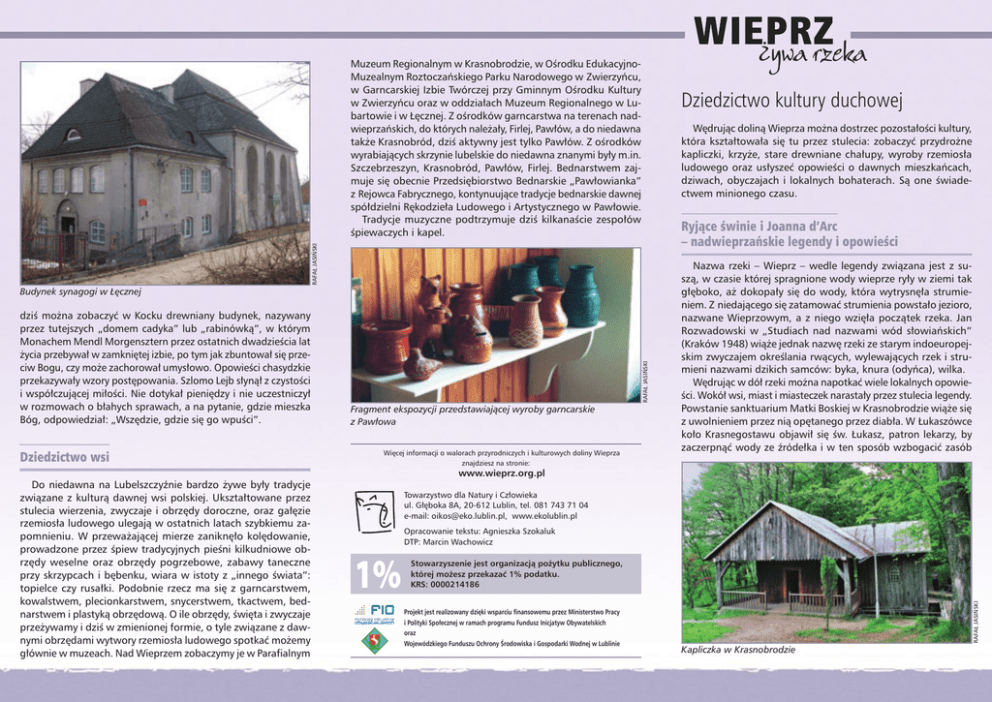 Muzeum Regionalnym w Krasnobrodzie, w Ośrodku EdukacyjnoMuzealnym Roztoczańskiego Parku Narodowego w Zwierzyńcu, w Garncarskiej Izbie Twórczej przy Gminnym Ośrodku Kultury w Zwierzyńcu oraz w oddziałach Muzeum Regionalnego w Lubartowie i w Łęcznej. Z ośrodków garncarstwa na terenach nadwieprzańskich, do których należały, Firlej, Pawłów, a do niedawna także Krasnobród, dziś aktywny jest tylko Pawłów. Z ośrodków wyrabiających skrzynie lubelskie do niedawna znanymi były m.in. Szczebrzeszyn, Krasnobród, Pawłów, Firlej. Bednarstwem zajmuje się obecnie Przedsiębiorstwo Bednarskie „Pawłowianka” z Rejowca Fabrycznego, kontynuujące tradycje bednarskie dawnej spółdzielni Rękodzieła Ludowego i Artystycznego w Pawłowie. Tradycje muzyczne podtrzymuje dziś kilkanaście zespołów śpiewaczych i kapel. Dziedzictwo kultury duchowej Wędrując doliną Wieprza można dostrzec pozostałości kultury, która kształtowała się tu przez stulecia: zobaczyć przydrożne kapliczki, krzyże, stare drewniane chałupy, wyroby rzemiosła ludowego oraz usłyszeć opowieści o dawnych mieszkańcach, dziwach, obyczajach i lokalnych bohaterach. Są one świadectwem minionego czasu. rafał jasiński Ryjące świnie i Joanna d’Arc – nadwieprzańskie legendy i opowieści Dziedzictwo wsi Do niedawna na Lubelszczyźnie bardzo żywe były tradycje związane z kulturą dawnej wsi polskiej. Ukształtowane przez stulecia wierzenia, zwyczaje i obrzędy doroczne, oraz gałęzie rzemiosła ludowego ulegają w ostatnich latach szybkiemu zapomnieniu. W przeważającej mierze zaniknęło kolędowanie, prowadzone przez śpiew tradycyjnych pieśni kilkudniowe obrzędy weselne oraz obrzędy pogrzebowe, zabawy taneczne przy skrzypcach i bębenku, wiara w istoty z „innego świata”: topielce czy rusałki. Podobnie rzecz ma się z garncarstwem, kowalstwem, plecionkarstwem, snycerstwem, tkactwem, bednarstwem i plastyką obrzędową. O ile obrzędy, święta i zwyczaje przeżywamy i dziś w zmienionej formie, o tyle związane z dawnymi obrzędami wytwory rzemiosła ludowego spotkać możemy głównie w muzeach. Nad Wieprzem zobaczymy je w Parafialnym Fragment ekspozycji przedstawiającej wyroby garncarskie z Pawłowa Więcej informacji o walorach przyrodniczych i kulturowych doliny Wieprza znajdziesz na stronie: www.wieprz.org.pl Towarzystwo dla Natury i Człowieka ul. Głęboka 8A, 20-612 Lublin, tel. 081 743 71 04 e-mail: [email protected], www.ekolublin.pl Opracowanie tekstu: Agnieszka Szokaluk DTP: Marcin Wachowicz Stowarzyszenie jest organizacją pożytku publicznego, której możesz przekazać 1% podatku. KRS: 0000214186 Projekt jest realizowany dzięki wsparciu finansowemu przez Ministerstwo Pracy i Polityki Społecznej w ramach programu Fundusz Inicjatyw Obywatelskich oraz Wojewódzkiego Funduszu Ochrony Środowiska i Gospodarki Wodnej w Lublinie rafał jasiński dziś można zobaczyć w Kocku drewniany budynek, nazywany przez tutejszych „domem cadyka” lub „rabinówką”, w którym Monachem Mendl Morgensztern przez ostatnich dwadzieścia lat życia przebywał w zamkniętej izbie, po tym jak zbuntował się przeciw Bogu, czy może zachorował umysłowo. Opowieści chasydzkie przekazywały wzory postępowania. Szlomo Lejb słynął z czystości i współczującej miłości. Nie dotykał pieniędzy i nie uczestniczył w rozmowach o błahych sprawach, a na pytanie, gdzie mieszka Bóg, odpowiedział: „Wszędzie, gdzie się go wpuści”. rafał jasiński Budynek synagogi w Łęcznej Nazwa rzeki – Wieprz – wedle legendy związana jest z suszą, w czasie której spragnione wody wieprze ryły w ziemi tak głęboko, aż dokopały się do wody, która wytrysnęła strumieniem. Z niedającego się zatamować strumienia powstało jezioro, nazwane Wieprzowym, a z niego wzięła początek rzeka. Jan Rozwadowski w „Studiach nad nazwami wód słowiańskich” (Kraków 1948) wiąże jednak nazwę rzeki ze starym indoeuropejskim zwyczajem określania rwących, wylewających rzek i strumieni nazwami dzikich samców: byka, knura (odyńca), wilka. Wędrując w dół rzeki można napotkać wiele lokalnych opowieści. Wokół wsi, miast i miasteczek narastały przez stulecia legendy. Powstanie sanktuarium Matki Boskiej w Krasnobrodzie wiąże się z uwolnieniem przez nią opętanego przez diabła. W Łukaszówce koło Krasnegostawu objawił się św. Łukasz, patron lekarzy, by zaczerpnąć wody ze źródełka i w ten sposób wzbogacić zasób Kapliczka w Krasnobrodzie środków, dzięki którym lekarze mogą pomóc cierpiącym. W cudownym miejscu postawiono drewnianą kapliczkę, w której jest obraz upamiętniający zdarzenie. Niewyjaśniona pozostała historia „grobiska” w Krynicy – zagadkowego pomnika nieznanego przeznaczenia, usadowionego na wzgórzu, kształtem przypominającego piramidę. Przyjmuje się, iż jest to grób działacza ariańskiego Pawła Orzechowskiego. Na zamku w Krupem, z którego teraz pozostały ruiny, miała się ukazywać o dwunastej w nocy niezwykle piękna kobieta – Biała Pani. Jej ujrzenie odbierało spokój. Bardzo ciekawa – i prawdziwa – opowieść wiąże się z Łańcuchowem, położonym niedaleko Łęcznej. W XVII w. chłopów z tej wsi poprowadziła do walki przeciw Tatarom prosta dziewczyna, Marianna z Łańcuchowa, która ogłosiła się żołnierzem i wodzem. Marianna została potem spalona na stosie w Lublinie jako czarownica. Nazywana jest polską Joanna d’Arc, Dziewicą Orleańską znad Wieprza – skojarzenie jak najbardziej słuszne w świetle przytoczonych faktów. Malownicza i poruszająca wyobraźnię legenda wiąże się z pałacem w Zawieprzycach, z którego dziś pozostały ruiny. Choć często jest uważana za prawdziwą, została stworzona w XIX w. przez autora romansów histoGrobisko w Krynicy rycznych. Wedle legendy kulturowej Lubelszczyzny, co zostało brutalnie przerwane przez hitlerowską eksterminację w czasie II wojn