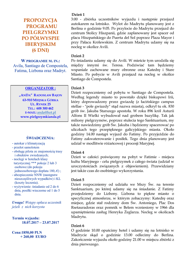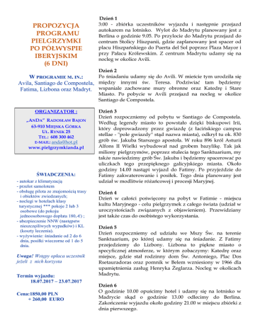 PROPOZYCJA PROGRAMU PIELGRZYMKI PO PÓŁWYSPIE IBERYJSKIM (6 DNI) Dzień 1 3:00 - zbiórka uczestników wyjazdu i następnie przejazd autokarem na lotnisko. Wylot do Madrytu planowany jest z Berlina o godzinie 9.05. Po przylocie do Madrytu przejazd do centrum Stolicy Hiszpanii, gdzie zaplanowany jest spacer od placu Hiszpańskiego do Puerta del Sol poprzez Plaza Mayor i przy Pałacu Królewskim. Z centrum Madrytu udamy się na nocleg w okolice Avili. Dzień 2 Po śniadaniu udamy się do Avili. W mieście tym urodziła się W PROGRAMIE M. IN.: Avila, Santiago de Compostela, między innymi św. Teresa. Podziwiać tam będziemy Fatima, Lizbona oraz Madryt. wspaniale zachowane mury obronne oraz Katedrę i Stare Miasto. Po pobycie w Avili przejazd na nocleg w okolice Santiago de Compostela. ORGANIZATOR : „ANDA” RADOSŁAW BAJON 63-910 MIEJSKA GÓRKA UL. RYNEK 25 TEL.: 608 300 462 E-MAIL: [email protected] www.pielgrzymkianda.pl ŚWIADCZENIA: - autokar z klimatyzacją - przelot samolotem - obsługę pilota ze znajomością trasy i obiektów zwiedzanych; - noclegi w hotelach klasy turystycznej *** pokoje 2 lub 3 osobowe (do pokoju jednoosobowego dopłata 180,-€) ; - ubezpieczenie NNW (następstw nieszczęśliwych wypadków) i KL (koszty leczenia). - wyżywienie: śniadanie od 2 do 6 dnia, posiłki wieczorne od 1 do 5 dnia. Uwaga! Wstępy opłaca uczestnik jeżeli z nich korzysta Termin wyjazdu: 18.07.2017 – 23.07.2017 Cena:1850,00 PLN + 260,00 EURO Dzień 3 Dzień rozpoczniemy od pobytu w Santiago de Compostela. Według legendy miasto to powstało dzięki biskupowi Irii, który doprowadzony przez gwiazdę (z łacińskiego campus stellae - "pole gwiazdy" stąd nazwa miasta), odkrył tu ok. 830 grób św. Jakuba Starszego apostoła. W roku 896 król Asturii Alfons II Wielki wybudował nad grobem bazylikę. Tak jak miliony pielgrzymów, poprzez stulecia tego Sanktuarium, my także nawiedzimy grób Św. Jakuba i będziemy spacerować po uliczkach tego przepięknego galicyjskiego miasta. Około godziny 14.00 nastąpi wyjazd do Fatimy. Po przyjeździe do Fatimy zakwaterowanie i posiłek. Tego dnia planowany jest udział w modlitwie różańcowej i procesji Maryjnej. Dzień 4 Dzień w całości poświęcony na pobyt w Fatimie - miejscu kultu Maryjnego - celu pielgrzymek z całego świata (udział w uroczystościach związanych z objawieniem). Przewidziany jest także czas do osobistego wykorzystania. Dzień 5 Dzień rozpoczniemy od udziału we Mszy Św. na terenie Sanktuarium, po której udamy się na śniadanie. Z Fatimy przejedziemy do Lizbony. Lizbona to piękne miasto o specyficznej atmosferze, w którym zobaczymy: Katedrę oraz miejsce, gdzie stał rodzinny dom Św. Antoniego, Plac Dos Rsetauradoras oraz pomnik w Belem wzniesiony w 1966 dla upamiętnienia zasług Henryka Żeglarza. Nocleg w okolicach Madrytu. Dzień 6 O godzinie 10.00 opuścimy hotel i udamy się na lotnisko w Madrycie skąd o godzinie 13.00 odlecimy do Berlina. Zakończenie wyjazdu około godziny 21.00 w miejscu zbiórki z dnia pierwszego.