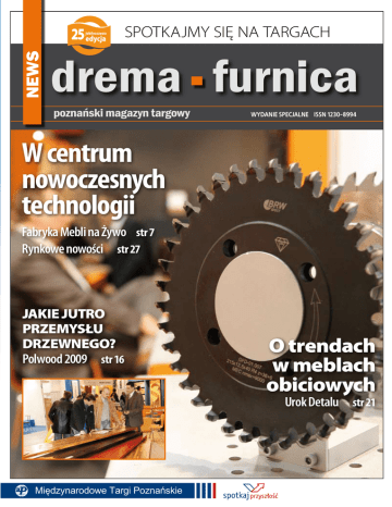 news spotkajmy się na targach drema furnica poznański magazyn targowy WYDANIE SPECJALNE ISSN 1230-8994 W centrum nowoczesnych technologii Fabryka Mebli na Żywo str 7 Rynkowe nowości str 27 jakie Jutro przemysłu drzewnego? Polwood 2009 str 16 O trendach w meblach obiciowych Urok Detalu str 21 Międzynarodowe Targi Poznańskie W NUMERZE Twój najlepszy biznesowy czas Hanna Ochnik-Pawłowska Dyrektor targów DREMA I FURNICA 2 W centrum nowych technologii i trendów O tym warto wiedzieć. Wszystko dla zwiedzających W KRĘGU WYDARZEŃ 7 Inspirujące wnętrza w Poznaniu Fabryka Mebli na Żywo Czy wciąż konkurencyjni? Polwood 2009 Jutro przemysłu drzewnego – rozmowa z Andrzejem Górskim, prezydentem Polskiej Izby Gospodarczej Przemysłu Drzewnego Drewno budowlane zawsze w cenie Barwy wypoczynku Kolor jako punkt wyjścia. Zuzanna Skalska Wypróbuj w praktyce. Poligon Umiejętności Inspirująca wystawa. Wyczarowane z drewna Polski przemysł maszyn i narzędzi do obróbki drewna Polska Fabryka Mebli W czołówce producentów płyt drewnopochodnych – rozmowa z Marią Antonim Hikiertem, sekretarzem Stowarzyszenia Producentów Płyt Drewnopochodnych Stowarzyszenie Tartaków Polskich I Ty możesz zostać mistrzem. VIII Mistrzostwa Polski we Wbijaniu Gwoździ Taka okazja tylko na targach Branża na falach eteru NOWOŚCI 150 targowych premier, które zobaczymy na stoiskach 27 news AKTUALNOŚCI W biznesie najważniejsza jest informacja, a sukces odnoszą ci, którzy potrafią na nią najszybciej zareagować. Jubileuszowa 25. edycja Międzynarodowych Targów Maszyn i Narzędzi dla Przemysłu Drzewnego i Meblarskiego DREMA oraz odbywające się jednocześnie Międzynarodowe Targi Komponentów do Produkcji Mebli FURNICA są wyjątkową okazją do znalezienia się w centrum biznesu branży drzewnej i meblarskiej. W tym roku w targach tych bierze udział blisko 900 firm reprezentujących niemal wszystkie liczące się na świecie marki. Czy może być lepsze, bardziej obiektywne źródło informacji, wiedzy na temat branży i rynku? Jeśli jeszcze dodamy do tego fakt, że jednym z celów większości wystawców jest zaprezentowanie i przetestowanie nowości, to czy udział w targach nie jest najlepszym czasem do biznesowych działań? Jako organizatorzy tak ważnego wydarzenia aranżujemy różnego rodzaju spotkania, organizujemy specjalne ekspozycje po to, aby stworzyć jak najlepszą, najefektywniejszą scenę do nawiązywania kontaktów biznesowych i zebrania informacji o rynku. Liczymy na to, że organizowane przez nas wydarzenia będą pomocne w podejmowaniu decyzji i podpowiedzą, jak skutecznie stawić czoło wyzwaniom związanym z zawirowaniami na rynku. Z pewnością jednym z wyjść jest podwyższanie konkurencyjności poprzez wprowadzanie rozwiązań bardziej ekonomicznych, a jednocześnie poprawiających jakość produktów końcowych. I to są najważniejsze sprawy, którym podporządkowujemy myśl przewodnią towarzyszących targom wydarzeń. DREMA i FURNICA to najważniejsze spotkanie branży drzewnej i meblarskiej w regionie Europy Środkowo-Wschodniej i Południowej. W targach tych biorą udział wszystkie znaczące stowarzyszenia i organizacje, dlatego nie zabraknie spotkań, rozmów, debat i for dyskusyjnych. Na temat strategii oszczędności energii oraz funduszy unijnych, a także o kondycji i przyszłości branż porozmawiamy m.in. na III Forum Gospodarczym Polskiego Przemysłu Drzewnego i Meblarskiego Polwood 2009. Mamy nadzieję, że dzięki takim spotkaniom środowiskowym jeszcze więcej skorzystają Państwo z pobytu w Poznaniu, czego serdecznie życzę. drema furnica edycja specjalna Poznańskiego Magazynu Targowego Redaktor naczelna: Halina Buczkowska Redakcja: Dorota Krawczak, Donata Naumienko, Anna Olszewska-Marcinkiewicz, Jacek Obarski, Dorota Piątkowska Projekt graficzny: PressEnter Fotografie: Grzegorz Krykwiński, Piotr Piosik, Dana Puciłowska, materiały reklamodawców, archiwum Przygotowanie do druku: PressEnter Druk: Zakład Poligraficzny Moś & Łuczak sp. j. Redakcja: Trębacka 4, 00-074 Warszawa, Polska tel. +48 22/ 828 99 44, fax +48 22/ 827 07 59, e-mail: [email protected] Wydawca: Międzynarodowe Targi Poznańskie sp. z o.o. Głogowska 14, 60-734 Poznań, Polska tel. +48 61/ 869 20 00, fax +48 61/ 869 29 99 e-mail: [email protected], www.mtp.pl Aktualności www.drema.pl • www.furnica.pl • www.drema.pl • W centrum nowych technologii i trendów Targi DREMA i FURNICA 2009 objął honorowym patronatem Minister Gospodarki RP Odbywające się w dniach 31 marca – 3 kwietnia w Poznaniu targi DREMA i FURNICA są bezcennym źródłem informacji dla przedsiębiorców z branży drzewnej i produkcji mebli. Nowe technologie obróbki drewna i wzornicze hity w świecie komponentów – czy okażą się lekiem na trudny okres w gospodarce? oczątek drugiego kwartału jest okresem szczególnie ważnym w kalendarzu profesjonalistów z branży drzewnej i meblarskiej, bowiem organizowane w tym czasie w Poznaniu targi są okazją do zapoznania się z nowościami rynkowymi. Na przestrzeni targowej 35 000 m2 blisko 900 wystawców i firm reprezentowanych z 21 krajów zaprezentuje swoje aktualne propozycje. Zgłoszono ponad 150 nowości, w tym premiery światowe*. Wizyta w Poznaniu to także dobry moment na fachowe rozmowy oraz wymianę doświadczeń w międzynarodowym towarzystwie. Sprzyja temu nie tylko obecność na targach firm o światowej renomie, ale także unikalne przestrzenie prezentacyjne i ciekawy program targowych wydarzeń. P Technologie na wyciągnięcie ręki Świętujące 25. jubileusz targi DREMA 2009 to najnowsze rozwiązania technologiczne, dzięki którym możliwa jest mechanizacja i zwiększenie opłacalności produkcji małych, średnich i dużych przedsiębiorstw. Prezentacja maszyn 2 NEWS DREMA • FURNICA w ruchu, możliwość konsultacji z obecnymi na stoiskach specjalistami – to czynniki wpływające na wysoką frekwencję gości z kraju i