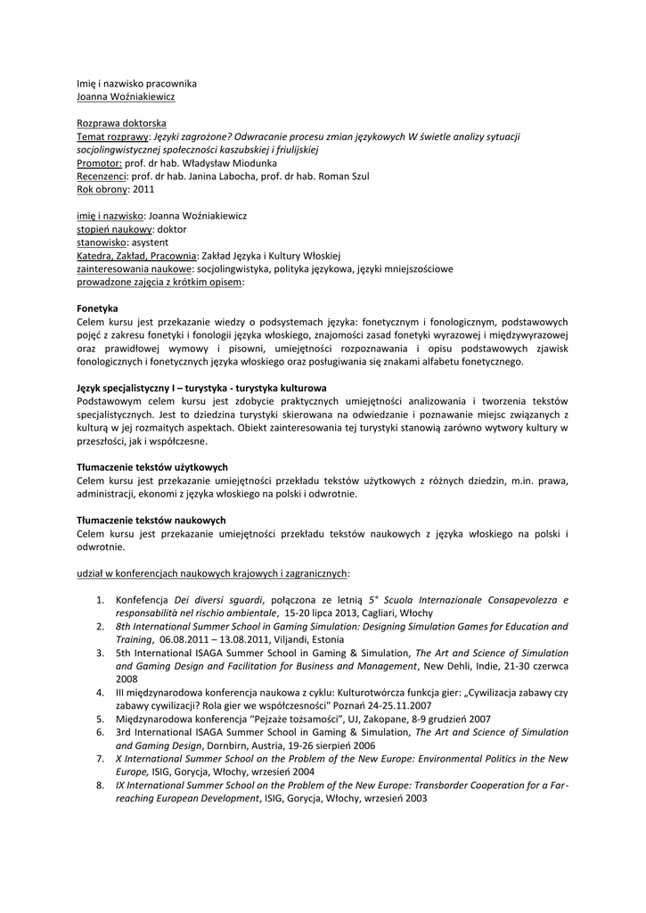 Imię i nazwisko pracownika Joanna Woźniakiewicz Rozprawa
