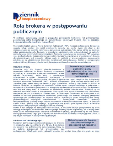 Rola brokera w postępowaniu publicznym W praktyce zamawiający nawet w przypadku powierzenia brokerowi roli pełnomocnika, pozostawiają sobie kompetencje do zatwierdzania kluczowych kwestii. Jest to podejście bezpieczniejsze dla obu stron. - Łukasz Górny Uniwersalny kształt ustawy Prawo Zamówień Publicznych (PZP), mającej zastosowanie do każdego rodzaju usług, dostaw lub robót publicznych sprawia, że często słyszy się głosy o jej niedostosowaniu do specyfiki konkretnego zamówienia publicznego. Taka opinia odnosi się także do usług ubezpieczeniowych. Zawarcie w procedurze publicznej polisy odpowiadającej na potrzeby zamawiającego rzeczywiście jest wymagające. Podmioty zobowiązane do stosowania PZP korzystają więc z usług brokerów i często głównym powodem nawiązania współpracy z profesjonalnym doradcą ubezpieczeniowym jest wsparcie, jakiego może on udzielić w przeprowadzeniu postępowania publicznego na ubezpieczenie interesów majątkowych zamawiającego. Broker w postępowaniu może pełnić rolę biegłego, członka komisji przetargowej lub pełnomocnika zamawiającego. Naturalnie biegły Zawarcie w procedurze publicznej polisy odpowiadającej na potrzeby zamawiającego jest wymagające. Naturalna rola dla brokera ubezpieczeniowego w procedurze publicznej to biegły. Brokerzy przygotowują najczęściej w całości opis przedmiotu zamówienia, a więc warunki oczekiwanej polisy wraz z dodatkowymi informacjami o ryzyku. "Wiadomości specjalnych", o których mowa w PZP, wymaga jednak nie tylko przygotowanie części merytorycznej Specyfikacji Istotnych Warunków Zamówienia (SIWZ). Warunki postępowania, jakie zostaną wyznaczone przez zamawiającego, także mogą decydować o jego powodzeniu. Brokerzy angażowani są mocno w kwestie formalne, ze względu na znajomość realiów rynku ubezpieczeniowego w połączeniu z umiejętnością stosowania przepisów PZP. Przygotowują rekomendacje wyboru trybu postępowania oraz kryteria oceny ofert w zależności od konkretnej umowy ubezpieczenia. Powierza się im ustalenie warunków udziału w postępowaniu, dotyczących m.in. sytuacji ekonomicznej i finansowej ubezpieczycieli lub ich wiedzy i doświadczenia. Przykładowym problemem do rozwiązania przez brokera w obszarze proceduralnym zamówienia publicznego jest konflikt pomiędzy przepisami uprawniającymi zamawiającego do żądania wykazu wykonanych przez ubezpieczyciela usług, potwierdzających wymagane doświadczenie, a obowiązkiem zachowania "tajemnicy ubezpieczeniowej" (szerzej o tego rodzaju wyzwaniach w kolejnych artykułach cyklu). W praktyce często broker, pełniąc rolę biegłego, przygotowuje dla komisji przetargowej całość materiałów formalnych i merytorycznych składających się na przetarg. Broker w roli biegłego to zazwyczaj ciało doradcze, a kluczowe decyzje podejmowane są przez komisję przetargową lub kierownika zamawiającego. Większy wpływ na przetarg, ale w mojej opinii także zakres odpowiedzialności spoczywa na brokerze w sytuacji, gdy powierza się mu rolę członka komisji przetargowej. Jego głos w sytuacjach spornych może przeważyć nad przyjęciem takich, a nie innych rozwiązań w postępowaniu publicznym. Pełnomocnik zamawiającego Naturalna rola dla brokera ubezpieczeniowego w procedurze publicznej to biegły. Najszerszy zakres odpowiedzialności spoczywa na brokerze w przypadku, gdy na podstawie art. 15 ust. 2 powierzona mu zostanie rola pełnomocnika zamawiającego, który ma za zadanie przygotować lub przeprowadzić całe postępowanie. Wątpliwości może wzbudzić pytanie, czy pełniąc taką rolę, przejmuje on także kompetencje zarezerwowane w PZP dla kierownika zamawiającego, takie jak powołanie komisji przetargowej czy zatwierdzenie wyboru najkorzystniejszej oferty. Są one o tyle zasadne, że zgodnie z definicją z PZP kierownikiem zamawiającego jest osoba lub organ uprawniony do zarządzania zamawiającym, z wyłączeniem pełnomocników ustanowionych przez zamawiającego, a ponadto zgodnie z art. 18 ust. 2 PZP kierownik zamawiającego może powierzyć pisemnie wykonywanie w ramach przeprowadzanego postępowania zastrzeżonych dla niego czynności tylko pracownikom zamawiającego. Jednak ocenia się, że ustanowienie pełnomocnika przez zamawiającego może pociągać za sobą powierzenie mu całości czynności związanych z przetargiem (jeśli taki jest zakres umocowania), a więc także zastrzeżonych w PZP dla kierownika zamawiającego. Potwierdza to także stosowna opinia Urzędu Zamówień Publicznych. W takiej sytuacji za całość postępowania odpowiadałby obok kierownika zamawiającego także broker. W praktyce zamawiający nawet w przypadku powierzenia brokerowi roli pełnomocnika, pozostawiają sobie kompetencje do zatwierdzania kluczowych kwestii, takich jak kształt SIWZ, wybór najkorzystniejszej oferty, wykluczenie wykonawcy czy odrzucenie oferty. Oceniam, że jest to podejście bezpieczniejsze dla obu stron. Zamawiający ma większą kontrolę nad postępowaniem publicznym, za które ponosi odpowiedzialność, a broker pełni rolę doradczą w kwestiach formalnych i jego głównym zadaniem jest prawidłowy opis przedmiotu zamówienia. Łukasz Górny Radca prawny, główny specjalista ds. zamówień publicznych EIB