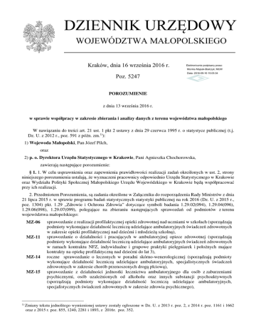 DZIENNIK URZĘDOWY WOJEWÓDZTWA MAŁOPOLSKIEGO Kraków, dnia 16 września 2016 r. Elektronicznie podpisany przez: Monika Majsak-Białczyk; MUW Poz. 5247 Data: 2016-09-16 15:05:34 POROZUMIENIE z dnia 13 września 2016 r. w sprawie współpracy w zakresie zbierania i analizy danych z terenu województwa małopolskiego W nawiązaniu do treści art. 21 ust. 1 pkt 2 ustawy z dnia 29 czerwca 1995 r. o statystyce publicznej (t.j. Dz. U. z 2012 r., poz. 591 z późn. zm.1)): 1) Wojewoda Małopolski, Pan Józef Pilch, oraz 2) p. o. Dyrektora Urzędu Statystycznego w Krakowie, Pani Agnieszka Chochorowska, zawierają następujące porozumienie: § 1. 1. W celu usprawnienia oraz zapewnienia prawidłowości realizacji zadań określonych w ust. 2, strony niniejszego porozumienia ustalają, że wyznaczeni pracownicy odpowiednio Urzędu Statystycznego w Krakowie oraz Wydziału Polityki Społecznej Małopolskiego Urzędu Wojewódzkiego w Krakowie będą współpracować przy ich realizacji. 2. Przedmiotem Porozumienia, są zadania określone w Załączniku do rozporządzenia Rady Ministrów z dnia 21 lipca 2015 r. w sprawie programu badań statystycznych statystyki publicznej na rok 2016 (Dz. U. z 2015 r., poz. 1304) pkt. 1.29 „Zdrowie i Ochrona Zdrowia” dotyczące symboli badania 1.29.02(094), 1.29.04(096), 1.29.06(098), 1.29.07(099), polegające na zbieraniu następujących sprawozdań od podmiotów z terenu województwa małopolskiego: MZ-06 MZ-11 MZ-14 MZ-15 1) sprawozdanie z realizacji profilaktycznej opieki zdrowotnej nad uczniami w szkołach (sporządzają podmioty wykonujące działalność leczniczą udzielające ambulatoryjnych świadczeń zdrowotnych w zakresie opieki profilaktycznej nad dziećmi i młodzieżą szkolną), sprawozdanie o działalności i pracujących w ambulatoryjnej opiece zdrowotnej (sporządzają podmioty wykonujące działalność leczniczą udzielające ambulatoryjnych świadczeń zdrowotnych w ramach kontraktu NFZ, indywidualne i grupowe praktyki pielęgniarek i położnych mające kontrakty na opiekę profilaktyczną nad dziećmi do lat 3), roczne sprawozdanie o leczonych w poradni skórno-wenerologicznej (sporządzają podmioty wykonujące działalność leczniczą udzielające ambulatoryjnych, specjalistycznych świadczeń zdrowotnych w zakresie chorób przenoszonych drogą płciową), sprawozdanie z działalności jednostki lecznictwa ambulatoryjnego dla osób z zaburzeniami psychicznymi, osób uzależnionych od alkoholu oraz innych substancji psychoaktywnych (sporządzają podmioty wykonujące działalność leczniczą udzielające ambulatoryjnych, specjalistycznych świadczeń zdrowotnych w zakresie zdrowia psychicznego), Zmiany tekstu jednolitego wymienionej ustawy zostały ogłoszone w Dz. U. z 2013 r. poz. 2, z 2014 r. poz. 1161 i 1662 oraz z 2015 r. poz. 855, 1240, 2281 i 1893, z 2016r. poz. 352. Dziennik Urzędowy Województwa Małopolskiego MZ-19 MZ-24 MZ-29 MZ-29A MZ-30 MZ-88 MZ-89 –2– Poz. 5247 sprawozdanie z działalności zespołu/oddziału leczenia środowiskowego/domowego (sporządzają podmioty wykonujące działalność leczniczą udzielające ambulatoryjnych, specjalistycznych świadczeń zdrowotnych w zakresie leczenia środowiskowego /domowego), roczne sprawozdanie o przerwaniach ciąży wykonanych w placówkach ambulatoryjnej opieki zdrowotnej (sporządzają podmioty wykonujące działalność leczniczą udzielające ambulatoryjnych świadczeń zdrowotnych w zakresie ginekologii i położnictwa), sprawozdanie o działalności szpitala ogólnego (sporządzają podmioty wykonujące działalność leczniczą udzielające stacjonarnych i całodobowych świadczeń zdrowotnych w zakresie leczenia szpitalnego z wyłączeniem szpitali psychiatrycznych), sprawozdanie o działalności podmiotu wykonującego działalność leczniczą w zakresie długoterminowej opieki zdrowotnej (sporządzają podmioty wykonujące działalność leczniczą, udzielające stacjonarnych świadczeń zdrowotnych w zakresie opieki długoterminowej i hospicyjnej), sprawozdanie podmiotu wykonującego działalność leczniczą w zakresie psychiatrycznej opieki stacjonarnej (sporządzają podmioty wykonujące działalność leczniczą udzielające stacjonarnych świadczeń zdrowotnych w zakresie zdrowia psychicznego, leczenia odwykowego, rehabilitacji narkomanów z wyłączeniem szpitali ogólnych oraz regionalne ośrodki psychiatrii sądowej, Krajowy Ośrodek Psychiatrii Sądowej dla Nieletnich), sprawozdanie o pracujących w podmiotach wykonujących działalność leczniczą (sporządzają podmioty wykonujące działalność leczniczą, udzielające ambulatoryjnych i stacjonarnych świadczeń zdrowotnych oraz regionalne centra krwiodawstwa i krwiolecznictwa), sprawozdanie o specjalistach pracujących w podmiotach wykonujących działalność leczniczą (sporządzają podmioty wykonujące działalność leczniczą udzielające ambulatoryjnych i stacjonarnych świadczeń zdrowotnych oraz regionalne centra krwiodawstwa i krwiolecznictwa). 3. Przedmiotem Porozumienia są dane statystyczne za rok 2016 za wyjątkiem sprawozdań MZ-06, które będą obejmowały dane statystyczne za rok szkolny 2016/2017. § 2. 1. Wykonanie porozumienia nastąpi zgodnie z obowiązującymi przepisami prawa, w tym, w szczególności zgodnie z ustawą z dnia 29 czerwca 1995 r. o statystyce publicznej (t.j. Dz. U. z 2012 r., poz. 591 z późn. zm.1). 2. Wyznaczeni pracownicy Urzędu Statystycznego w ramach Porozumienia realizują zadania takie jak: - monitorowanie terminowego wykonywania sprawozdawczości MZ przez jednostki, - monitorowanie rzetelności danych w systemie elektronicznym SSOZ przesyłanych przez podmioty wykonujące działalność leczniczą na drukach sprawozdawczych MZ, - odsyłanie nieprawidłowo wypełnionych sprawozdań MZ do podmiotów wykonujących sprawozdawczość medyczną, - wprowadzanie do systemu SSOZ danych z druków sprawozdawczych przesyłanych w formie papierowej (zgodnie