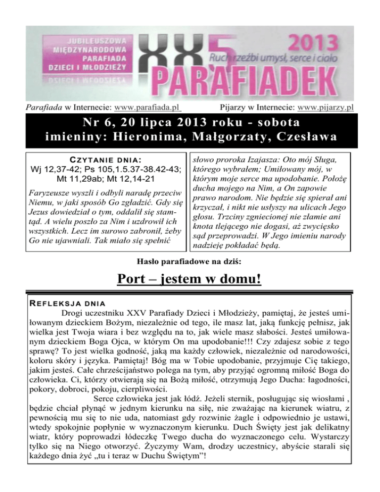 Parafiada w Internecie: www.parafiada.pl Pijarzy w Internecie: www.pijarzy.pl Nr 6, 20 lipca 2013 roku - sobota imieniny: Hieronima, Małgorzaty, Czesława C Z Y T AN I E D N I A : Wj 12,37-42; Ps 105,1.5.37-38.42-43; Mt 11,29ab; Mt 12,14-21 Faryzeusze wyszli i odbyli naradę przeciw Niemu, w jaki sposób Go zgładzić. Gdy się Jezus dowiedział o tym, oddalił się stamtąd. A wielu poszło za Nim i uzdrowił ich wszystkich. Lecz im surowo zabronił, żeby Go nie ujawniali. Tak miało się spełnić słowo proroka Izajasza: Oto mój Sługa, którego wybrałem; Umiłowany mój, w którym moje serce ma upodobanie. Położę ducha mojego na Nim, a On zapowie prawo narodom. Nie będzie się spierał ani krzyczał, i nikt nie usłyszy na ulicach Jego głosu. Trzciny zgniecionej nie złamie ani knota tlejącego nie dogasi, aż zwycięsko sąd przeprowadzi. W Jego imieniu narody nadzieję pokładać będą. Hasło parafiadowe na dziś: Port – jestem w domu! REFLEKSJA DNI A Drogi uczestniku XXV Parafiady Dzieci i Młodzieży, pamiętaj, że jesteś umiłowanym dzieckiem Bożym, niezależnie od tego, ile masz lat, jaką funkcję pełnisz, jak wielka jest Twoja wiara i bez względu na to, jak wiele masz słabości. Jesteś umiłowanym dzieckiem Boga Ojca, w którym On ma upodobanie!!! Czy zdajesz sobie z tego sprawę? To jest wielka godność, jaką ma każdy człowiek, niezależnie od narodowości, koloru skóry i języka. Pamiętaj! Bóg ma w Tobie upodobanie, przyjmuje Cię takiego, jakim jesteś. Całe chrześcijaństwo polega na tym, aby przyjąć ogromną miłość Boga do człowieka. Ci, którzy otwierają się na Bożą miłość, otrzymują Jego Ducha: łagodności, pokory, dobroci, pokoju, cierpliwości. Serce człowieka jest jak łódź. Jeżeli sternik, posługując się wiosłami , będzie chciał płynąć w jednym kierunku na siłę, nie zważając na kierunek wiatru, z pewnością mu się to nie uda, natomiast gdy rozwinie żagle i odpowiednio je ustawi, wtedy spokojnie popłynie w wyznaczonym kierunku. Duch Święty jest jak delikatny wiatr, który poprowadzi łódeczkę Twego ducha do wyznaczonego celu. Wystarczy tylko się na Niego otworzyć. Życzymy Wam, drodzy uczestnicy, abyście starali się każdego dnia żyć „tu i teraz w Duchu Świętym”! strona 2 PARAFIADEK nr 5, 19. 07. 2013 Z ŻYCIA KOŚCIOŁA Z encykliki papieża Franciszka „LUMEN FIDEI” Jednakże kiedy mówimy o tym świetle wiary, możemy spotkać się z zastrzeżeniem ze strony współczesnych nam ludzi. W nowożytnej epoce uznano, że takie światło mogło wystarczyć starożytnym społeczeństwom, ale nie jest potrzebne w nowych czasach, kiedy człowiek stał się dojrzały, szczyci się swoim rozumem, pragnie w nowy sposób badać przyszłość. W tym sensie wiara jawiła się jako światło iluzoryczne, przeszkadzające człowiekowi w odważnym zdobywaniu wiedzy. Młody Nietzsche zachęcał swoją siostrę Elżbietę, by podjęła ryzyko, przemierzając «nowe drogi [...] w niepewności autonomicznego posuwania się naprzód». I dodawał: «W tym punkcie rozchodzą się drogi ludzkości: jeśli chcesz osiągnąć pokój duszy i szczęście, to wierz, ale jeśli chcesz być uczniem prawdy, wówczas badaj»3. Wierzenie rzekomo przeciwstawia się poszukiwaniu. Wychodząc z tego założenia, Nietzsche będzie krytykował chrześcijaństwo za to, że pomniejszyło zasięg ludzkiej egzystencji, pozbawiając życie nowości i przygody. Wiara stanowiłaby więc iluzję światła, utrudniającą nam, ludziom wolnym, drogę ku przyszłości. Czy wiesz że…? Każdy sport, który pojawi się na igrzyskach olimpijskich musi opierać się na sile ludzkich mięśni - taki jest wymóg MKOL muszą spełniać dyscypliny sportowe, które chciałyby dołączyć do listy sportów olimpijskich. Z tego właśnie powodu nigdy nie pojawiły się na nich sporty motorowe lub motorowodne. Sport olimpijski musi też być na tyle popularny, żeby był uprawiany przynajmniej w 75 krajach na czterech różnych kontynentach. W telewizji badminton wygląda jak lekka, przyjemna i niemęcząca gra. Żadnych głośnych krzyków przy odbiciach, żadnego dalekiego biegania. Tymczasem okazuje się, że tenisista w ciągu meczu przebiega ok. 3,5 km, a osoba grająca w badmintona dwa razy więcej. Wszystko przez tempo gry - badmintoniści odbijają lotkę średnio co dwie sekundy, a tenisiści co cztery. Jedna wymiana w tenisie to (średnio) 3,4 odbicia, w badmintonie - aż 13,5! Do tego dochodzi jeszcze jedna ważna informacja - lotka po uderzeniu może osiągnąć prędkość nawet 300 km/h - tenisowe serwy wydają się być przy tym wykonywane w żółwim tempie. Zastanawiałeś się kiedyś, grając w szachy, na ile sposobów mógłbyś rozegrać dana turę? Mógłbyś spróbować policzyć wszystkie możliwe kombinacje, jednak musiałbyś mieć raczej procesor zamiast mózgu. W samych pierwszych 4 turach możliwych jest ponad 300 000 000 000 kombinacji! Konkretnie na 318 979 564 000 sposobów. Z kolei pierwsze 10 tur to już 169 kwadryliardów, czyli 169*10^27. To dlatego nawet najpotężniejsze komputery mają problemy z wygrywaniem z człowiekiem, a za słynnymi tryumfami maszyn i tak najczęściej (choć nieoficjalnie) stoją grupy, jak najbardziej ludzkich, arcymistrzów. Piłeczki golfowe mają na swojej powierzchni małe dołki. Opór powietrza przy gładkiej piłeczce jest dwa razy większy niż przy wgłębieniach. A mniejszy opór skutkuje oczywiście zwiększeniem dystansu. Liczba i rozmieszczenie dziureczek na powierzchni piłki również nie są przypadkowe. PARAFIADEK SPORTOWY nr 5, 19. 07. 2013 strona 3 W YNI KI ZAWODÓW 1 2 3 4 5 1 2 3 4 5 1 2 3 4 5 1 2 3 4 4 5 1 Ringo chłopców Podstawówka Mateusz Pełka Poznań Jakub Koczorowski Poznań Andriy Zmyslyy Bóbrka Wojciech Górecki Kraków Jakub Sobiehraj Brody Biathlon letni dziewcząt Gimnazjum Beata Achramowicz Agnieszka Hyrnik Justyna Kałaszewska Viktorija Kuli