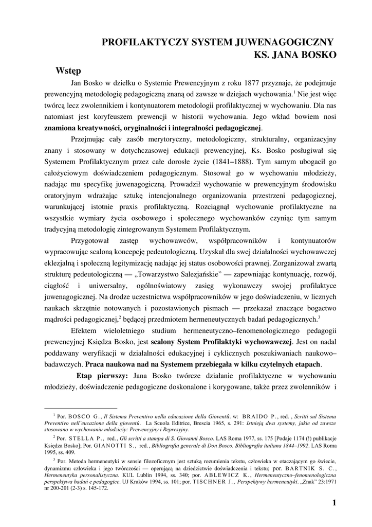 PROFILAKTYCZY SYSTEM JUWENAGOGICZNY KS. JANA BOSKO Wstęp Jan Bosko w dziełku o Systemie Prewencyjnym z roku 1877 przyznaje, że podejmuje prewencyjną metodologię pedagogiczną znaną od zawsze w dziejach wychowania. 1 Nie jest więc twórcą lecz zwolennikiem i kontynuatorem metodologii profilaktycznej w wychowaniu. Dla nas natomiast jest koryfeuszem prewencji w historii wychowania. Jego wkład bowiem nosi znamiona kreatywności, oryginalności i integralności pedagogicznej. Przejmując cały zasób merytoryczny, metodologiczny, strukturalny, organizacyjny znany i stosowany w dotychczasowej edukacji prewencyjnej, Ks. Bosko posługiwał się Systemem Profilaktycznym przez całe dorosłe życie (1841–1888). Tym samym ubogacił go całożyciowym doświadczeniem pedagogicznym. Stosował go w wychowaniu młodzieży, nadając mu specyfikę juwenagogiczną. Prowadził wychowanie w prewencyjnym środowisku oratoryjnym wdrażając sztukę intencjonalnego organizowania przestrzeni pedagogicznej, warunkującej istotnie praxis profilaktyczną. Rozciągnął wychowanie profilaktyczne na wszystkie wymiary życia osobowego i społecznego wychowanków czyniąc tym samym tradycyjną metodologię zintegrowanym Systemem Profilaktycznym. Przygotował zastęp wychowawców, współpracowników i kontynuatorów wypracowując scaloną koncepcję pedeutologiczną. Uzyskał dla swej działalności wychowawczej eklezjalną i społeczną legitymizację nadając jej status osobowości prawnej. Zorganizował zwartą strukturę pedeutologiczną — „Towarzystwo Salezjańskie” — zapewniając kontynuację, rozwój, ciągłość i uniwersalny, ogólnoświatowy zasięg wykonawczy swojej profilaktyce juwenagogicznej. Na drodze uczestnictwa współpracowników w jego doświadczeniu, w licznych naukach skrzętnie notowanych i pozostawionych pismach — przekazał znaczące bogactwo mądrości pedagogicznej,2 będącej przedmiotem hermeneutycznych badań pedagogicznych.3 Efektem wieloletniego studium hermeneutyczno–fenomenologicznego pedagogii prewencyjnej Księdza Bosko, jest scalony System Profilaktyki wychowawczej. Jest on nadal poddawany weryfikacji w działalności edukacyjnej i cyklicznych poszukiwaniach naukowo– badawczych. Praca naukowa nad na Systemem przebiegała w kilku czytelnych etapach. Etap pierwszy: Jana Bosko twórcze działanie profilaktyczne w wychowaniu młodzieży, doświadczenie pedagogiczne doskonalone i korygowane, także przez zwolenników i 1 Por. B O S C O G . , Il Sistema Preventivo nella educazione della Giovent ù. w: B R A I D O P . , red. , Scritti sul Sistema Preventivo nell`eucazione della gioventù. La Scuola Editrice, Brescia 1965, s. 291: Istnieją dwa systemy, jakie od zawsze stosowano w wychowaniu młodzieży: Prewencyjny i Represyjny. 2 Por. S T E L L A P . , red. , Gli scritti a stampa di S. Giovanni Bosco. LAS Roma 1977, ss. 175 [Podaje 1174 (!) publikacje Księdza Bosko]; Por. G I A N O T T I S . , red. , Bibliografia generale di Don Bosco. Bibliografia italiana 1844–1992. LAS Roma 1995, ss. 409. 3 Por. Metoda hermeneutyki w sensie filozoficznym jest sztuką rozumienia tekstu, człowieka w otaczającym go świecie, dynamizmu człowieka i jego twórczości — operującą na dziedzictwie doświadczenia i tekstu; por. B A R T N I K S . C . , Hermeneutyka personalistyczna. KUL Lublin 1994, ss. 340; por. A B L E W I C Z K . , Hermeneutyczno–fenomenologiczna perspektywa badań e pedagogice. UJ Kraków 1994, ss. 101; por. T I S C H N E R J . , Perspektywy hermeneutyki. „Znak” 23:1971 nr 200-201 (2-3) s. 145-172. 1 kontynuatorów, jego odczytanie, opis i eksplikacja, docieranie do istoty problemów oraz sedna jego sensu pedagogicznego. Etap drugi: Formułowanie i prezentacja doświadczenia pedagogicznego Ks. Jana Bosko w jego typowych przemyśleniach, przekonaniach, rozwiązaniach, wytycznych, normach, zasadach, strategiach, planach i działaniach pedagogicznych wobec młodzieży — tworzących oryginalny paradygmat profilaktyki pedagogicznej.4 Etap trzeci: Uporządkowanie profilaktycznych zasad wychowawczych Jana Bosko na poziomie teoretycznego uogólnienia, w oparciu o osiągnięcia naukowe teorii wychowania — według niezbywalnych wymogów edukacji integralnej i integrującej.5 Etap czwarty: Oświetlenie i uzasadnienie tożsamości oraz układu zasad profilaktyki pedagogicznej Jana Bosko na obszarze filozofii personalistycznej w wykonawczych normach personalistycznej filozofii edukacji osoby. Etap piąty: Zasady personalistycznego wychowania znajdujące się w głębokim tle profilaktyki pedagogicznej Jana Bosko kondensują się principiach ogólnych edukacji osoby sformułowanych przez personalizm na poziomie praktycznym. Etap szósty: Zaplecze spekulatywne doświadczenia pedagogicznego Jana Bosko jest koherentne z wyodrębnionym i zwerbalizowanym w XX w. personalizmem, który ma właściwy sobie paradygmat filozoficzny: spojrzenie na rzeczywistość przez pryzmat osoby. W niej bowiem skondensowana jest wszelka doskonałość bytu, w niej zwiera się rzeczywistość obiektywna i subiektywna, język i jego analityka.6 Integralne ujęcie Systemu Prewencyjnego Jana Bosko w całej rozciągłości wszystkich etapów rozwojowych byłoby zbyt obszerne i przekracza granice niniejszego opracowania. Stąd ogranicza się niniejszą prezentacje do rekapitulacji Zasad uporządkowanych według istotnych elementów pedagogicznych opisywanych przez teorię wychowania. Co w praktyce implikuje logiczny układ: 1) Konieczne uściślenia semantyczne; 2) Wychowanek — podmiot sprawczy efektu wychowawczego; 3) Wychowawca — podmiot sprawczy pedagogicznych działań profilaktycznych; 4) Proces wychowawczy — integrujący rdzeń działań pedagogicznych i rozwoju wychowanka; 5) Intersubiektywność — międzypodmiotowe relacje wychowawcze, stanowiące pierwszorzędne pole oddziaływań wychowawczych; 6) Środowisko profilaktyczne — w sposób zamierzony konstruowana przestrzeń