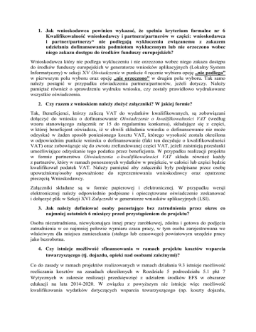 1. Jak wnioskodawca powinien wykazać, że spełnia kryterium formalne nr 6 Kwalifikowalność wnioskodawcy i partnera/partnerów w części: wnioskodawca i partner/partnerzy* nie podlegają wykluczeniu związanemu z zakazem udzielania dofinansowania podmiotom wykluczonym lub nie orzeczono wobec niego zakazu dostępu do środków funduszy europejskich? Wnioskodawca który nie podlega wykluczeniu i nie orzeczono wobec niego zakazu dostępu do środków funduszy europejskich w generatorze wniosków aplikacyjnych (Lokalny System Informatyczny) w sekcji XV Oświadczenie w punkcie 4 ręcznie wybiera opcję „nie podlega” w pierwszym polu wyboru oraz opcję „nie orzeczono” w drugim polu wyboru. Tak samo należy postąpić w przypadku oświadczenia partnera/partnerów, jeżeli dotyczy. Należy pamiętać również o sprawdzeniu wydruku wniosku, czy zostały prawidłowo wydrukowane wszystkie oświadczenia. 2. Czy razem z wnioskiem należy złożyć załączniki? W jakiej formie? Tak, Beneficjenci, którzy zaliczą VAT do wydatków kwalifikowanych, są zobowiązani dołączyć do wniosku o dofinansowanie Oświadczenie o kwalifikowalności VAT (według wzoru stanowiącego załącznik nr 15 do regulaminu konkursu), składające się z części, w której beneficjent oświadcza, iż w chwili składania wniosku o dofinansowanie nie może odzyskać w żaden sposób poniesionego kosztu VAT, którego wysokość została określona w odpowiednim punkcie wniosku o dofinansowanie (fakt ten decyduje o kwalifikowalności VAT) oraz zobowiązuje się do zwrotu zrefundowanej części VAT, jeżeli zaistnieją przesłanki umożliwiające odzyskanie tego podatku przez beneficjenta. W przypadku realizacji projektu w formie partnerstwa Oświadczenia o kwalifikowalności VAT składa również każdy z partnerów, który w ramach ponoszonych wydatków w projekcie, w całości lub części będzie kwalifikował podatek VAT. Należy pamiętać aby załączniki były podpisane przez osobę upoważnioną/osoby upoważnione do reprezentowania wnioskodawcy oraz opatrzone pieczęcią Wnioskodawcy. Załączniki składane są w formie papierowej i elektronicznej. W przypadku wersji elektronicznej należy odpowiednio podpisane i opieczętowane oświadczenie zeskanować i dołączyć plik w Sekcji XVI Załączniki w generatorze wniosków aplikacyjnych (LSI). 3. Jak należy definiować osoby pozostające bez zatrudnienia przez okres co najmniej ostatnich 6 miesięcy przed przystąpieniem do projektu? Osoba niezatrudniona, niewykonująca innej pracy zarobkowej, zdolna i gotowa do podjęcia zatrudnienia w co najmniej połowie wymiaru czasu pracy, w tym osoba zarejestrowana we właściwym dla miejsca zamieszkania (stałego lub czasowego) powiatowym urzędzie pracy jako bezrobotna. 4. Czy istnieje możliwość sfinansowania w ramach projektu kosztów wsparcia towarzyszącego (tj. dojazdu, opieki nad osobami zależnymi)? Co do zasady w ramach projektów realizowanych w ramach działania 9.3 istnieje możliwość rozliczania kosztów na zasadach określonych w Rozdziale 5 podrozdziału 5.1 pkt 7 Wytycznych w zakresie realizacji przedsięwzięć z udziałem środków EFS w obszarze edukacji na lata 2014-2020. W związku z powyższym nie istnieje więc możliwość kwalifikowania wydatków dotyczących wsparcia towarzyszącego (np. koszty dojazdu, organizacji opieki nad osobami zależnymi), które nie mieszczą się w ramach wskazanych w w/w Wytycznych stawkach jednostkowych. 5. Zgodnie z Wytycznymi w zakresie realizacji przedsięwzięć z udziałem środków EFS w obszarze edukacji na lata 2014-2020 w przypadku kompetencji językowych zakres wsparcia obejmuje wyłącznie szkolenia kończące się certyfikatem zewnętrznym potwierdzającym zdobycie przez uczestników projektów określonego poziomu biegłości językowej (zgodnie z Europejskim Systemem Opisu Kształcenia Językowego). Europejski System Opisu Kształcenia Językowego znany również jako The Common European Framework of Reference for Languages (CEFRL lub CEF) definiuje 6 poziomów zaawansowania i opisuje umiejętności językowe czytania, pisania, słuchania i mówienia jakie powinien posiadać uczący się na każdym z tych poziomów (A1, A2, B1, B2, C1, C2). W związku z powyższym: Czy oznacza to, że egzamin zewnętrzny, a tym samym wydany na jego podstawie certyfikat zewnętrzny potwierdzający zdobycie określonego poziomu biegłości językowej musi dotyczyć wszystkich ww. obszarów tj. czytania, pisania, słuchania i mówienia? Czy w ramach ww. wsparcia można przeprowadzić kursy językowe np.: angielski biznesowy, techniczny, hotel & restauracja? Czy też kursy muszą dotyczyć wyłącznie angielskiego ogólnego, uwzględniając opis systemu ESOKJ? tj. np.: osoba posługująca się językiem na poziomie B2 potrafi zrozumieć dyskusję z użyciem języka specjalistycznego, jeśli dotyczy tematyki zawodowej. Zgodnie z zapisem rozdziału 5 podrozdział 5.1 punkt 6 Wytycznych MIR w zakresie realizacji przedsięwzięć z udziałem środków EFS w obszarze edukacji na lata 2014-2020 finansowane w ramach RPO mogą być wyłącznie szkolenia kończące się certyfikatem zewnętrznym potwierdzającym zdobycie przez uczestników projektów określonego poziomu biegłości językowej zgodnie z ESOKJ (Europejskim Systemem Opisu Kształcenia Językowego). Wytyczne nie precyzują zatem, czy certyfikat zewnętrzny powinien dotyczyć wszystkich obszarów, o których mówi ESOKJ. Należy stwierdzić, że przesłanka zgodności z Wytycznymi zostanie wypełniona w momencie uzyskania przez uczestnika projektu certyfikatu zgodnego ze standardem. Ponadto, nie ma ograniczeń co do realizacji różnego rodzaju specjalistycznych szkoleń i kursów językowych odnoszących się do określonej branży, czy wymagań językowych. Podmiot realizujący wsparcie powinien zagwarantować, że szkolenia te będą realizowane zgodnie ze standardem ESOKJ. 6. Czy kwalifikowalny jest koszt eg