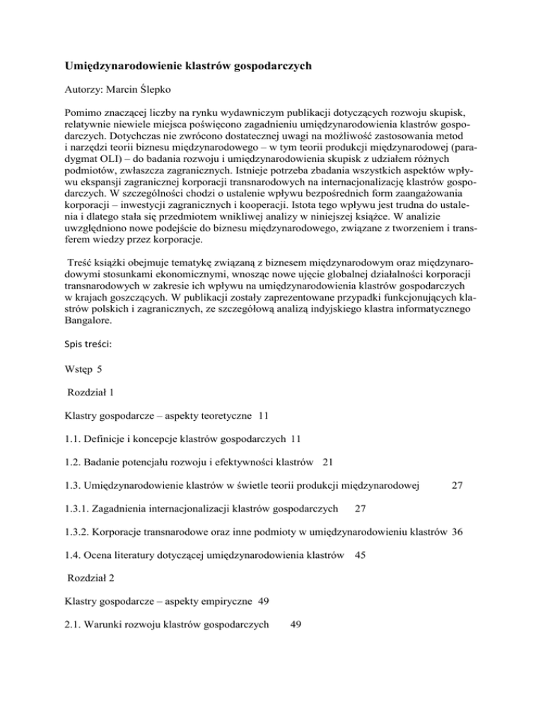 Umiędzynarodowienie klastrów gospodarczych Autorzy: Marcin Ślepko Pomimo znaczącej liczby na rynku wydawniczym publikacji dotyczących rozwoju skupisk, relatywnie niewiele miejsca poświęcono zagadnieniu umiędzynarodowienia klastrów gospodarczych. Dotychczas nie zwrócono dostatecznej uwagi na możliwość zastosowania metod i narzędzi teorii biznesu międzynarodowego – w tym teorii produkcji międzynarodowej (paradygmat OLI) – do badania rozwoju i umiędzynarodowienia skupisk z udziałem różnych podmiotów, zwłaszcza zagranicznych. Istnieje potrzeba zbadania wszystkich aspektów wpływu ekspansji zagranicznej korporacji transnarodowych na internacjonalizację klastrów gospodarczych. W szczególności chodzi o ustalenie wpływu bezpośrednich form zaangażowania korporacji – inwestycji zagranicznych i kooperacji. Istota tego wpływu jest trudna do ustalenia i dlatego stała się przedmiotem wnikliwej analizy w niniejszej książce. W analizie uwzględniono nowe podejście do biznesu międzynarodowego, związane z tworzeniem i transferem wiedzy przez korporacje. Treść książki obejmuje tematykę związaną z biznesem międzynarodowym oraz międzynarodowymi stosunkami ekonomicznymi, wnosząc nowe ujęcie globalnej działalności korporacji transnarodowych w zakresie ich wpływu na umiędzynarodowienia klastrów gospodarczych w krajach goszczących. W publikacji zostały zaprezentowane przypadki funkcjonujących klastrów polskich i zagranicznych, ze szczegółową analizą indyjskiego klastra informatycznego Bangalore. Spis treści: Wstęp 5 Rozdział 1 Klastry gospodarcze – aspekty teoretyczne 11 1.1. Definicje i koncepcje klastrów gospodarczych 11 1.2. Badanie potencjału rozwoju i efektywności klastrów 21 1.3. Umiędzynarodowienie klastrów w świetle teorii produkcji międzynarodowej 1.3.1. Zagadnienia internacjonalizacji klastrów gospodarczych 27 27 1.3.2. Korporacje transnarodowe oraz inne podmioty w umiędzynarodowieniu klastrów 36 1.4. Ocena literatury dotyczącej umiędzynarodowienia klastrów 45 Rozdział 2 Klastry gospodarcze – aspekty empiryczne 49 2.1. Warunki rozwoju klastrów gospodarczych 49 2.2. Klastry na świecie i w Polsce – informacja i charakterystyka 55 2.2.1. Przykłady klastrów na świecie 56 2.2.2. Przykłady klastrów w Polsce 64 2.3. Rozwój i umiędzynarodowienie klastra informatycznego Bangalore 68 2.3.1. Rozwój skupiska Bangalore 69 2.3.2. Znaczenie i rola korporacji transnarodowych w skupisku 73 2.3.3. Bangalore jako przykład ewolucji klastra ku powiązaniom transgranicznym 79 2.3.4. Organizacyjne, instytucjonalne i kulturowe aspekty ewolucji klastra w Bangalore 85 2.4. Ocena roli KTN w rozwoju klastrów gospodarczych w świetle doświadczeń międzynarodowych 91 Rozdział 3 Przemiany korporacyjnych mechanizmów ekspansji zagranicznej i oddziaływań ekonomicznych 95 3.1. Zmiany w kształtowaniu przewag konkurencyjnych przez KTN 95 3.1.1. Kształtowanie konkurencyjności przez KTN 96 3.1.2. Rozwój zasobów strategicznych i przewag konkurencyjnych firm 106 3.2. Ewolucja wykorzystania walorów lokalizacji 115 3.2.1. Zmiany kierunków wykorzystania walorów lokalizacji 3.2.2. Znaczenie mechanizmów aglomeracji 115 124 3.3. Rozwój struktur organizacyjnych korporacji i ich filii zagranicznych 130 3.4. Powiązania kooperacyjne i sieci biznesowe korporacji 139 3.5. Lokalne powiązania, oddziaływania i efekty zewnętrzne z udziałem korporacji transnarodowych 145 3.5.1. Współpraca z lokalnymi dostawcami i odbiorcami 146 3.5.2. Wpływ KTN na regionalne i lokalne rynki czynników wytwórczych i towarów 153 3.6. Ocena mechanizmów inwestycyjnego i kooperacyjnego w oddziaływaniu KTN na rozwój i umiędzynarodowienie klastrów gospodarczych 157 Rozdział 4 Umiędzynarodowienie klastrów gospodarczych – ku syntezie badań 4.1. Podmioty działające w klastrach gospodarczych 163 163 4.2. Procesy rozwoju i umiędzynarodowienie współczesnych klastrów gospodarczych 4.3. Modele oddziaływania korporacji na klastry i ich umiędzynarodowienie 188 4.4. Ocena umiędzynarodowienia klastrów i roli podmiotów w tym procesie 207 Zakończenie 213 Bibliografia 221 Spis rysunków Spis tabel 237 235 176