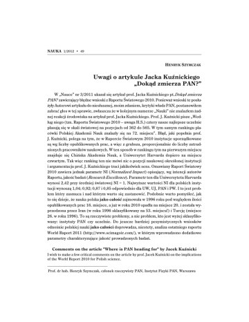 NAUKA 1/2012 • 49 HENRYK SZYMCZAK Uwagi o artykule Jacka Kuźnickiego „Dokąd zmierza PAN?” W „Nauce” nr 3/2011 ukazał się artykuł prof. Jacka Kuźnickiego pt.Dokąd zmierza PAN? zawierający błędne wnioski z Raportu Światowego 2010. Ponieważ wnioski te posłużyły Autorowi artykułu do niesłusznej, moim zdaniem, krytyki władz PAN, postanowiłem zabrać głos w tej sprawie, zwłaszcza że w kolejnym numerze „Nauki” nie znalazłem żadnej reakcji środowiska na artykuł prof. Jacka Kuźnickiego. Prof. J. Kuźnicki pisze „Według niego (tzn. Raportu Światowego 2010 – uwaga H.S.) cztery nasze najlepsze uczelnie plasują się w skali światowej na pozycjach od 362 do 565. W tym samym rankingu placówki Polskiej Akademii Nauk znalazły się na 72. miejscu”. Błąd, jaki popełnia prof. J. Kuźnicki, polega na tym, że w Raporcie Światowym 2010 instytucje uporządkowane są wg liczby opublikowanych prac, a więc z grubsza, proporcjonalnie do liczby zatrudnionych pracowników naukowych. W ten sposób w rankingu tym na pierwszym miejscu znajduje się Chińska Akademia Nauk, a Uniwersytet Harvarda dopiero na miejscu czwartym. Tak więc ranking ten nie mówi nic o pozycji naukowej określonej instytucji i argumentacja prof. J. Kuźnickiego traci jakikolwiek sens. Omawiany Raport Światowy 2010 zawiera jednak parametr NI (Normalized Impact ) opisujący, wg intencji autorów Raportu, jakość badań (Research Excellence). Parametr ten dla Uniwersytetu Harvarda wynosi 2,42 przy średniej światowej NI = 1. Najwyższe wartości NI dla polskich instytucji wynoszą 1,04; 0,92; 0,87 i 0,85 odpowiednio dla UW, UJ, PAN i PW. I to jest problem który zasmuca i nad którym warto się zastanowić. Podobnie warto pomyśleć, jak to się dzieje, że nauka polska jako całość zajmowała w 1996 roku pod względem ilości opublikowanych prac 16. miejsce, a już w roku 2010 spadła na miejsce 20. i została wyprzedzona przez Iran (w roku 1996 sklasyfikowany na 53. miejscu!) i Turcję (miejsce 26. w roku 1996). To są rzeczywiste problemy, a nie problem, kto jest wyżej sklasyfikowany: instytuty PAN czy uczelnie. Do jeszcze bardziej pesymistycznych wniosków odnośnie polskiej nauki jako całości doprowadza, niestety, analiza ostatniego raportu World Raport 2011 (http://www.scimagoir.com/), w którym wprowadzono dodatkowe parametry charakteryzujące jakość prowadzonych badań. Comments on the article "Where is PAN heading for" by Jacek Kuźnicki I wish to make a few critical comments on the article by prof. Jacek Kuźnicki on the implications of the World Report 2010 for Polish science. Prof. dr hab. Henryk Szymczak, członek rzeczywisty PAN, Instytut Fizyki PAN, Warszawa