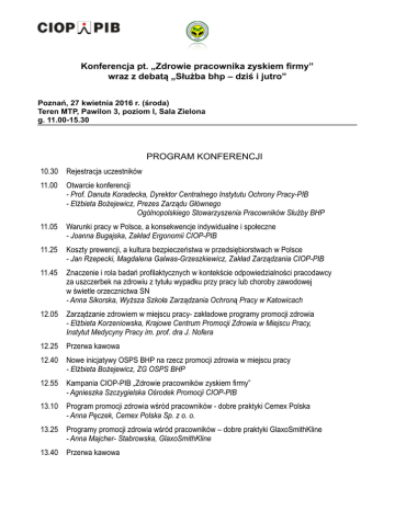 Konferencja pt. „Zdrowie pracownika zyskiem firmy” wraz z debatą „Służba bhp – dziś i jutro” Poznań, 27 kwietnia 2016 r. (środa) Teren MTP, Pawilon 3, poziom I, Sala Zielona g. 11.00-15.30 PROGRAM KONFERENCJI 10.30 Rejestracja uczestników 11.00 Otwarcie konferencji - Prof. Danuta Koradecka, Dyrektor Centralnego Instytutu Ochrony Pracy-PIB - Elżbieta Bożejewicz, Prezes Zarządu Głównego Ogólnopolskiego Stowarzyszenia Pracowników Służby BHP 11.05 Warunki pracy w Polsce, a konsekwencje indywidualne i społeczne - Joanna Bugajska, Zakład Ergonomii CIOP-PIB 11.25 Koszty prewencji, a kultura bezpieczeństwa w przedsiębiorstwach w Polsce - Jan Rzepecki, Magdalena Galwas-Grzeszkiewicz, Zakład Zarządzania CIOP-PIB 11.45 Znaczenie i rola badań profilaktycznych w kontekście odpowiedzialności pracodawcy za uszczerbek na zdrowiu z tytułu wypadku przy pracy lub choroby zawodowej w świetle orzecznictwa SN - Anna Sikorska, Wyższa Szkoła Zarządzania Ochroną Pracy w Katowicach 12.05 Zarządzanie zdrowiem w miejscu pracy- zakładowe programy promocji zdrowia - Elżbieta Korzeniowska, Krajowe Centrum Promocji Zdrowia w Miejscu Pracy, Instytut Medycyny Pracy im. prof. dra J. Nofera 12.25 Przerwa kawowa 12.40 Nowe inicjatywy OSPS BHP na rzecz promocji zdrowia w miejscu pracy - Elżbieta Bożejewicz, ZG OSPS BHP 12.55 Kampania CIOP-PIB „Zdrowie pracowników zyskiem firmy” - Agnieszka Szczygielska Ośrodek Promocji CIOP-PIB 13.10 Program promocji zdrowia wśród pracowników - dobre praktyki Cemex Polska - Anna Pęczek, Cemex Polska Sp. z o. o. 13.25 Programy promocji zdrowia wśród pracowników – dobre praktyki GlaxoSmithKline - Anna Majcher- Stabrowska, GlaxoSmithKline 13.40 Przerwa kawowa PROGRAM DEBATY Prowadzenie: p. redaktor Michał Olszański 14.00 Panel dyskusyjny „Zdrowie pracowników zyskiem firmy” - Prof. Danuta Koradecka, Dyrektor CIOP-PIB - Elżbieta Korzeniowska, kierownik Krajowego Centrum Promocji Zdrowia w Miejscu Pracy, IMP - Anna Majcher- Stabrowska, pełnomocnik dyrektora ds. Systemu Zarządzania Środowiskowego i BHP, GlaxoSmithKline - Grzegorz Szałas, członek Zarządu Głównego OSPS BHP 14.30 Panel dyskusyjny „Wypadek przy pracy – wątpliwości i opinie” - Krzysztof Kowalik, Dyrektor Departamentu Nadzoru i Kontroli, Główny Inspektorat Pracy - Andrzej Nowak, wiceprezes Zarządu Głównego OSPS BHP - Barbara Krzyśków, Zakład Zarządzania CIOP-PIB - Anna Majcher- Stabrowska, GlaxoSmithKline 15.00 Informacja „Integracja środowisk pracowników służby bhp – za i przeciw” – w tym: prezentacja „Samorząd zawodowy służby bhp” - Elżbieta Bożejewicz, Prezes ZG OSPS BHP 15.30 Podsumowanie i zakończenie konferencji i debat
