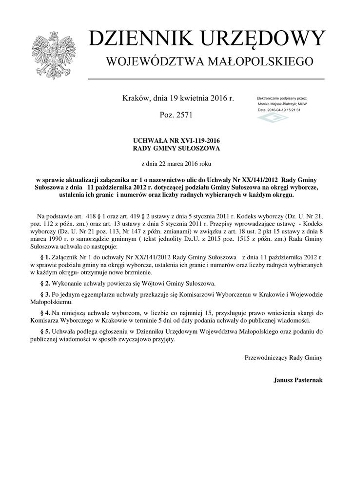 DZIENNIK URZĘDOWY WOJEWÓDZTWA MAŁOPOLSKIEGO Kraków, dnia 19 kwietnia 2016 r. Elektronicznie podpisany przez: Monika Majsak-Białczyk; MUW Poz. 2571 Data: 2016-04-19 15:21:31 UCHWAŁA NR XVI-119-2016 RADY GMINY SUŁOSZOWA z dnia 22 marca 2016 roku w sprawie aktualizacji załącznika nr 1 o nazewnictwo ulic do Uchwały Nr XX/141/2012 Rady Gminy Sułoszowa z dnia 11 października 2012 r. dotyczącej podziału Gminy Sułoszowa na okręgi wyborcze, ustalenia ich granic i numerów oraz liczby radnych wybieranych w każdym okręgu. Na podstawie art. 418 § 1 oraz art. 419 § 2 ustawy z dnia 5 stycznia 2011 r. Kodeks wyborczy (Dz. U. Nr 21, poz. 112 z późn. zm.) oraz art. 13 ustawy z dnia 5 stycznia 2011 r. Przepisy wprowadzające ustawę - Kodeks wyborczy (Dz. U. Nr 21 poz. 113, Nr 147 z późn. zmianami) w związku z art. 18 ust. 2 pkt 15 ustawy z dnia 8 marca 1990 r. o samorządzie gminnym ( tekst jednolity Dz.U. z 2015 poz. 1515 z późn. zm.) Rada Gminy Sułoszowa uchwala co następuje: § 1. Załącznik Nr 1 do uchwały Nr XX/141/2012 Rady Gminy Sułoszowa z dnia 11 października 2012 r. w sprawie podziału gminy na okręgi wyborcze, ustalenia ich granic i numerów oraz liczby radnych wybieranych w każdym okręgu- otrzymuje nowe brzmienie. § 2. Wykonanie uchwały powierza się Wójtowi Gminy Sułoszowa. § 3. Po jednym egzemplarzu uchwały przekazuje się Komisarzowi Wyborczemu w Krakowie i Wojewodzie Małopolskiemu. § 4. Na niniejszą uchwałę wyborcom, w liczbie co najmniej 15, przysługuje prawo wniesienia skargi do Komisarza Wyborczego w Krakowie w terminie 5 dni od daty podania uchwały do publicznej wiadomości. § 5. Uchwała podlega ogłoszeniu w Dzienniku Urzędowym Województwa Małopolskiego oraz podaniu do publicznej wiadomości w sposób zwyczajowo przyjęty. Przewodniczący Rady Gminy Janusz Pasternak Dziennik Urzędowy Województwa Małopolskiego –2– Poz. 2571 Załącznik do Uchwały Nr XVI-119-2016 Rady Gminy Sułoszowa z dnia 22 marca 2016 r. Podział Gminy Sułoszowa na okręgi wyborcze Numer okręgu wyborczego Granice okręgu wyborczego 1 Sułoszowa - obejmuje obręb geodezyjny Sułoszowa I: ul. Cyprysowa, ul. Krakowska od nr 31 do nr 193 (numery nieparzyste), ul. Zielone Wzgórze, ul. Słoneczna od nr 1 do nr 185 (numery nieparzyste) i od nr 2 do nr 198 ( numery parzyste), ul. Wielmoska od nr 25 do nr 199 (numery nieparzyste) i od nr 24 do nr 226 (numery parzyste). Sułoszowa - obejmuje obręb geodezyjny Sułoszowa I: Pieskowa Skała, ul. Graniczna od nr 45 do nr 87 (numery nieparzyste), ul. Herianówka od nr 76 do nr 86 (numery parzyste), ul. Krakowska od nr 195 do nr 293 (numery nieparzyste) i od nr 136 do nr 186 (numery parzyste), ul. Krótka, ul. Nad Źródłem, ul. Parkowa, ul. Podzamcze od nr 68 do nr 110 (numery parzyste) i od nr 1 do nr 3 (numery nieparzyste), ul. Słoneczna od nr 187 do nr 227 (numery nieparzyste) i od nr 200 do nr 246 (numery parzyste), ul. Spacerowa, ul. Stroma od nr 24 do nr 62 (numery parzyste) i od nr 7 do nr 41 (numery nieparzyste), ul. Wąwozowa, ul. WichroweWzgórze, ul. Wspólna, ul. Zamkowa od nr 48 do nr 64 (numery parzyste). Sułoszowa - obejmuje obręb geodezyjny Sułoszowa I: ul. Bankowa, ul. Kościelna, ul. Kasztanowa, ul. ks. bpaMiłosława Kołodziejczyka nr 14, ul. Krakowska od nr 12 do nr 134 (numery parzyste), ul. Kręta, ul. Południowa, ul. Stroma od nr 2 do nr 22 ( numery parzyste) i od nr 1 do nr 5 (numery nieparzyste), ul. Szkolna od nr 1 do nr 13 (numery nieparzyste), ul. Szlachetna, ul. Zdrowa. Sułoszowa - obejmuje obręb geodezyjny Sułoszowa II: ul. Olkuska od nr 52 do nr 226 (numery parzyste), ul. Źródlana od nr 1 do nr 19 (numery nieparzyste) i od nr 2 do nr 10 (numery parzyste). Sułoszowa - obejmuje obręb geodezyjny Sułoszowa II: ul. Krakowska od nr 1 do nr 29 (numery nieparzyste) i od nr 2 do nr 10(numery parzyste), ul. ks. bpa Miłosława Kołodziejczyka od nr 1 do nr 5 (numery nieparzyste) i od nr 2 do nr 12 (numery parzyste), ul. Olkuska od nr 2 do nr 50 (numery parzyste) i od nr 1 do nr 51 (numery nieparzyste), ul. Przegińska, ul. Skalna, ul. Szkolna od nr 2 do nr 16 (numery parzyste), ul. Źródlana od nr 12 do nr 80 (numery parzyste) i od nr 21 do nr 91 (numery nieparzyste), ul. Wielmoska od nr 1 do nr 23 (numery nieparzyste) i od nr 2 do nr 22 (numery parzyste). 2 3 4 5 6 7 8 9 Sułoszowa - obejmuje obręb geodezyjny Sułoszowa II: ul. Olkuska od nr 53 do nr 267 (numery nieparzyste). Sułoszowa - obejmuje obręb geodezyjny Sułoszowa III: ul. Dworska, ul. Leśna, ul. Olkuska od nr 382 do nr 568 (numery parzyste), ul. Świerkowa. Sułoszowa - obejmuje obręb geodezyjny Sułoszowa III: ul. Olkuska od nr 228 do nr 380 (numery parzyste) i od nr 269 do nr 279 (numery nieparzyste). Sułoszowa - obejmuje obręb geodezyjny Sułoszowa III: Ilość radnych wybieranych w okręgu wyborczym 1 1 1 1 1 1 1 1 1 Dziennik Urzędowy Województwa Małopolskiego 10 11 12 13 14 15 –3– ul. Jesionowa, ul. Olkuska od nr 281 do nr 499 (numery nieparzyste), ul. Sosnowa. Wola Kalinowska - obejmuje obręb geodezyjny Wola Kalinowska: ul. Jurajska, ul. Młynnik, ul. Prądnicka, ul. Herianówka od 88 do nr 90 (numery parzyste), ul. Stroma, ul. Widokowa, ul. Zielna. Wola Kalinowska - obejmuje obręb geodezyjny Wola Kalinowska: ul. Dworska, ul. Kalinów, ul. Kaliski, ul. Kapkazy, ul. Leśna, ul. Młyny, ul. Ojcowska, l. Parkowa, ul. Rowerowa, ul. Sąspowska, ul. Słupianka, ul. Spacerowa, ul. Szkolna, ul. Węgielnik. Wielmoża - obejmuje obręb geodezyjny Wielmoża: ul. Alternatywy, ul. Długa od nr 1 do nr 203 (numery nieparzyste) i od nr 6 do nr 232 (numery parzyste), ul. Grodzka od nr 34 do nr 78 (numery parzyste) i od nr 35 do nr 53 (numery nieparzyste). Wielmoża - obejmuje obręb geodezyjny Wielmoża: ul. Długa od nr 2 do nr 4 (numery parzyste), ul. Graniczna od nr 20 do nr 88 (numery parzyste), Grodzka od nr 2 do nr 32 (numery parzyste) i od nr 1 do nr 33 (numery nieparzyste), ul. Krótka, ul. Poprzeczna, 