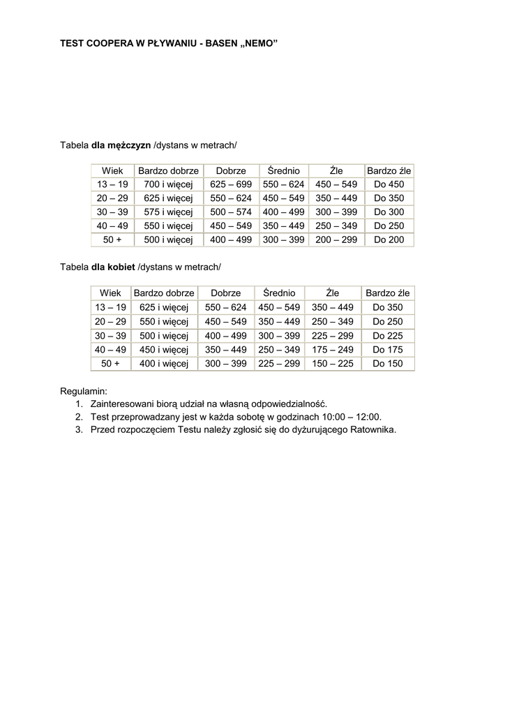 TEST COOPERA W PŁYWANIU - BASEN „NEMO” Tabela dla mężczyzn /dystans w metrach/ Wiek 13 – 19 20 – 29 30 – 39 40 – 49 50 + Bardzo dobrze 700 i więcej 625 i więcej 575 i więcej 550 i więcej 500 i więcej Dobrze 625 – 699 550 – 624 500 – 574 450 – 549 400 – 499 Średnio 550 – 624 450 – 549 400 – 499 350 – 449 300 – 399 Źle 450 – 549 350 – 449 300 – 399 250 – 349 200 – 299 Bardzo źle Do 450 Do 350 Do 300 Do 250 Do 200 Tabela dla kobiet /dystans w metrach/ Wiek Bardzo dobrze Dobrze Średnio Źle Bardzo źle 13 – 19 625 i więcej 550 – 624 450 – 549 350 – 449 Do 350 20 – 29 30 – 39 40 – 49 50 + 550 i więcej 500 i więcej 450 i więcej 400 i więcej 450 – 549 400 – 499 350 – 449 300 – 399 350 – 449 300 – 399 250 – 349 225 – 299 250 – 349 225 – 299 175 – 249 150 – 225 Do 250 Do 225 Do 175 Do 150 Regulamin: 1. Zainteresowani biorą udział na własną odpowiedzialność. 2. Test przeprowadzany jest w każda sobotę w godzinach 10:00 – 12:00. 3. Przed rozpoczęciem Testu należy zgłosić się do dyżurującego Ratownika.