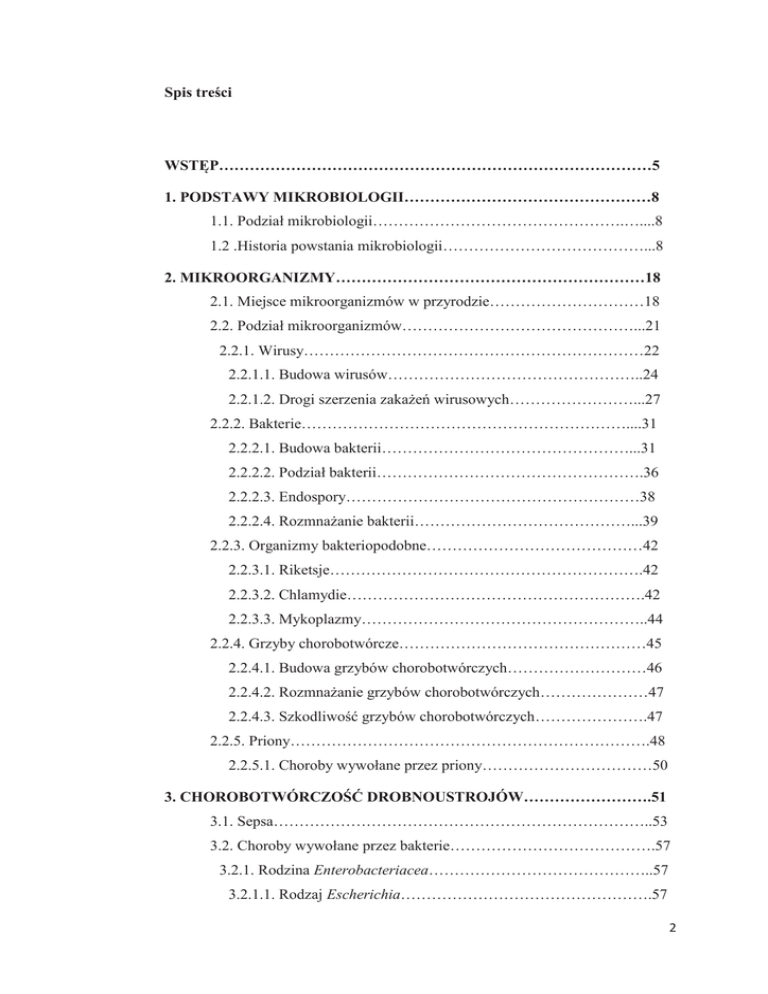 Spis treści WSTĘP…………………………………………………………………………5 1. PODSTAWY MIKROBIOLOGII…………………………………………8 1.1. Podział mikrobiologii………………………………………….…....8 1.2 .Historia powstania mikrobiologii…………………………………...8 2. MIKROORGANIZMY……………………………………………………18 2.1. Miejsce mikroorganizmów w przyrodzie…………………………18 2.2. Podział mikroorganizmów………………………………………...21 2.2.1. Wirusy…………………………………………………………22 2.2.1.1. Budowa wirusów…………………………………………..24 2.2.1.2. Drogi szerzenia zakażeń wirusowych……………………...27 2.2.2. Bakterie………………………………………………………....31 2.2.2.1. Budowa bakterii…………………………………………...31 2.2.2.2. Podział bakterii…………………………………………….36 2.2.2.3. Endospory…………………………………………………38 2.2.2.4. Rozmnażanie bakterii……………………………………...39 2.2.3. Organizmy bakteriopodobne……………………………………42 2.2.3.1. Riketsje…………………………………………………….42 2.2.3.2. Chlamydie………………………………………………….42 2.2.3.3. Mykoplazmy………………………………………………..44 2.2.4. Grzyby chorobotwórcze…………………………………………45 2.2.4.1. Budowa grzybów chorobotwórczych………………………46 2.2.4.2. Rozmnażanie grzybów chorobotwórczych…………………47 2.2.4.3. Szkodliwość grzybów chorobotwórczych………………….47 2.2.5. Priony…………………………………………………………….48 2.2.5.1. Choroby wywołane przez priony……………………………50 3. CHOROBOTWÓRCZOŚĆ DROBNOUSTROJÓW…………………….51 3.1. Sepsa………………………………………………………………..53 3.2. Choroby wywołane przez bakterie………………………………….57 3.2.1. Rodzina Enterobacteriacea……………………………………..57 3.2.1.1. Rodzaj Escherichia………………………………………….57 2 3.2.1.2. Rodzaj Salmonella…………………………………………...62 3.2.1.3. Rodzaj Shigella………………………………………………65 3.2.1.4. Rodzaj Proteus………………………………………………66 3.2.1.5. Rodzaj Serratia………………………………………………67 3.2.1.6. Rodzaj Yersinia……………………………………………....68 3.2.1.7. Rodzaj Klebsiella…………………………………………….72 3.2.2. Rodzina Pseudomonadaceae…………………………………….73 3.2.3. Rodzina Listeriaceae…………………………………………….75 3.2.3.1 Rodzaj Listeria……………………………………………......75 3.2.4. Rodzina Bacillaceae……………………………………………..79 3.2.4.1. Rodzaj Bacillus……………………………………………….80 3.2.4.2. Rodzaj Clostridium…………………………………………...84 3.2.5. Rodzina Mycobacteriaceae………………………………………89 3.2.5.1. Rodzaj Mycobacterium……………………………………….89 3.3. Choroby wywołane przez wirusy……………………………………95 3.3.1. Wirusowe zapalenie wątroby typu C…………………………….95 3.3.2. Norowirusy………………………………………………………99 4. PODSTAWOWE METODY ZWALCZANIA DROBNOUSTROJÓW..100 4.1. Sterylizacja…………………………………………………………102 4.2. Metody fizyczne……………………………………………………104 4.3. Dezynfekcja chemiczna i jej znaczenie…………………………….105 5. CHARAKTERYSTYKA I PODZIAŁ CHEMICZNYCH ŚRODKÓW DEZYNFEKCYJNYCH………………………………………………………106 5.1. Pochodne fenolu……………………………………………………106 5.2. Związki z aktywnym chlorem……………………………………...106 5.3. Związki utleniające…………………………………………………107 5.4. Alkohole……………………………………………………………107 5.5. Aldehydy…………………………………………………………..108 5.6. Związki powierzchniowo czynne…………………………………..109 5.7. Inne…………………………………………………………………109 6. METODY PROWADZENIA ZABIEGÓW DEZYNFEKCYJNYCH….110 6.1. Dezynfekcja w obszarze medycznym……………………………...110 6.2. Dezynfekcja w pomieszczeniach inwentarskich 3 6.3. Dezynfekcja w przemyśle spożywczym 6.4. Dezynfekcja wody 6.4.1. Dezynfekcja studni i ujęć wodnych 6.4.2. Dezynfekcja basenów 6.5. Dezynfekcja w szczególnych sytuacjach 6.5.1. Dezynfekcja na terenach dotkniętych powodzią 6.5.2. Dezynfekcja mieszkań i pojazdów po zmarłym 7. TOKSYCZNOŚĆ PREPARATÓW DEZYNFEKCYJNYCH 8. BHP 4 WSTĘP Choroby zakaźne towarzyszą człowiekowi od dnia narodzin aż do śmierci. Ich sprawcą są drobnoustroje chorobotwórcze. W ciągu milionów lat ewolucji mikroorganizmy do perfekcji opanowały sztukę przetrwania i stały się naszym nieodłącznym towarzyszem. Bez naszej zgody skolonizowały każdy nawet najmniejszy fragment naszego ciała. Produkują w naszych organizmach witaminy. Mają wpływ na wszystkie dziedziny naszego życia. Odpowiedzialne są za obieg węgla, azotu i siarki na naszej planecie. Żyjąc w symbiozie z roślinami przyczyniają się do użyźniania gleby. Potrafią oczyścić ścieki z najbardziej toksycznych związków. Wykorzystywane są do produkcji se