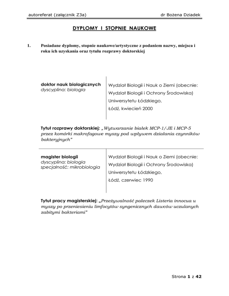 autoreferat - Wydział Biologii i Ochrony Środowiska