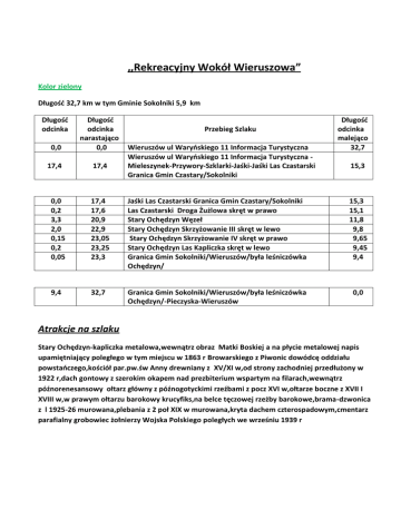 ,,Rekreacyjny Wokół Wieruszowa” Kolor zielony Długość 32,7 km w tym Gminie Sokolniki 5,9 km Długość odcinka 0,0 Długość odcinka narastająco 0,0 17,4 17,4 Przebieg Szlaku Wieruszów ul Waryńskiego 11 Informacja Turystyczna Wieruszów ul Waryńskiego 11 Informacja Turystyczna Mieleszynek-Przywory-Szklarki-Jaśki-Jaśki Las Czastarski Granica Gmin Czastary/Sokolniki Długość odcinka malejąco 32,7 15,3 0,0 0,2 3,3 2,0 0,15 0,2 0,05 17,4 17,6 20,9 22,9 23,05 23,25 23,3 Jaśki Las Czastarski Granica Gmin Czastary/Sokolniki Las Czastarski Droga Żużlowa skręt w prawo Stary Ochędzyn Węzeł Stary Ochędzyn Skrzyżowanie III skręt w lewo Stary Ochędzyn Skrzyżowanie IV skręt w prawo Stary Ochędzyn Las Kapliczka skręt w lewo Granica Gmin Sokolniki/Wieruszów/była leśniczówka Ochędzyn/ 15,3 15,1 11,8 9,8 9,65 9,45 9,4 9,4 32,7 Granica Gmin Sokolniki/Wieruszów/była leśniczówka Ochędzyn/-Pieczyska-Wieruszów 0,0 Atrakcje na szlaku Stary Ochędzyn-kapliczka metalowa,wewnątrz obraz Matki Boskiej a na płycie metalowej napis upamiętniający poległego w tym miejscu w 1863 r Browarskiego z Piwonic dowódcę oddziału powstańczego,kościół par.pw.św Anny drewniany z XV/XI w,od strony zachodniej przedłużony w 1922 r,dach gontowy z szerokim okapem nad prezbiterium wspartym na filarach,wewnątrz późnorenesansowy ołtarz główny z późnogotyckimi rzeźbami z pocz XVI w,ołtarze boczne z XVII I XVIII w,w prawym ołtarzu barokowy krucyfiks,na belce tęczowej rzeżby barokowe,brama-dzwonica z l 1925-26 murowana,plebania z 2 poł XIX w murowana,kryta dachem czterospadowym,cmentarz parafialny grobowiec żołnierzy Wojska Polskiego poległych we wrześniu 1939 r