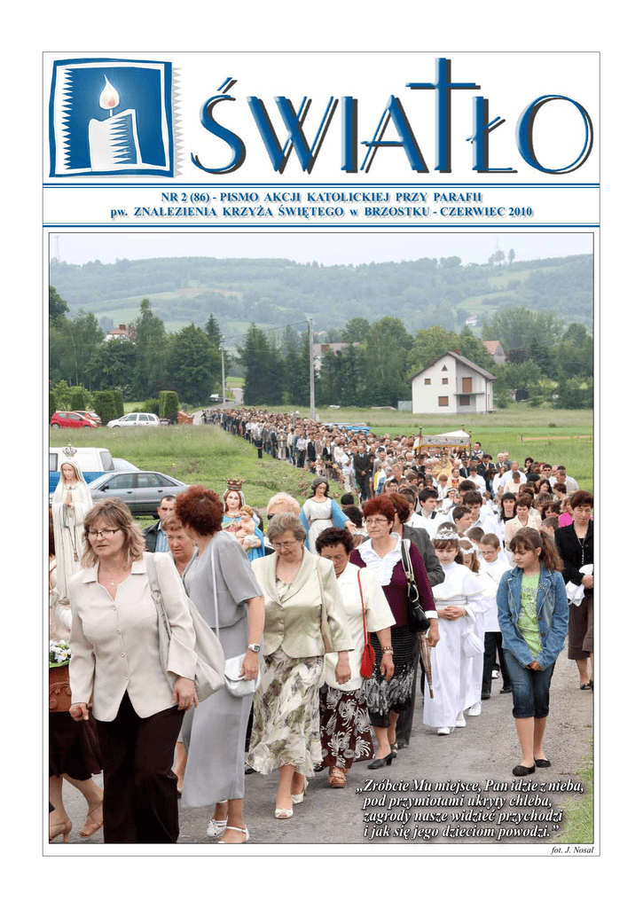 NR 2 (86) - PISMO AKCJI KATOLICKIEJ PRZY PARAFII pw. ZNALEZIENIA KRZYŻA ŚWIĘTEGO w BRZOSTKU - CZERWIEC 2010 „Zróbcie Mu miejsce, Pan idzie z nieba, pod przymiotami ukryty chleba, zagrody nasze widzieć przychodzi i jak się jego dzieciom powodzi.” fot. J. Nosal W obiektywie CZERWIEC 2010 „ŚWIATŁO” 2 Uroczystość Bożego Ciała Zakończenie oktawy Bożego Ciała fot. J. Nosal CZERWIEC 2010 „ŚWIATŁO” W czerwcu przypada uroczystość Bożego Ciała, kiedy to składamy Bogu dziękczynienie za dar Najświętszego Ciała i Krwi Pańskiej i w sposób szczególny czcimy Najświętszy Sakrament. Prawdziwy wzór oddawania tej czci ukazują nam aniołowie, którzy Przed Najświętszym Sakramentem padają na twarz. Tak przecież zachował się Anioł, który w Fatimie ukazał się pastuszkom. Najpierw upadł na kolana przed białą Hostią i skłonił się Jej tak nisko, że dotknął ziemi czołem, a dopiero potem udzielił dzieciom Komunii św. Następnie nauczył pastuszków wspaniałej modlitwy uwielbienia, którą wspólnie z nimi odmawiał wielokrotnie: Przenajświętsza Trójco, Ojcze, Synu, Duchu Święty, wielbię Cię z najgłębszą czcią i ofiaruję Ci najdroższe Ciało, Krew, Duszę i Bóstwo Jezusa Chrystusa, obecnego we wszystkich tabernakulach świata, jako przebłaganie za zniewagi, świętokradztwa i zaniedbania, którymi jest On obrażany! Przez nieskończone zasługi Jego Najświętszego Serca i Niepokalanego Serca Maryi błagam Cię o nawrócenie biednych grzeszników. Modlitwę Anioła przypominamy w miesiącu czerwcu, w którym świat katolicki rozważa niepojętą Tajemnicę naszej wiary, i adoruje Boga samego ukrytego pod postaciami Chleba i Wina. Roztargnionym i szukającym wzorów prawdziwej adoracji Najświętszego Sakramentu, przypominamy również przepiękną modlitwę Marii Stang deportowanej przez komunistów do Kazachstanu, gdzie wierni z największą tęsknotą i miłością oczekiwa- li możliwości przyjęcia Komunii świętej: Tam, gdzie mieszka mój Najukochańszy Jezus, gdzie króluje w tabernakulum, tam nieustannie pragnę trwać na kolanach. Tam chcę się nieustannie modlić. Jezu, tak bardzo kocham Ciebie. Zakryta miłości, uwielbiam Ciebie. Miłości opuszczona, uwielbiam Ciebie. Miłości odrzucona, uwielbiam Ciebie. Miłości nieskończona, Miłości oddająca życie za nas na krzyżu, uwielbiam Ciebie. Najdroższy mój Panie i Zbawicielu, spraw, abym także i ja cała była miłością, cała wynagrodzeniem za Najświętszy Sakrament w sercu Twojej Najukochańszej Matki, Maryi. Amen. Pamiętajmy o godnej katolika postawie przed Najświętszym Sakramentem i o jak najpiękniejszym oddawaniu czci Bogu w Nim ukrytemu, nie tylko w święto Bożego Ciała. J.S. fot. J. Nosal Moje przygotowanie do Komunii świętej (fragmenty Dzienniczka św. siostry Faustyny) Najuroczystsza w życiu moim chwila, to ta, w której przyjmuję Komunię świętą. Do każdej Komunii świętej tęsknię i za każdą Komunię świętą dziękuję Trójcy Przenajświętszej. Wychodzę na Jego spotkanie i zapraszam Go do mieszkania swojego serca, uniżając się głęboko przed Jego majestatem. Lecz Pan podnosi z prochu mnie i jako oblubienicę zaprasza, bym usiadła obok Niego, abym Mu powiedziała wszystko co mam w sercu. A ja, ośmielona Jego dobrocią, pochylam swą skroń na pierś Jego i mówię Mu o wszystkim. Na pierwszym miejscu mówię o tym, o czym bym nigdy żadnemu stworzeniu nie powiedziała. A później mówię o potrzebach Kościoła, o duszach biednych grzeszników – jak bardzo potrzebują Twego miłosierdzia. Lecz chwila szybko upływa. Jezu, muszę wyjść na zewnątrz do obowiązków, które czekają na mnie. Jezus mi mówi, że jest jeszcze chwila, aby się pożegnać. Wzajemne, głębokie spojrzenie i na chwilę pozornie się rozłączamy, ale nigdy rzeczywiście. Serca nasze są ustawicznie zjednoczone; choć na zewnątrz jestem rozerwana różnymi obowiązkami, lecz obecność Jezusa pogrąża mnie ustawicznie w skupieniu. *** O serce moje, czy ty zdajesz sobie z tego sprawę, kto dziś przychodzi do ciebie? – To Król królów, Pan panujących. Przed Nim drży wszelka potęga i władza. On dziś przychodzi do ciebie. Gdy słyszę, że się zbliża, wychodzę na Jego spotkanie i zapraszam. Kiedy wszedł do mieszkania serca mego, dusza moja przejęła się tak wielkim uszanowaniem, że z przerażenia zemdlała, upadając do Jego stóp. Jezus podaje jej swą dłoń i pozwala łaskawie zasiąść obok siebie. – Uspokaja ją: Widzisz, opuściłem tron nieba, aby się z tobą połączyć. To, co widzisz, jest rąbek dopiero, a już dusza twoja omdlewa z miłości, lecz jak się serce twoje zdumieje, gdy Mnie ujrzysz w całej chwale? Lecz chcę ci powiedzieć, że to życie wiekuiste musi się już tu na ziemi zapoczątkować przez Komunię świętą. Każda Komunia święta czyni cię zdolniejszą do obcowania przez całą wieczność z Bogiem. Prawdziwa wolność jest pierwszą cechą człowieczeństwa. Ona jest szczególnym W nurcie formacyjnym O milcząca Hostio biała, na kolanach wielbię Cię... 3 W nurcie formacyjnym CZERWIEC 2010 „ŚWIATŁO” Ks. Jerzy Popiełuszko Ks. Jerzy Popiełuszko urodził się 23 września 1947 roku w Okopach k. Suchowoli (ówczesne woj. białostockie) jako trzecie z pięciorga dzieci Władysława i Marianny. Na chrzcie otrzymał imię Alfons. W 1965 r. wstąpił do Seminarium Duchownego w Warszawie. W latach 1966-68 odbył wraz z innymi klerykami służbę wojskową w specjalnej jednostce w Bartoszycach. Święcenia kapłańskie otrzymał w 1972 r. z rąk Prymasa Wyszyńskiego. Jako duszpasterz pracował w podwarszawskich Ząbkach, Aninie, a następnie w warszawskich kościołach Dzieciątka Jezus, św. Anny i św. Stanisława Kostki (od czerwca 1980). W 1978 r. został duszpasterzem środowisk medycznych w Warszawie. W czasie dwóch pierwszych papieskich pielgrzymek i pogrzebu Prymasa Stefana Wyszy