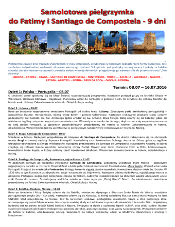 „ Pielgrzymka zawsze była ważnym wydarzeniem w życiu chrześcijan, przybierając w kolejnych epokach różne formy kulturowe. Jest symbolem indywidualnej wędrówki człowieka wierzącego śladami Odkupiciela: jest praktyką czynnej ascezy i pokuty za ludzkie słabości, wyraża nieustanną czujność człowieka wobec własnej ułomności i przygotowuje go wewnętrznie do przemiany serca”./Jan Paweł II/ LIZBONA – FATIMA – BRAGA – SANTIAGO DE COMPOSTELA – PONTEVEDRA - PORTO –– BATALHA – ALCOBACA – NAZARE – FATIMA - AJUSTREL – SINTRA - CABO DA ROCA – CASCAIS - LIZBONA Termin: 08.07 – 16.07.2016 Dzień 1: Polska – Portugalia – 08.07 O ustalonej porze spotkamy się na Mszy Świętej rozpoczynającej pielgrzymkę. Następnie przejazd grupy na lotnisko Okęcie w Warszawie. Odprawa biletowo – bagażowa. Planowany odlot do Portugalii o godzinie 15:15 Po przylocie do Lizbony transfer do hotelu w ok. Lizbony. Zakwaterowanie w hotelu. Obiadokolacja, nocleg. Dzień 2: Lizbona – 09.07 Rano po śniadaniu rozpoczniemy zwiedzanie Portugalii od stolicy kraju -Lizbony. Zobaczymy perłę architektury portugalskiej – manueliński klasztor Hieronimitów, słynną wieżę Belem i pomnik Odkrywców. Następnie urokliwymi uliczkami starej Lizbony podejdziemy do: Kościoła pw. Św. Antoniego (gdzie urodził się św. Antoni). Msza Święta. Dalej udamy się do Katedry, gdzie od wieków szczególną czcią otaczany jest patron miasta – św. Wincenty oraz zamku św. Jerzego, skąd roztacza się wspaniała panorama na całą stolicę Portugalii. W godzinach popołudniowych przejedziemy do hotelu w Fatimie. Zakwaterowanie w hotelu, obiadokolacja. Wieczorem będziemy uczestniczyć w przepięknym nabożeństwie różańcowym ze świecami. Nocleg. Dzień 3: Braga, Santiago de Compostela– 10.07 Śniadanie w hotelu. Następnie przejedziemy do Hiszpanii do Santiago de Compostela. Po drodze zatrzymamy się na obrzeżach miasta Bragi – dawnej siedziby Prymasa Portugalii. Nawiedzimy tam Sanktuarium Dobrego Jezusa na Górze, gdzie szczególnie uroczyście obchodzone są Święta Wielkanocne. Następnie przejedziemy do Santiago de Compostela. Nawiedzimy Katedrę, w której znajdują się relikwie Jakuba Apostoła, zobaczymy słynny Portyk Chwały oraz drzwi otwierane tylko w Roku Jubileuszowym. Nawiedzimy także kryptę w której oddamy cześć Apostołowi Jakubowi. Wieczorem zakwaterowanie w hotelu, obiadokolacja i nocleg. Dzień 4: Santiago de Compostela, Pontevedra, rejs w Porto – 11.07 W godzinach rannych po śniadaniu zwiedzanie Santiago de Compostela. Zobaczymy unikatowe Stare Miasto – zobaczymy najpiękniejszy parador w Hiszpanii Hospital Real, a także pałac biskupi oraz kościół franciszkanów. Msza Święta. Wyjazd w kierunku Portugalii. Przejazd do miasteczka Pontevedra, którego korzenie sięgają czasów rzymskich. Nawiedzimy klasztor sióstr św. Doroty. W 1925 roku w tym klasztorze przebywała św. Łucja i tutaj miała też Objawienia. Następnie udamy się do Porto, największego miasta w północnej Portugalii, sięgającego korzeniami czasów rzymskich, cudownie zlokalizowanego na zboczach wzgórz otulających ujście rzeki Douro do oceanu. Zasmakujemy widoków miasta w czasie rejsu po „Złotej Rzece” Douro. Po zakończonym zwiedzaniu przejedziemy do Fatimy. Zakwaterowanie w hotelu. Obiadokolacja. Nocleg Dzień 5: Batalha, Alcobaca, Nazare – 12.00 Rano po śniadaniu i Mszy Świętej udamy się do Batalhi, miasteczka słynącego z Klasztoru Santa Maria da Vitoria, arcydzieła portugalskiego gotyku (XIV - XVI wiek). Następnie udamy się do Alcobaca, w której zwiedzimy klasztor Santa Maria wpisany na listę UNESCO. Stąd przejedziemy do Nazare. Jest to niewielkie, urokliwe, portugalskie miasteczko leżące u stóp potężnego klifu, wznoszącego się ponad falami oceanu. Na szczycie urwistej skały w średniowieczu powstało niewielkie miasteczko Sitio. Największą budowlą jest tu piękny kościół Matki Boskiej z Nazare. Świątynia ta słynie z cudownej figurki N.M.P. oraz wielu cudów. Nazare sławne jest również jako kurort chlubiący się z powodu szerokiej, piaszczystej plaży. Czas wolny na odpoczynek. Wieczorem wrócimy do hotelu w Fatimie, obiadokolacja, nocleg. Wieczorem po kolacji weźmiemy udział w Modlitwie Różańcowej i procesji z lampionami. Dzień 6: Ajustrel, Fatima – 13.07 Rano śniadanie w hotelu.Cały ten dzień spędzimy w Fatimie, biorąc udział w uroczystościach związanych z objawieniami Matki Bożej w Cova da Iria. W tym dniu udamy się do przysiółkaAjustrel, gdzie znajdują się domy dzieci, którym objawiła się Matka Boża. Następnie weźmiemy udział w Drodze Krzyżowej, urokliwie wijącej się wśród gajów oliwnych i zagajników eukaliptusowych. Droga ta prowadzi trasą, którą dzieci pokonywały do Cova da Iria. Następnie powrócimy do Sanktuarium i miejsca objawień w Fatimie. Czas na osobista modlitwę i refleksję. Uroczysta Msza Święta. Wieczorem obiadokolacja w hotelu. Po kolacji weźmiemy udział w nabożeństwie różańcowym ze świecami. Nocleg. Dzień 7: Sintra, Cabo da Roca, Cascais – 14.07 Rano po śniadaniu przejedziemy do Sintry, wpisanej na listę Światowego Dziedzictwa UNESCO. W centrum zobaczymy Pałac Narodowy. W tym dniu udamy się także na Cabo da Roca - przylądek, który jest najdalej wysuniętym na Zachód punktem Europy. Jest to skalisty cypel z latarnią morską, wznoszący się na wysokość 140 m ponad falujący Atlantyk, z którego roztacza się przepiękny widok na bezkresny ocean. Następnie przejedziemy trasą nadmorską, zatrzymując się na odpoczynek w miejscowości Cascais. Wieczorem przyjedziemy do hotelu w ok. Lizbony. Obiadokolacja, nocleg. Dzień 8: Odpoczynek– 15.07 Rano śniadanie. Cały ten dzień przeznaczony będzie na odpoczynek i płazowane. Wieczorem kolacja w hotelu. Nocleg. Dzień 9: Lizbona – 16.07 Rano po śniadaniu wykwaterowanie z hotel