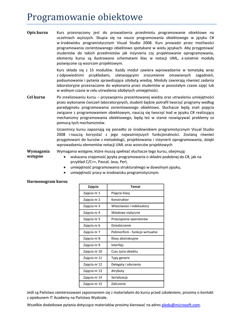 Programowanie obiektowe Opis kursu Kurs przeznaczony jest do prowadzenia przedmiotu programowanie obiektowe na uczelniach wyższych. Skupia się na nauce programowania obiektowego w języku C# w środowisku programistycznym Visual Studio 2008. Kurs prowadzi przez możliwości programowania zorientowanego obiektowo spotykane w wielu językach. Aby przygotowad studentów do takich przedmiotów jak inżynieria czy projektowanie oprogramowania, elementy kursu są ilustrowane schematami klas w notacji UML, a ostatnie moduły poświęcone są wzorcom projektowym. Kurs składa się z 15 modułów. Każdy moduł zawiera wprowadzenie w tematykę wraz z odpowiednimi przykładami, ułatwiającymi zrozumienie omawianych zagadnieo, podsumowanie i pytania sprawdzające zdobytą wiedzę. Moduły zawierają również zadania laboratoryjne przeznaczone do wykonania przez studentów w pozostałym czasie zajęd lub w wolnym czasie w celu utrwalenia zdobytych umiejętności. Cel kursu Po zrealizowaniu kursu – przyswojeniu prezentowanej wiedzy oraz utrwaleniu umiejętności przez wykonanie dwiczeo laboratoryjnych, student będzie potrafił tworzyd programy według paradygmatu programowania zorientowanego obiektowo. Słuchacze będą znali pojęcia związane z programowaniem obiektowym, nauczą się tworzyd kod w języku C# realizujący mechanizmy programowania obiektowego, będą też w stanie rozwiązywad problemy za pomocą tych mechanizmów. Uczestnicy kursu zapoznają się ponadto ze środowiskiem programistycznym Visual Studio 2008 i nauczą korzystad z jego najważniejszych funkcjonalności. Zostaną również przygotowani do kursów z metodologii, projektowania i inżynierii oprogramowania, dzięki wprowadzeniu elementów notacji UML oraz wzorców projektowych Wymagania wstępne Wymagania wstępne, które muszą spełniad słuchacze tego kursu, obejmują: wskazana znajomośd języka programowania o składni podobnej do C#, jak na przykład C/C++, Pascal, Java, Perl, umiejętnośd programowania strukturalnego w dowolnym języku, umiejętnośd pracy w środowisku programistycznym. Harmonogram kursu Zajęcia Temat Zajęcia nr 1 Pojęcie klasy Zajęcia nr 2 Konstruktor Zajęcia nr 3 Właściwości i indeksatory Zajęcia nr 4 Składowe statyczne Zajęcia nr 5 Przeciążenie operatorów Zajęcia nr 6 Dziedziczenie Zajęcia nr 7 Polimorfizm - funkcje wirtualne Zajęcia nr 8 Klasy abstrakcyjne Zajęcia nr 9 Interfejs Zajęcia nr 10 Czas życia obiektu Zajęcia nr 11 Typy generic Zajęcia nr 12 Delegaty i zdarzenia Zajęcia nr 13 Atrybuty Zajęcia nr 14 Serializacja Zajęcia nr 15 Zaliczenie Jeśli są Paostwo zainteresowani zapoznaniem się z materiałami do kursu przed szkoleniem, prosimy o kontakt z opiekunem IT Academy na Paostwa Wydziale. Wszelkie dodatkowe pytania dotyczące materiałów prosimy kierowad na adres [email protected].