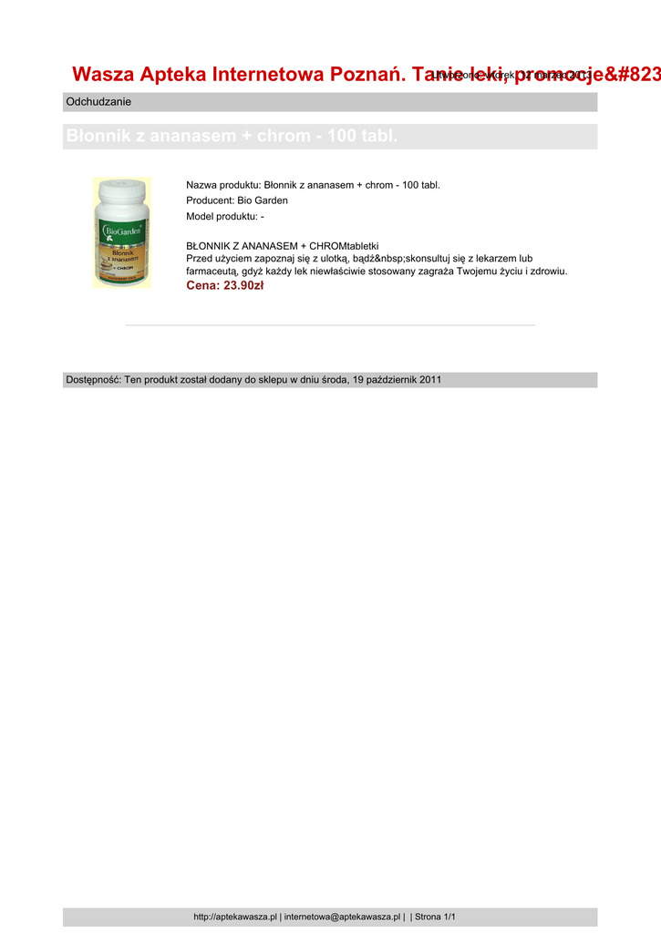 Utworzono: wtorek,promocje̷ 12 marzec 2013 Wasza Apteka Internetowa Poznań. Tanie leki, Odchudzanie Błonnik z ananasem + chrom - 100 tabl. Nazwa produktu: Błonnik z ananasem + chrom - 100 tabl. Producent: Bio Garden Model produktu: BŁONNIK Z ANANASEM + CHROMtabletki Przed użyciem zapoznaj się z ulotką, bądź skonsultuj się z lekarzem lub farmaceutą, gdyż każdy lek niewłaściwie stosowany zagraża Twojemu życiu i zdrowiu. Cena: 23.90zł Dostępność: Ten produkt został dodany do sklepu w dniu środa, 19 październik 2011 http://aptekawasza.pl | [email protected] | | Strona 1/1
