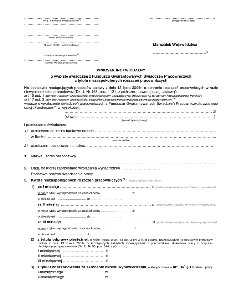 ………………………………………………………… Imię i nazwisko wnioskodawcy ………………………………………………… 1) (miejscowość, data) ………………………………………………………… ………………………………………………………… ………………………………………………………… Adres wnioskodawcy ………………………………………………………… Marszałek Województwa Numer PESEL wnioskodawcy ………………………………………………………… …………………………………… Imię i nazwisko pracownika 2) 3) ………………………………………………………… Numer PESEL pracownika WNIOSEK INDYWIDUALNY o wypłatę świadczeń z Funduszu Gwarantowanych Świadczeń Pracowniczych z tytułu niezaspokojonych roszczeń pracowniczych Na podstawie następujących przepisów ustawy z dnia 13 lipca 2006r. o ochronie roszczeń pracowniczych w razie niewypłacalności pracodawcy (Dz.U. Nr 158, poz. 1121, z późn.zm.), zwanej dalej „ustawą”: art.16 ust. 1 (dotyczy roszczeń pracowników przedsiębiorców prowadzących działalność na terytorium Rzeczypospolitej Polskiej)/ ) art.17 ust. 2 (dotyczy roszczeń pracowników oddziałów i przedstawicielstw przedsiębiorców zagranicznych) * wnoszę o wypłacenie świadczeń pracowniczych z Funduszu Gwarantowanych Świadczeń Pracowniczych, zwanego dalej „Funduszem”, w wysokości: ……………………………………………………………………………………………………… zł (słownie: …………………………………………………………………………………………….) (podać łączną kwotę) i przekazanie świadczeń: 1) przelewem na konto bankowe numer: …………………………………………………………………………………… w Banku: …………………………………………………………………………………………………………………….. (nazwa banku) 2) przekazem pocztowym na adres: ………………………………………………………………………………………… 1. Nazwa i adres pracodawcy ………………………………………………………………………………………………... ………………………………………………………………………………………………………………………………… 2. Data, od której zaprzestano wypłacania wynagrodzeń …………………………. Podstawa prawna świadczenia pracy …………………………………………….. 3. Kwota niezaspokojonych roszczeń pracowniczych 4) : (należy wpisać kwoty brutto) 1) za I miesiąc ……………………………………………………………… zł (podać nazwę miesiąca, rok i kwotę wynagrodzenia) w tym z tytułu wynagrodzenia za czas choroby ………………………….zł w okresie od ………………………… do ………………………… za II miesiąc .…………………………………………………………….. zł (podać nazwę miesiąca, rok i kwotę wynagrodzenia) w tym z tytułu wynagrodzenia za czas choroby ………………………….zł w okresie od ………………………… do ………………………… za III miesiąc ………………………………………………………………zł (podać nazwę miesiąca, rok i kwotę wynagrodzenia) w tym z tytułu wynagrodzenia za czas choroby …………………………..zł w okresie od ………………………… do ………………………… 2) z tytułu odprawy pieniężnej, o której mowa w art. 12 ust. 2 pkt 2 lit. d ustawy, przysługującej na podstawie przepisów ustawy z dnia 13 marca 2003r. o szczególnych zasadach rozwiązywania z pracownikami stosunków pracy z przyczyn niedotyczących pracowników (Dz. U. Nr 90, poz. 844, z późn. zm.): I-miesięcznej …………………………… zł II-miesięcznej …………………………… zł III-miesięcznej …………………………… zł 1 3) z tytułu odszkodowania za skrócenie okresu wypowiedzenia, o którym mowa w art. 36 § 1 Kodeksu pracy: I-miesięcznego ………………………… zł II-miesięcznego ………………………… zł 4) z tytułu ekwiwalentu pieniężnego za urlop wypoczynkowy, o którym mowa w art. 171 § 1 Kodeksu pracy, należnego za rok kalendarzowy, w którym ustał stosunek pracy: ………………………………….. zł (podać liczbę dni i kwotę) ) 4. Oświadczam, że nie należę / pracownik nie należał* do kategorii osób, o których mowa w art. 10 ustawy, wyłączonych z definicji pracownika (którymi są: małżonek pracodawcy, a także jego dzieci własne, dzieci drugiego małżonka i dzieci przysposobione, rodzice, macocha i ojczym oraz osoba przysposabiająca, a także rodzeństwo, wnuki, dziadkowie, zięciowie i synowe, bratowe, szwagierki i szwagrowie oraz osoby wykonujące pracę zarobkową w gospodarstwie domowym). 5. Oświadczam, że w roku, w którym jest dokonywana wypłata świadczeń, osiągnąłem (osiągnęłam) / ) nie osiągnąłem (nie osiągnęłam)* kwoty ograniczenia rocznej podstawy wymiaru składek na ubezpieczenia emerytalne i rentowe na dany rok kalendarzowy, o której mowa w art. 19 ustawy z dnia 13 października 1998r. o systemie ubezpieczeń społecznych (Dz.U. z 2009r. Nr 205, poz. 1585, z późn. zm.). ) 6. Oświadczam, że na wnioskodawcy / pracowniku ciążą / nie ciążą* potrącenia wynagrodzeń z tytułu świadczeń alimentacyjnych na zasadach przewidzianych w Kodeksie pracy. (jeśli wnioskodawca posiada zobowiązania alimentacyjne proszę złożyć odrębne oświadczenie dotyczące sposobu realizacji tych zobowiązań) 7. Oświadczam, że do dnia złożenia niniejszego wniosku wykazane wyżej roszczenia nie zostały zaspokojone przez pracodawc
