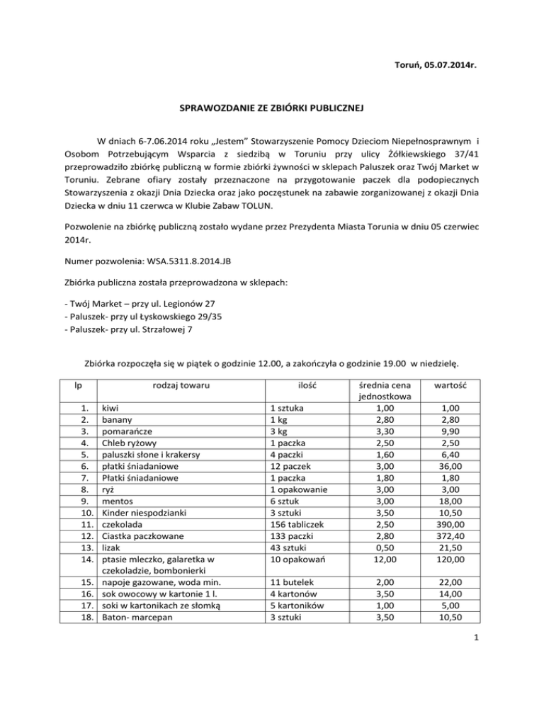 Toruń, 05.07.2014r. SPRAWOZDANIE ZE ZBIÓRKI PUBLICZNEJ W dniach 6-7.06.2014 roku „Jestem” Stowarzyszenie Pomocy Dzieciom Niepełnosprawnym i Osobom Potrzebującym Wsparcia z siedzibą w Toruniu przy ulicy Żółkiewskiego 37/41 przeprowadziło zbiórkę publiczną w formie zbiórki żywności w sklepach Paluszek oraz Twój Market w Toruniu. Zebrane ofiary zostały przeznaczone na przygotowanie paczek dla podopiecznych Stowarzyszenia z okazji Dnia Dziecka oraz jako poczęstunek na zabawie zorganizowanej z okazji Dnia Dziecka w dniu 11 czerwca w Klubie Zabaw TOLUN. Pozwolenie na zbiórkę publiczną zostało wydane przez Prezydenta Miasta Torunia w dniu 05 czerwiec 2014r. Numer pozwolenia: WSA.5311.8.2014.JB Zbiórka publiczna została przeprowadzona w sklepach: - Twój Market – przy ul. Legionów 27 - Paluszek- przy ul Łyskowskiego 29/35 - Paluszek- przy ul. Strzałowej 7 Zbiórka rozpoczęła się w piątek o godzinie 12.00, a zakończyła o godzinie 19.00 w niedzielę. lp 1. 2. 3. 4. 5. 6. 7. 8. 9. 10. 11. 12. 13. 14. 15. 16. 17. 18. rodzaj towaru kiwi banany pomarańcze Chleb ryżowy paluszki słone i krakersy płatki śniadaniowe Płatki śniadaniowe ryż mentos Kinder niespodzianki czekolada Ciastka paczkowane lizak ptasie mleczko, galaretka w czekoladzie, bombonierki napoje gazowane, woda min. sok owocowy w kartonie 1 l. soki w kartonikach ze słomką Baton- marcepan ilość wartość 1 sztuka 1 kg 3 kg 1 paczka 4 paczki 12 paczek 1 paczka 1 opakowanie 6 sztuk 3 sztuki 156 tabliczek 133 paczki 43 sztuki 10 opakowań średnia cena jednostkowa 1,00 2,80 3,30 2,50 1,60 3,00 1,80 3,00 3,00 3,50 2,50 2,80 0,50 12,00 11 butelek 4 kartonów 5 kartoników 3 sztuki 2,00 3,50 1,00 3,50 22,00 14,00 5,00 10,50 1,00 2,80 9,90 2,50 6,40 36,00 1,80 3,00 18,00 10,50 390,00 372,40 21,50 120,00 1 19. 20. 21. 22. 23. 24. 25. 26. wafelki gumy do żucia mamba Draże, pianki, żelki napoje w kartonikach, butelkach chipsy Zabawka - samochód zabawki – kucyki pony RAZEM 299 sztuk 5 paczek 44 opakowań 21 sztuk 4 opakowania 1 sztuka 4 sztuki - 1,00 3,00 2,50 1,00 3,00 13,00 9,00 - 299,00 15,00 110,00 21,00 12,00 13,00 36,00 1553,30 Łączna wartość wszystkich produktów w zł: 1553,30 Koszty przeprowadzonej zbiórki: - druk ulotek , plakatów informacyjnych, legitymacji: 200 zł - koszty użycia samochodu do odbioru zebranych darów z punktów, w których dokonywano zbiórki do siedziby Stowarzyszenia : 66,84 zł( 80 km x 0,8358 zł/ km). Koszty zbiórki zostały pokryte ze środków Stowarzyszenia. Łączna wartość poniesionych kosztów: 266,84 zł Załączniki: 1. Gazetka Stowarzyszenia „Jestem” 2. Kopia listy potwierdzającej odbiór paczek podczas zabawy z okazji Dnia Dziecka 3. Protokół z liczenia żywności 2