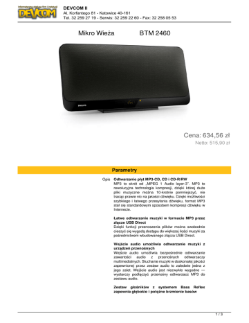 DEVCOM II Al. Korfantego 81 - Katowice 40-161 Tel. 32 259 27 19 - Serwis: 32 259 22 60 - Fax: 32 258 05 53 Mikro Wieża BTM 2460 Cena: 634,56 zł Netto: 515,90 zł Parametry Opis Odtwarzanie płyt MP3-CD, CD i CD-R/RW MP3 to skrót od „MPEG 1 Audio layer-3”. MP3 to rewolucyjna technologia kompresji, dzięki której duże pliki muzyczne można 10-krotnie pomniejszyć, nie tracąc prawie nic na jakości dźwięku. Dzięki możliwości szybkiego i łatwego przesyłania dźwięku, format MP3 stał się standardowym sposobem kompresji dźwięku w Internecie. Łatwe odtwarzanie muzyki w formacie MP3 przez złącze USB Direct Dzięki funkcji przenoszenia plików można swobodnie cieszyć się wygodą dostępu do większej ilości muzyki za pośrednictwem wbudowanego złącza USB Direct. Wejście audio umożliwia odtwarzanie muzyki z urządzeń przenośnych Wejście audio umożliwia bezpośrednie odtwarzanie zawartości audio z przenośnych odtwarzaczy multimedialnych. Słuchanie muzyki w doskonałej jakości zapewnionej przez zestaw audio to zaledwie jedna z jego zalet. Wejście audio jest niezwykle wygodne — wystarczy podłączyć przenośny odtwarzacz MP3 do zestawu audio. Zestaw głośników z systemem Bass Reflex zapewnia głębokie i potężne brzmienie basów 1/3 DEVCOM II Al. Korfantego 81 - Katowice 40-161 Tel. 32 259 27 19 - Serwis: 32 259 22 60 - Fax: 32 258 05 53 Zestaw głośnikowy z systemem Bass Reflex emituje niskie tony o większej głębi niż kompaktowy system głośnikowy. Zestaw ten różni się od systemu kompaktowego tubą basową akustycznie zharmonizowaną z głośnikiem niskotonowym, co pozwala uniknąć obcinania niskich dźwięków. Efekt to głębszy regulowany bas i mniejsze zniekształcenia. System działa w ten sposób, że wprowadza w rezonans masę powietrza znajdującą się w tubie basowej, aby wibrowała jak zwykły głośnik niskotonowym. W połączeniu z reakcją głośnika niskotonowego oznacza to ogólne wzmocnienie basów i większą ich głębię. Cyfrowa korekcja dźwięku dostosowuje ustawienia do stylu muzyki Funkcja cyfrowej korekcji dźwięku oferuje wybór wstępnie zaprogramowanych ustawień korektora — zrównoważone, wyraziste, mocne, ciepłe, czyste — pozwalających na zoptymalizowanie zakresów częstotliwości dla różnych stylów muzycznych. Każdy tryb wykorzystuje technologię korekcji graficznej w celu automatycznego dostrojenia balansu dźwięku i uwydatnienia jego częstotliwości mających największe znaczenie w danym stylu. Dzięki precyzyjnemu dostosowaniu balansu dźwięku do gatunku muzycznego funkcja korekcji dźwięku pozwala czerpać maksymalną przyjemność ze słuchania muzyki. Przesyłanie strumieniowe muzyki przez Bluetooth® dzięki parowaniu wielu urządzeń Bezprzewodowa transmisja dźwięku Bluetooth® jest coraz popularniejsza w świecie zestawów audio, jednak większość zestawów zgodnych z technologią Bluetooth® umożliwia podłączenie tylko jednego urządzenia w danej chwili. Funkcja parowania wielu urządzeń pozwala na sparowanie do trzech urządzeń i przełączanie między nimi w dowolnym momencie. Możliwość montażu na ścianie: zestaw można umieścić praktycznie w dowolnym miejscu Zestaw audio Philips to idealne połączenie smukłego i wielofunkcyjnego projektu, dopasowujące się do każdego wystroju pomieszczenia. Zestaw ten umieszczany jest na podstawie, dzięki czemu można go bezpiecznie umieścić na dowolnej półce lub szafce. W przypadku montażu na ścianie zestaw ten jest tak samo wszechstronny, jak w przypadku wolnostojącej podstawy. Uniwersalny styl i małe wymiary sprawiają, że pasuje wszędzie Uniwersalny styl i małe wymiary sprawiają, że pasuje wszędzie. Ten niewielki i elegancki zestaw dobrze wygląda w każdym pomieszczeniu. Natychmiastowe przełączanie muzyki między 2 urządzeniami dzięki funkcji MULTIPAIR Sparuj 2 inteligentne urządzenia jednocześnie, aby móc strumieniowo przesyłać muzykę z dowolnego urządzenia bez konieczności przerywania połączenia i ponownego jego nawiązywania. Aby odtworzyć utwór w innym 2/3 DEVCOM II Al. Korfantego 81 - Katowice 40-161 Tel. 32 259 27 19 - Serwis: 32 259 22 60 - Fax: 32 258 05 53 urządzeniu, wystarczy najpierw wstrzymać odtwarzanie na pierwszym urządzeniu, a następnie odtworzyć utwór na innym. To doskonałe rozwiązanie do udostępniania muzyki znajomym, korzystania podczas imprez lub po prostu odtwarzania różnych utworów zapisanych w różnych urządzeniach. Znajomi i rodzina mogą sparować swoje urządzenia w tym samym czasie, aby błyskawicznie wymieniać się muzyką. System Mikrowieża Liczba kanałów audio Mono Moc głośników (sumaryczna) 20 Tuner FM Tak Pasma FM (UKF) Pamięć stacji 20 Odtwarzacz CD Odczytywane formaty płyt CD Odczytywane formaty płyt CD Odczytywane formaty płyt DVD Odtwarzanie z USB Odtwarzane formaty audio Stacja dokująca Funkcje specjalne Tak CD-RW CD-R Brak Tak MP3 Nie - Szybkie przewijanie do tyłu/do przodu - Odtwarzanie/wstrzymywanie - Poprzedni/następny - Odtwarzanie wielokrotne - Losowa kolejność odtwarzania - Zatrzymywanie Komunikacja bezprzewodowa Bluetooth Złącza 1 x USB 2.0 Akcesoria w zestawie - Antena FM - Instrukcja obsługi - Pilot Kolor Czarny Wymiary 520 x 323 x 123 mm Waga 2.4 3/3 Powered by TCPDF (www.tcpdf.org)