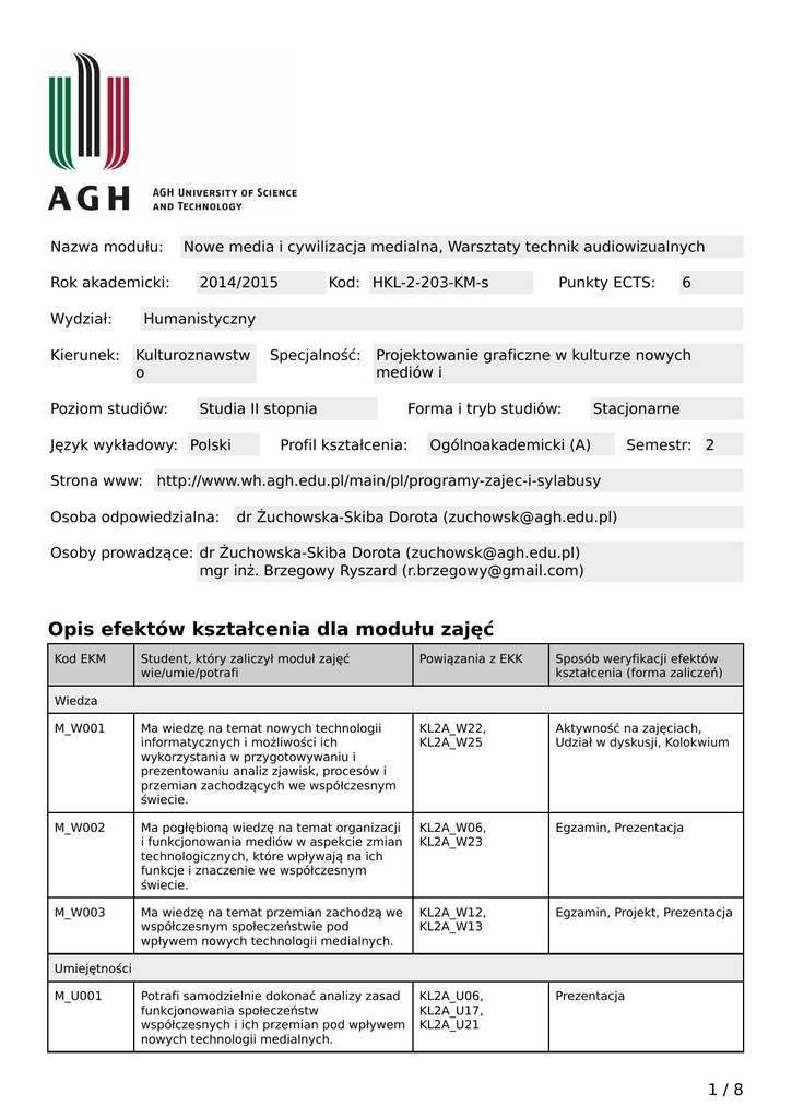 Nazwa modułu: Rok akademicki: Wydział: Kierunek: Nowe media i cywilizacja medialna, Warsztaty technik audiowizualnych 2014/2015 Kod: HKL-2-203-KM-s Punkty ECTS: 6 Humanistyczny Kulturoznawstw o Poziom studiów: Specjalność: Projektowanie graficzne w kulturze nowych mediów i Studia II stopnia Język wykładowy: Polski Forma i tryb studiów: Profil kształcenia: Stacjonarne Ogólnoakademicki (A) Semestr: 2 Strona www: http://www.wh.agh.edu.pl/main/pl/programy-zajec-i-sylabusy Osoba odpowiedzialna: dr Żuchowska-Skiba Dorota ([email protected]) Osoby prowadzące: dr Żuchowska-Skiba Dorota ([email protected]) mgr inż. Brzegowy Ryszard ([email protected]) Opis efektów kształcenia dla modułu zajęć Kod EKM Student, który zaliczył moduł zajęć wie/umie/potrafi Powiązania z EKK Sposób weryfikacji efektów kształcenia (forma zaliczeń) M_W001 Ma wiedzę na temat nowych technologii informatycznych i możliwości ich wykorzystania w przygotowywaniu i prezentowaniu analiz zjawisk, procesów i przemian zachodzących we współczesnym świecie. KL2A_W22, KL2A_W25 Aktywność na zajęciach, Udział w dyskusji, Kolokwium M_W002 Ma pogłębioną wiedzę na temat organizacji i funkcjonowania mediów w aspekcie zmian technologicznych, które wpływają na ich funkcje i znaczenie we współczesnym świecie. KL2A_W06, KL2A_W23 Egzamin, Prezentacja M_W003 Ma wiedzę na temat przemian zachodzą we współczesnym społeczeństwie pod wpływem nowych technologii medialnych. KL2A_W12, KL2A_W13 Egzamin, Projekt, Prezentacja Potrafi samodzielnie dokonać analizy zasad funkcjonowania społeczeństw współczesnych i ich przemian pod wpływem nowych technologii medialnych. KL2A_U06, KL2A_U17, KL2A_U21 Prezentacja Wiedza Umiejętności M_U001 1/8 Karta modułu - Nowe media i cywilizacja medialna, Warsztaty technik audiowizualnych M_U002 Potrafi dokonać krytycznej analizy przemiany i zjawisk zachodzących we współczesnym społeczeństwie informacyjnym pod wpływem nowych technologii informatycznych i medialnych. KL2A_U23 Projekt, Prezentacja, Aktywność na zajęciach, Udział w dyskusji M_U003 Potrafi wykorzystać nowoczesne pakiety oprogramowania utworzone dla grafiki komputerowej na potrzeby tworzenia komunikatów dla różnych typów mediów. KL2A_U22 Projekt M_U004 Potrafi samodzielnie wykonać prezentację multimedialną wykorzystując interdyscyplinarne źródła, aby przedstawić przemiany zachodzące we współczesnym świecie pod wpływem nowych technologii medialnych oraz w obrębie samych mediów. KL2A_U06, KL2A_U13, KL2A_U21 Prezentacja Kompetencje społeczne M_K001 Jest gotowy do współpracy w grupie przy realizacji projektów i zadań przyjmowania w nich różnych ról. KL2A_K10 Aktywność na zajęciach, Wykonanie ćwiczeń, Zaangażowanie w pracę zespołu M_K002 Uczestniczy w sposób świadomy i odpowiedzialny w rzeczywistości wirtualnej i kulturze, mając świadomość znaczenia humanistyki dla funkcjonowania w tych przestrzeniach. KL2A_K07, KL2A_K09 Aktywność na zajęciach, Egzamin, Prezentacja, Projekt Matryca efektów kształcenia w odniesieniu do form zajęć Konwersatori um Zajęcia seminaryjne Zajęcia praktyczne Zajęcia terenowe Zajęcia warsztatowe Ma wiedzę na temat nowych technologii informatycznych i możliwości ich wykorzystania w przygotowywaniu i prezentowaniu analiz zjawisk, procesów i przemian zachodzących we współczesnym świecie. - - + - - - - - - - - M_W002 Ma pogłębioną wiedzę na temat organizacji i funkcjonowania mediów w aspekcie zmian technologicznych, które wpływają na ich funkcje i znaczenie we współczesnym świecie. + - - - - - - - - - - E-learning Ćwiczenia projektowe M_W001 Inne Ćwiczenia laboratoryjne Forma zajęć Ćwiczenia audytoryjne Student, który zaliczył moduł zajęć wie/umie/potrafi Wykład Kod EKM Wiedza 2/8 Karta modułu - Nowe media i cywilizacja medialna, Warsztaty technik audiowizualnych M_W003 Ma wiedzę na temat przemian zachodzą we współczesnym społeczeństwie pod wpływem nowych technologii medialnych. + - - - - - - - - - - M_U001 Potrafi samodzielnie dokonać analizy zasad funkcjonowania społeczeństw współczesnych i ich przemian pod wpływem nowych technologii medialnych. + - - - - - - - - - - M_U002 Potrafi dokonać krytycznej analizy przemiany i zjawisk zachodzących we współczesnym społeczeństwie informacyjnym pod wpływem nowych technologii informatycznych i medialnych. + - + - - - - - - - - M_U003 Potrafi wykorzystać nowoczesne pakiety oprogramowania utworzone dla grafiki komputerowej na potrzeby tworzenia komunikatów dla różnych typów mediów. - - + - - - - - - - - M_U004 Potrafi samodzielnie wykonać prezentację multimedialną wykorzystując interdyscyplinarne źródła, aby przedstawić przemiany zachodzące we współczesnym świecie pod wpływem nowych technologii medialnych oraz w obrębie samych mediów. + - - - - - - - - - - Umiejętności Kompetencje społeczne M_K001 Jest gotowy do współpracy w grupie przy realizacji projektów i zadań przyjmowania w nich różnych ról. - - + - - - - - - - - M_K002 Uczestniczy w sposób świadomy i odpowiedzialny w rzeczywistości wirtualnej i kulturze, mając świadomość znaczenia humanistyki dla funkcjonowania w tych przestrzeniach. + - + - - - - - - - - Treść modułu zajęć (program wykładów i pozostałych zajęć) Wykład Nowe media i społeczne systemy medialne Zajęcia te mają studentom przybliżyć pojęcie cywilizacji medialnej. Szczególnie dużo uwagi w ramach wykładów przywiązujemy do ukazania funkcjonowania w dzisiejszych 3/8 Karta modułu - Nowe media i cywilizacja medialna, Warsztaty technik audiowizualnych warunkach nowych mediów. W oparciu o teksty zostaną omówione podstawowe elementy nowej cywilizacji medialnej i przemian jakie dokonują się obecnie pod wpływem nowych technologii w społeczeństwie. Szczególna uwaga poświęcona bedzie zróż• • nicowaniu kulturowemu nowoczesnego swiata i jego wielok