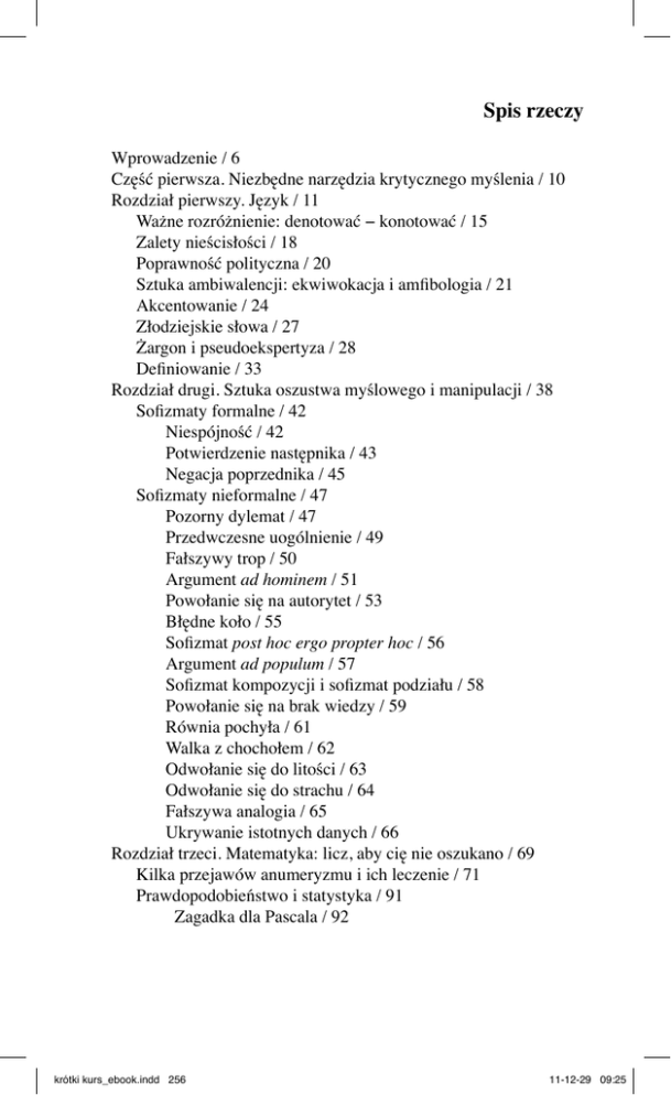Spis rzeczy Wprowadzenie / 6 Część pierwsza. Niezbędne narzędzia krytycznego myślenia / 10 Rozdział pierwszy. Język / 11 Ważne rozróżnienie: denotować − konotować / 15 Zalety nieścisłości / 18 Poprawność polityczna / 20 Sztuka ambiwalencji: ekwiwokacja i amfibologia / 21 Akcentowanie / 24 Złodziejskie słowa / 27 Żargon i pseudoekspertyza / 28 Definiowanie / 33 Rozdział drugi. Sztuka oszustwa myślowego i manipulacji / 38 Sofizmaty formalne / 42 Niespójność / 42 Potwierdzenie następnika / 43 Negacja poprzednika / 45 Sofizmaty nieformalne / 47 Pozorny dylemat / 47 Przedwczesne uogólnienie / 49 Fałszywy trop / 50 Argument ad hominem / 51 Powołanie się na autorytet / 53 Błędne koło / 55 Sofizmat post hoc ergo propter hoc / 56 Argument ad populum / 57 Sofizmat kompozycji i sofizmat podziału / 58 Powołanie się na brak wiedzy / 59 Równia pochyła / 61 Walka z chochołem / 62 Odwołanie się do litości / 63 Odwołanie się do strachu / 64 Fałszywa analogia / 65 Ukrywanie istotnych danych / 66 Rozdział trzeci. Matematyka: licz, aby cię nie oszukano / 69 Kilka przejawów anumeryzmu i ich leczenie / 71 Prawdopodobieństwo i statystyka / 91 Zagadka dla Pascala / 92 krótki kurs_ebook.indd 256 11-12-29 09:25 Kilka pojęć teorii prawdopodobieństwa / 95 Lotto / 99 Trójkąt Pascala / 103 Sofizmat gracza / 104 Nadzwyczajnie? Nie tak prędko... / 105 Jak Pascal rozwiązał zagadkę kawalera de Méré / 107 Pojęcia statystyczne / 108 Krzywa Laplace’a–Gaussa / 108 Średnia, mediana i modalna / 109 Odchylenie standardowe / 114 Ankiety i próby / 117 Zależność statystyczna i korelacja / 125 Regresja do średniej i przesąd / 127 Ilustracje? / 128 Wykresy / 137 Część druga. Uzasadnianie przekonań / 144 Wprowadzenie / 155 Rozdział pierwszy. Doświadczenie osobiste / 148 Postrzeganie / 149 Pareidolia − twarz na Marsie / 153 Promienie N doktora Blondlota / 155 O użyteczności magii / 157 Pamięć / 164 Sądzenie / 170 Dysonans poznawczy / 173 Efekt Forera / 175 Potwierdzanie i obalanie hipotezy / 177 Efekt Pigmaliona / 178 Eksperyment Miligrama, albo złe skutki ślepej wiary w autorytet / 181 Eksperyment Ascha, albo złe skutki konformizmu / 183 Cenne narzędzie − maksyma Hume’a / 186 Rozdział drugi. Nauki empiryczne / 190 Nauka i eksperymenty / 194 Eksperyment z kontrolowanymi zmiennymi / 197 Eksperyment z grupą kontrolną / 199 Eksperyment z podwójnie ślepą próbą / 202 257 krótki kurs_ebook.indd 257 11-12-29 09:25 Czym jest nauka? / 205 Nauka i nauki / 206 Trzy ważne zasady nauk empirycznych / 208 Nauka jako praktyka / 212 Nauka, protonauka i pseudonauka / 215 Krytyczne odczytywanie wyników badań naukowych / 220 Model TEST / 222 Rozdział trzeci. Media / 226 Inna idea demokracji / 230 Propagandowy model mediów / 234 Krytyczna postawa wobec mediów / 241 Zakończenie / 250 Podziękowania / 252 Bibliografia / 253 krótki kurs_ebook.indd 258 11-12-29 09:25