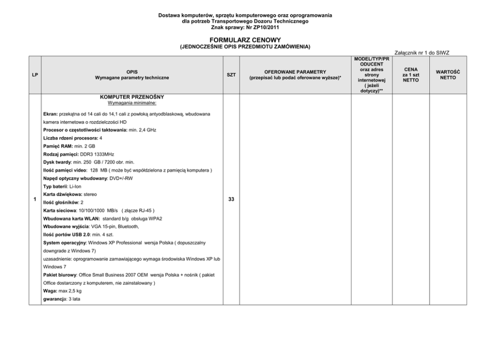 Dostawa komputerów, sprzętu komputerowego oraz oprogramowania dla potrzeb Transportowego Dozoru Technicznego Znak sprawy: Nr ZP10/2011 FORMULARZ CENOWY (JEDNOCZEŚNIE OPIS PRZEDMIOTU ZAMÓWIENIA) Załącznik nr 1 do SIWZ OPIS Wymagane parametry techniczne LP SZT KOMPUTER PRZENOŚNY Wymagania minimalne: Ekran: przekątna od 14 cali do 14,1 cali z powłoką antyodblaskową, wbudowana kamera internetowa o rozdzielczości HD Procesor o częstotliwości taktowania: min. 2,4 GHz Liczba rdzeni procesora: 4 Pamięć RAM: min. 2 GB Rodzaj pamięci: DDR3 1333MHz Dysk twardy: min. 250 GB / 7200 obr. min. Ilość pamięci video: 128 MB ( moŜe być współdzielona z pamięcią komputera ) Napęd optyczny wbudowany: DVD+/-RW Typ baterii: Li-Ion Karta dźwiękowa: stereo 1 Ilość głośników: 2 Karta sieciowa: 10/100/1000 MB/s ( złącze RJ-45 ) Wbudowana karta WLAN: standard b/g obsługa WPA2 Wbudowane wyjścia: VGA 15-pin, Bluetooth, Ilość portów USB 2.0: min. 4 szt. System operacyjny: Windows XP Professional wersja Polska ( dopuszczalny downgrade z Windows 7) uzasadnienie: oprogramowanie zamawiającego wymaga środowiska Windows XP lub Windows 7 Pakiet biurowy: Office Small Business 2007 OEM wersja Polska + nośnik ( pakiet Office dostarczony z komputerem, nie zainstalowany ) Waga: max 2,5 kg gwarancja: 3 lata 33 OFEROWANE PARAMETRY (przepisać lub podać oferowane wyŜsze)* MODEL/TYP/PR ODUCENT oraz adres strony internetowej ( jeŜeli dotyczy)** CENA za 1 szt NETTO WARTOŚĆ NETTO OPIS Wymagane parametry techniczne LP SZT OFEROWANE PARAMETRY (przepisać lub podać oferowane wyŜsze)* MODEL/TYP/PR ODUCENT oraz adres strony internetowej ( jeŜeli dotyczy)** CENA za 1 szt NETTO WARTOŚĆ NETTO Wymagania dodatkowe: czytnik linii papilarnych, wejście mikrofonowe, wyjście słuchawkowe, moŜliwość samodzielnego demontaŜu dysku twardego oraz napędu optycznego ( celem dostarczenia do serwisu ), torba do laptopa w zestawie, mysz USB optyczno-radiowa: 2 przyciski + rolka - serwis gwarancyjny na terenie Polski w siedzibie zamawiającego - w przypadku awarii dysku twardego w, uszkodzony dysk z danymi pozostaje w siedzibie zamawiającego KOMPUTER PRZENOŚNY Wymagania minimalne: Ekran: przekątna od 11 cali do 11,6 cali Procesor o częstotliwości taktowania: min. 1.3 GHz Pamięć RAM: min. 4 GB Dysk twardy: min. 250 GB / 7200 obr. min. Napęd optyczny USB: DVD+/-RW Typ baterii: Li-Ion Karta dźwiękowa: stereo Ilość głośników: 2 2 Karta sieciowa: 10/100/1000 MB/s ( złącze RJ-45 ) 2 Wbudowana karta WLAN: standard b/g obsługa WPA2 Ilość portów USB 2.0: min. 3 szt. System operacyjny: Windows 7 Professional wersja Polska Pakiet biurowy: Office Small Business 2007 OEM wersja Polska + nośnik ( pakiet Office dostarczony z komputerem, nie zainstalowany ) uzasadnienie: oprogramowanie zamawiającego wymaga środowiska Windows XP lub Windows 7 Waga: max 1,5 kg gwarancja: 1 rok Wymagania dodatkowe: moŜliwość samodzielnego demontaŜu dysku twardego, 2 OPIS Wymagane parametry techniczne LP SZT OFEROWANE PARAMETRY (przepisać lub podać oferowane wyŜsze)* MODEL/TYP/PR ODUCENT oraz adres strony internetowej ( jeŜeli dotyczy)** CENA za 1 szt NETTO WARTOŚĆ NETTO torba do laptopa w zestawie, mysz USB optyczno-radiowa: 2 przyciski + rolka - serwis gwarancyjny na terenie Polski - w przypadku awarii dysku twardego w, uszkodzony dysk z danymi pozostaje w siedzibie zamawiającego. KOMPUTER STACJONARNY Wymagania minimalne: Procesor o częstotliwości taktowania: 3 Ghz BOX Płyta główna: - Chłodzenie chipsetu: radiator - Obsługa pamięci 1066 MHz - Rodzaj pamięci DDR2, 1066 MHz - Złącza PCI 2 szt. - Złącza USB 2.0 min 4 szt., - Minimalna ilość urządzeń Serial ATA 2 szt. - wbudowana automatyczna regulacja obrotów wentylatora procesora względem roboczej temperatury procesora 3 - zintegrowana karta graficzna 5 - zintegrowana karta sieciowa 100/1000 Mb/s Pamięć RAM: min. 2 GB DDR2 1066 MHz Dysk twardy: pojemność min.320 GB, interfejs Serial ATA 2 Prędkość obrotowa 7200 obr./min Pojemność pamięci podręcznej 16 MB Wbudowana funkcja: NCQ - Native Command Queuing Napęd optyczny: DVD +/- RW w kolorze obudowy, interfejs SATA Obudowa Mini Tower ( pionowa ): - zasilacz 450 W, 3 OPIS Wymagane parametry techniczne LP SZT OFEROWANE PARAMETRY (przepisać lub podać oferowane wyŜsze)* MODEL/TYP/PR ODUCENT oraz adres strony internetowej ( jeŜeli dotyczy)** CENA za 1 szt NETTO WARTOŚĆ NETTO - kolor srebrny lub czarny, - wymagane wyjścia USB na froncie obudowy, - przycisk włącznika na froncie obudowy - liczba kieszeni:5.25 cala max 2 szt. - zamontowany wentylator w tylnej części obudowy 80x80 mm Oprogramowanie: - Windows XP Professional wersja Polska + nośnik CD ( dopuszczalny downgrade z Windows 7 ) - Pakiet biurowy Office Small Businessl 2007 wersja Polska + nośnik CD ( pakiet Office dostarczony z komputerem, nie zainstalowany ) - oprogramowanie do nagrywania płyt DVD zainstalowane w systemie uzasadnienie: oprogramowanie zamawiającego wymaga środowiska Windows XP lub Windows 7 Wymagania dodatkowe do zestawu: mysz optyczna USB klawiatura PS/2 lub USB podkładka z materiału kolor jednolity oprogramowanie do nagrywania płyt DVD +/- RW listwa zasilająca przeciwprzepięciowa system zainstalowany na dysku twardym w przypadku awarii dysku twardego w, uszkodzony dysk z danymi pozostaje w siedzibie zamawiającego Gwarancja: 24 miesiące KOMPUTER Wymagania minimalne: 4 Procesor o częstotliwości taktowania:: 3,4 GHz BOX 2 Płyta główna: - Rodzaj obsługiwanej pamięci DDR3, min 4 GB - karta sieciowa zintegrowana 100/1000 Mb/s 4 OPIS Wymagane parametry techniczne LP - SZT OFEROWANE PARAMETRY (przepisać lub podać oferowane wyŜsze)* MODEL/TYP/PR ODUCENT oraz adres strony internetowej ( jeŜeli dotyczy)** CENA za 1 szt NETTO WARTOŚĆ NETTO Złącza USB 2.0 min 4 szt., Układ RAID 5xSATA (0, 1, 5, 10 ) Minimalna ilość urządzeń Serial ATA 4 szt. Szybkość interfejsu dysków Serial AT