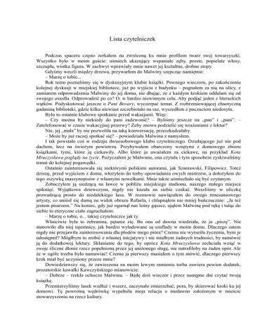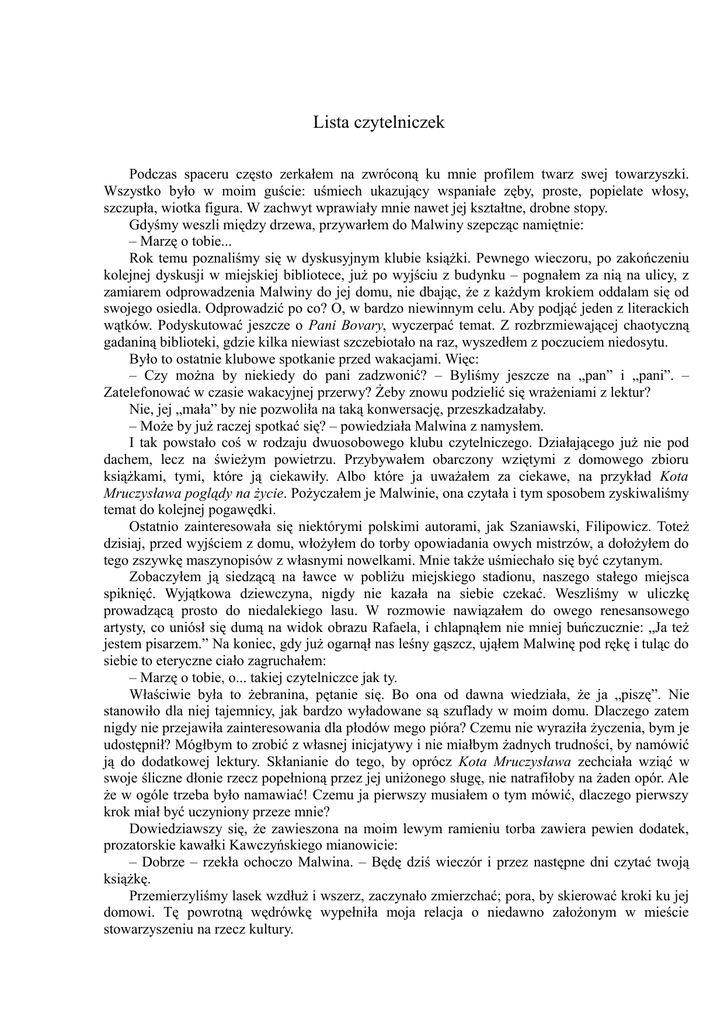 Lista czytelniczek Podczas spaceru często zerkałem na zwróconą ku mnie profilem twarz swej towarzyszki. Wszystko było w moim guście: uśmiech ukazujący wspaniałe zęby, proste, popielate włosy, szczupła, wiotka figura. W zachwyt wprawiały mnie nawet jej kształtne, drobne stopy. Gdyśmy weszli między drzewa, przywarłem do Malwiny szepcząc namiętnie: – Marzę o tobie... Rok temu poznaliśmy się w dyskusyjnym klubie książki. Pewnego wieczoru, po zakończeniu kolejnej dyskusji w miejskiej bibliotece, już po wyjściu z budynku – pognałem za nią na ulicy, z zamiarem odprowadzenia Malwiny do jej domu, nie dbając, że z każdym krokiem oddalam się od swojego osiedla. Odprowadzić po co? O, w bardzo niewinnym celu. Aby podjąć jeden z literackich wątków. Podyskutować jeszcze o Pani Bovary, wyczerpać temat. Z rozbrzmiewającej chaotyczną gadaniną biblioteki, gdzie kilka niewiast szczebiotało na raz, wyszedłem z poczuciem niedosytu. Było to ostatnie klubowe spotkanie przed wakacjami. Więc: – Czy można by niekiedy do pani zadzwonić? – Byliśmy jeszcze na „pan” i „pani”. – Zatelefonować w czasie wakacyjnej przerwy? Żeby znowu podzielić się wrażeniami z lektur? Nie, jej „mała” by nie pozwoliła na taką konwersację, przeszkadzałaby. – Może by już raczej spotkać się? – powiedziała Malwina z namysłem. I tak powstało coś w rodzaju dwuosobowego klubu czytelniczego. Działającego już nie pod dachem, lecz na świeżym powietrzu. Przybywałem obarczony wziętymi z domowego zbioru książkami, tymi, które ją ciekawiły. Albo które ja uważałem za ciekawe, na przykład Kota Mruczysława poglądy na życie. Pożyczałem je Malwinie, ona czytała i tym sposobem zyskiwaliśmy temat do kolejnej pogawędki. Ostatnio zainteresowała się niektórymi polskimi autorami, jak Szaniawski, Filipowicz. Toteż dzisiaj, przed wyjściem z domu, włożyłem do torby opowiadania owych mistrzów, a dołożyłem do tego zszywkę maszynopisów z własnymi nowelkami. Mnie także uśmiechało się być czytanym. Zobaczyłem ją siedzącą na ławce w pobliżu miejskiego stadionu, naszego stałego miejsca spiknięć. Wyjątkowa dziewczyna, nigdy nie kazała na siebie czekać. Weszliśmy w uliczkę prowadzącą prosto do niedalekiego lasu. W rozmowie nawiązałem do owego renesansowego artysty, co uniósł się dumą na widok obrazu Rafaela, i chlapnąłem nie mniej buńczucznie: „Ja też jestem pisarzem.” Na koniec, gdy już ogarnął nas leśny gąszcz, ująłem Malwinę pod rękę i tuląc do siebie to eteryczne ciało zagruchałem: – Marzę o tobie, o... takiej czytelniczce jak ty. Właściwie była to żebranina, pętanie się. Bo ona od dawna wiedziała, że ja „piszę”. Nie stanowiło dla niej tajemnicy, jak bardzo wyładowane są szuflady w moim domu. Dlaczego zatem nigdy nie przejawiła zainteresowania dla płodów mego pióra? Czemu nie wyraziła życzenia, bym je udostępnił? Mógłbym to zrobić z własnej inicjatywy i nie miałbym żadnych trudności, by namówić ją do dodatkowej lektury. Skłanianie do tego, by oprócz Kota Mruczysława zechciała wziąć w swoje śliczne dłonie rzecz popełnioną przez jej uniżonego sługę, nie natrafiłoby na żaden opór. Ale że w ogóle trzeba było namawiać! Czemu ja pierwszy musiałem o tym mówić, dlaczego pierwszy krok miał być uczyniony przeze mnie? Dowiedziawszy się, że zawieszona na moim lewym ramieniu torba zawiera pewien dodatek, prozatorskie kawałki Kawczyńskiego mianowicie: – Dobrze – rzekła ochoczo Malwina. – Będę dziś wieczór i przez następne dni czytać twoją książkę. Przemierzyliśmy lasek wzdłuż i wszerz, zaczynało zmierzchać; pora, by skierować kroki ku jej domowi. Tę powrotną wędrówkę wypełniła moja relacja o niedawno założonym w mieście stowarzyszeniu na rzecz kultury. – Czy słyszałaś o nowej organizacji? Nazywa się „Parnas”. Parnas, siedziba Apolla i muz. Wydało mi się, że to coś dla mnie, więc zapisałem się. Już nawet opłaciłem składkę. Na pierwsze zebranie, w Starostwie, zeszło się dziewiętnaście osób. Pośpieszyłem tam zaintrygowany, a jakże, mocno zaciekawiony, czym się konkretnie to bractwo będzie zajmować. Jakie imprezy, z czym do gości? Niewiele się dowiedziałem, mówiono głównie o sprawach organizacyjnych. Wybór zarządu, skarbnika, komisji rewizyjnej et cetera. Zdołałem się jedynie zorientować, że działalność stowarzyszenia, zgodnie z jego symboliczną nazwą, będzie polegać na krzewieniu wszystkich dziedzin sztuki, a więc również tej, co najbardziej mnie pociąga, literatury. Załatwienie wszystkich formalności zabrało dużo czasu. Sprawa od ubiegłej jesieni przeciągnęła się do czerwca tego roku. I wreszcie wiadomość: wszystko pod względem prawnym zapięte na ostatni guzik, są już nawet pieczątki! Bogna Wiercipięcka, przewodnicząca, uznała, że czas na kolejne zebranie. Spotkaliśmy się w osiedlowym klubie dla dzieci „Szczyl”, w wynajętym na ten wieczór parterowym domku. Idąc na tę nasiadówkę byłem święcie przekonany, że tym razem to już na pewno moja ciekawość będzie zaspokojona. Doczekam się, że członkowie ujawnią swoje pomysły, przedstawią propozycje. I co? Znowu zawód. Mnóstwo czczej gadaniny. Dużo ględzenia o sprawach ubocznych, organizacyjnych, nudne to było jak flaki z olejem: sprawa konta bankowego, kosztów jego obsługi i tym podobne koszałki-opałki. Wciąż słyszało się: konto, regon, logo, wysokość składki. Głosowanie: uiszczać mamy co miesiąc czy raz do roku? Poza tym towarzyska paplanina, silenie się na dowcipy, śmichy-chichy z byle czego. Ot, typowe zjawisko, gdy się zbierze kilkanaście osób, które w gruncie rzeczy nie mają sobie nic istotnego do powiedzenia. Marne były te dowcipasy, może tylko jeden wart zapamiętania. Kawał ilustrujący niski w naszym narodzie poziom kultury muzyczne