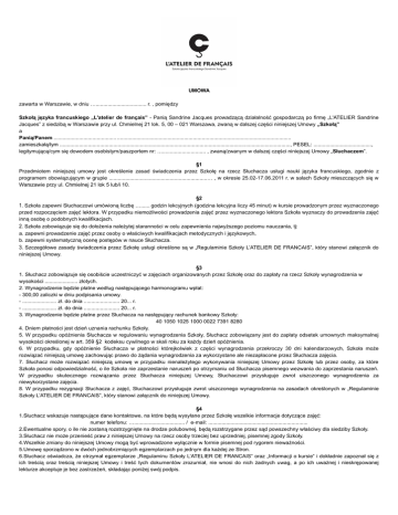 UMOWA zawarta w Warszawie, w dniu ….................................. r. , pomiędzy Szkołą języka francuskiego „L'atelier de français” - Panią Sandrine Jacques prowadzącą działalność gospodarczą po firmę „L'ATELIER Sandrine Jacques” z siedzibą w Warszawie przy ul. Chmielnej 21 lok. 5, 00 – 021 Warszawa, zwaną w dalszej części niniejszej Umowy „Szkołą” a Panią/Panem .........................................…................................................................................................................... zamieszkałą/łym ..........................................................................................................................................................., PESEL: ......................................., legitymującą/cym się dowodem osobistym/paszportem nr: …............................. , zwaną/zwanym w dalszej części niniejszej Umowy „Słuchaczem”. §1 Przedmiotem niniejszej umowy jest określenie zasad świadczenia przez Szkołę na rzecz Słuchacza usługi nauki języka francuskiego, zgodnie z programem obowiązującym w grupie ..................................................................… , w okresie 25.02-17.06.2011 r. w salach Szkoły mieszczących się w Warszawie przy ul. Chmielnej 21 lok 5 lub/i 10. §2 1. Szkoła zapewni Słuchaczowi umówioną liczbę …...... godzin lekcyjnych (godzina lekcyjna liczy 45 minut) w kursie prowadzonym przez wyznaczonego przed rozpoczęciem zajęć lektora. W przypadku niemożliwości prowadzenia zajęć przez wyznaczonego lektora Szkoła wyznaczy do prowadzenia zajęć inną osobę o podobnych kwalifikacjach. 2. Szkoła zobowiązuje się do dołożenia należytej staranności w celu zapewnienia najwyższego poziomu nauczania, tj: a. zapewni prowadzenie zajęć przez osoby o właściwych kwalifikacjach metodycznych i językowych, b. zapewni systematyczną ocenę postępów w nauce Słuchacza. 3. Szczegółowe zasady świadczenia przez Szkołę usługi określone są w „Regulaminie Szkoły L’ATELIER DE FRANCAIS”, który stanowi załącznik do niniejszej Umowy. §3 1. Słuchacz zobowiązuje się osobiście uczestniczyć w zajęciach organizowanych przez Szkołę oraz do zapłaty na rzecz Szkoły wynagrodzenia w wysokości ...................... złotych. 2. Wynagrodzenie będzie płatne według następującego harmonogramu wpłat: - 300,00 zaliczki w dniu podpisania umowy. - ....................... zł. do dnia ........................ 20... r. - ....................... zł. do dnia ........................ 20... r. 3. Wynagrodzenie będzie płatne przez Słuchacza na następujący rachunek bankowy Szkoły: 40 1050 1025 1000 0022 7391 8280 4. Dniem płatności jest dzień uznania rachunku Szkoły. 5. W przypadku opóźnienia Słuchacza w regulowaniu wynagrodzenia Szkoły, Słuchacz zobowiązany jest do zapłaty odsetek umownych maksymalnej wysokości określonej w art. 359 §2 kodeksu cywilnego w skali roku za każdy dzień opóźnienia. 6. W przypadku, gdy opóźnienie Słuchacza w płatności którejkolwiek z części wynagrodzenia przekroczy 30 dni kalendarzowych, Szkoła może rozwiązać niniejszą umowę zachowując prawo do żądania wynagrodzenia za wykorzystane ale niezapłacone przez Słuchacza zajęcia. 7. Słuchacz może rozwiązać niniejszą umowę w przypadku nienależytego wykonywania niniejszej Umowy przez Szkołę lub przez osoby, za które Szkoła ponosi odpowiedzialność, o ile Szkoła nie zaprzestanie naruszeń po otrzymaniu od Słuchacza pisemnego wezwania do zaprzestania naruszeń. W przypadku skutecznego rozwiązania przez Słuchacza niniejszej Umowy, Słuchaczowi przysługuje zwrot uiszczonego wynagrodzenia za niewykorzystane zajęcia. 8. W przypadku rezygnacji Słuchacza z zajęć, Słuchaczowi przysługuje zwrot uiszczonego wynagrodzenia na zasadach określonych w „Regulaminie Szkoły L’ATELIER DE FRANCAIS”, który stanowi załącznik do niniejszej Umowy. §4 1.Słuchacz wskazuje następujące dane kontaktowe, na które będą wysyłane przez Szkołę wszelkie informacje dotyczące zajęć: numer telefonu: ….................................. / e-mail: ................................................................... 2.Ewentualne spory, o ile nie zostaną rozstrzygnięte na drodze polubownej, będą rozstrzygane przez sąd powszechny właściwy dla siedziby Szkoły. 3.Słuchacz nie może przenieść praw z niniejszej Umowy na rzecz osoby trzeciej bez uprzedniej, pisemnej zgody Szkoły. 4.Wszelkie zmiany do niniejszej Umowy mogą być wprowadzone wyłącznie w formie pisemnej pod rygorem nieważności. 5.Umowę sporządzono w dwóch jednobrzmiących egzemplarzach po jednym dla każdej ze Stron. 6.Słuchacz oświadcza, że otrzymał egzemplarze „Regulaminu Szkoły L’ATELIER DE FRANCAIS” oraz „Informacji o kursie” i dokładnie zapoznał się z ich treścią oraz treścią niniejszej Umowy i treść tych dokumentów zrozumiał, nie wnosi do nich żadnych uwag, a po ich uważnej i nieskrępowanej lekturze akceptuje je bez zastrzeżeń, składając poniżej swój podpis.