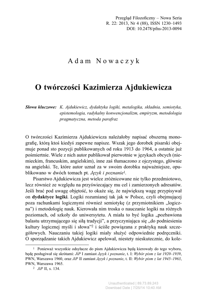 Przegląd Filozoficzny – Nowa Seria R. 22: 2013, Nr 4 (88), ISSN 1230–1493 DOI: 10.2478/pfns-2013-0094 Adam Nowaczyk O twórczości Kazimierza Ajdukiewicza Słowa kluczowe: K. Ajdukiewicz, dydaktyka logiki, metalogika, składnia, semiotyka, epistemologia, radykalny konwencjonalizm, empiryzm, metodologia pragmatyczna, metoda parafraz O twórczości Kazimierza Ajdukiewicza należałoby napisać obszerną monografię, którą ktoś kiedyś zapewne napisze. Wszak jego dorobek pisarski obejmuje ponad sto pozycji publikowanych od roku 1913 do 1964, a ostatnie już pośmiertnie. Wiele z nich autor publikował pierwotnie w językach obcych (niemieckim, francuskim, angielskim), inne zaś tłumaczono z ojczystego, głównie na angielski. Te, które autor uznał za w swoim dorobku najważniejsze, opublikowano w dwóch tomach pt. Język i poznanie1. Pisarstwo Ajdukiewicza jest wielce zróżnicowane nie tylko przedmiotowo, lecz również ze względu na przyświecający mu cel i zamierzonych adresatów. Jeśli brać pod uwagę objętość, to okaże się, że największą wagę przypisywał on dydaktyce logiki. Logiki rozumianej tak jak w Polsce, czyli obejmującej poza rachunkami logicznymi również semiotykę (z przymiotnikiem „logiczna”) i metodologię nauk. Kierowała nim troska o nauczanie logiki na różnych poziomach, od szkoły do uniwersytetu. A miała to być logika „pozbawiona balastu utrzymującego się siłą tradycji”, a przyczyniająca się „do podniesienia kultury logicznej myśli i słowa”2 i ściśle powiązana z praktyką nauk szczegółowych. Nauczaniu takiej logiki miały służyć odpowiednie podręczniki. O sporządzanie takich Ajdukiewicz apelował, niestety nieskutecznie, do kole1 Ponieważ wszystkie odsyłacze do pism Ajdukiewicza będą kierowały do tego wyboru, będę posługiwał się skrótami: JiP I zamiast Język i poznanie, t. I: Wybór pism z lat 1920–1939, PWN, Warszawa 1960, oraz JiP II zamiast Język i poznanie, t. II: Wybór pism z lat 1945–1963, PWN, Warszawa 1965. 2 JiP II, s. 134. Unauthenticated | 89.73.89.243 Download Date | 7/25/14 10:40 AM Adam Nowaczyk 124 gów-logików, ale również sam je tworzył. Pierwszy, to autoryzowany skrypt z własnych wykładów na Uniwersytecie Warszawskim Główne zasady metodologii nauk i logiki formalnej, zredagowany przez M. Presburgera (1928). Kolejny, to adresowane do nauczycieli Logiczne podstawy nauczania (1934). Zachęcany po wielu latach do ich wznowienia, sędziwy już autor przetworzył je w wielokrotnie obszerniejszy podręcznik Logika pragmatyczna, niedokończony i opublikowany pośmiertnie. Jest to niewątpliwie najbogatszy zakresowo podręcznik logiki, odpowiadający temu, czego – zdaniem Ajdukiewicza – należy w ramach logiki nauczać, aby uczynić z niej dyscyplinę społecznie użyteczną, czyli: ...by przez szerzenie logicznej kultury myśli i słowa oddać rząd dusz w Polsce na usługi trzeźwego rozumu i uodpornić umysły przeciwko wszelkim doktrynom i wierzeniom, za którymi nie opowiadają się logiczne argumenty3. Warto zauważyć, że słowa te opublikował Ajdukiewicz w miesięczniku „Myśl Filozoficzna” w roku 1951, czyli w czasie triumfującego już stalinizmu, w odpowiedzi na pominięcie logiki w obradach I Kongresu Nauki Polskiej. Dwa lata później opublikował elementarny podręcznik logiki dla szkół średnich pt. Zarys logiki, który Ministerstwo Oświaty dopuściło do użytku wyłącznie jako książkę pomocniczą dla nauczycieli. Uczniom zezwolono z niej korzystać dopiero w roku 1957. Ajdukiewicz niestrudzenie walczył o właściwe i powszechne nauczanie logiki w szkołach średnich i wyższych, apelując o to kolejno w trzech publikacjach. Marzył o tym, aby służący temu podręcznik był dziełem zbiorowym sporządzonym przez grono specjalistów od poszczególnych problemów. Nie doczekawszy się odzewu, sam podjął pracę nad Logiką pragmatyczną. Jednakże nie można powiedzieć, że Ajdukiewicz nie wywarł wpływu na nauczanie, a także na uprawianie logiki w Polsce. Wprost przeciwnie, jego twórcze i oryginalne prace ukształtowały słownik logiczny, który niemal powszechnie przyjął się w polskich podręcznikach i publikacjach naukowych polskich logików. Odnosi się to zwłaszcza do składni, typologii definicji, logiki pytań i klasyfikacji rozumowań. Oryginalne rozprawy naukowe Ajdukiewicza z trudem poddają się zabiegom klasyfikacyjnym. W niemal wszystkich splatają się wątki należące do różnych subdyscyplin logicznych i filozoficznych: logiki formalnej, semiotyki, metodologii, ontologii i teorii poznania. Tylko dwie prace poświęcił Ajdukiewicz metalogice, która z biegiem lat stała się polską specjalnością. Pierwsza, to jego rozprawa habilitacyjna pt. Z metodologii nauk dedukcyjnych (1921). W dziejach nauk dedukcyjnych 3 JiP II, s. 142. Unauthenticated | 89.73.89.243 Download Date | 7/25/14 10:40 AM O twórczości Kazimierza Ajdukiewicza 125 wyróżnia tu autor trzy etapy: stadium przedaksjomatyczne, aksjomatyczne i – jego zdaniem najdoskonalsze – stadium formalizacji. Utrzymuje, że w nauce dedukcyjnej sformalizowanej symbole nic nie znaczą, a aksjomaty i twierdzenia niczego nie stwierdzają, zatem nie mogą być oceniane jako prawdziwe bądź fałszywe. Taką sformalizowaną nauką dedukcyjną jest system logiki ukonstytuowany przez jego aksjomaty i reguły dowodzenia twierdzeń. Ważnym osiągnięciem autora jest tu analiza pojęcia dowodu i – być może pierwsza – syntaktyczna definicja pojęcia wynikania logicznego. Należy tu jednak zauważyć, że te dwa pojęcia odnoszą się jedynie do logiki czystej, w której formułach występują wyłącznie zmienne i stałe logiczne, zatem nie stosują się do zdań zawierających również stałe pozalogiczne. Szersze pojęcie wynikania logicznego, które stosuje się również do takich zdań, wprowadził dopiero Tarski w roku 1936, ale była to semantyczna defin