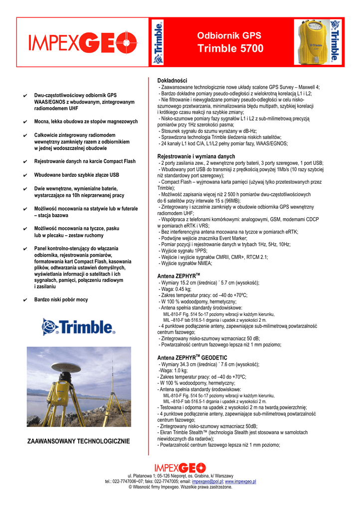 Odbiornik GPS Trimble 5700 Dokładności ✔ Dwu-częstotliwościowy odbiornik GPS WAAS/EGNOS z wbudowanym, zintegrowanym radiomodemem UHF ✔ Mocna, lekka obudowa ze stopów magnezowych ✔ Całkowicie zintegrowany radiomodem wewnętrzny zamknięty razem z odbiornikiem w jednej wodoszczelnej obudowie ✔ Rejestrowanie danych na karcie Compact Flash ✔ Wbudowane bardzo szybkie złącze USB ✔ Dwie wewnętrzne, wymienialne baterie, wystarczające na 10h nieprzerwanej pracy ✔ MoŜliwość mocowania na statywie lub w futerale – stacja bazowa ✔ MoŜliwość mocowania na tyczce, pasku lub w plecaku – zestaw ruchomy ✔ Panel kontrolno-sterujący do włączania odbiornika, rejestrowania pomiarów, formatowania kart Compact Flash, kasowania plików, odtwarzania ustawień domyślnych, wyświetlania informacji o satelitach i ich sygnałach, pamięci, połączeniu radiowym i zasilaniu ✔ Bardzo niski pobór mocy - Zaawansowane technologicznie nowe układy scalone GPS Survey – Maxwell 4; - Bardzo dokładne pomiary pseudo-odległości z wielokrotną korelacją L1 i L2; - Nie filtrowanie i niewygładzane pomiary pseudo-odległości w celu niskoszumowego przetwarzania, minimalizowania błędu multipath, szybkiej korelacji i krótkiego czasu reakcji na szybkie zmiany; - Nisko-szumowe pomiary fazy sygnałów L1 i L2 z sub-milimetrową precyzją pomiarów przy 1Hz szerokości pasma; - Stosunek sygnału do szumu wyraŜany w dB-Hz; - Sprawdzona technologia Trimble śledzenia niskich satelitów; - 24 kanały L1 kod C/A, L1/L2 pełny pomiar fazy, WAAS/EGNOS; Rejestrowanie i wymiana danych - 2 porty zasilania zew., 2 wewnętrzne porty baterii, 3 porty szeregowe, 1 port USB; - Wbudowany port USB do transmisji z prędkością powyŜej 1Mb/s (10 razy szybciej niŜ standardowy port szeregowy); - Compact Flash – wyjmowana karta pamięci (uŜywaj tylko przetestowanych przez Trimble); - MoŜliwość zapisania więcej niŜ 2 500 h pomiarów dwu-częstotliwościowych do 6 satelitów przy interwale 15 s (96MB); - Zintegrowany i szczelnie zamknięty w obudowie odbiornika GPS wewnętrzny radiomodem UHF; - Współpraca z telefonami komórkowymi: analogowymi, GSM, modemami CDCP w pomiarach eRTK i VRS; - Bez interferencyjna antena mocowana na tyczce w pomiarach eRTK; - Podwójne wejście znacznika Event Marker; - Pomiar pozycji i rejestrowanie danych w trybach 1Hz, 5Hz, 10Hz; - Wyjście sygnału 1PPS; - Wejście i wyjście sygnałów CMRII, CMR+, RTCM 2.1; - Wyjście sygnałów NMEA; Antena ZEPHYRTM - Wymiary 15.2 cm (średnica) ´ 5.7 cm (wysokość); - Waga: 0.45 kg; - Zakres temperatur pracy: od –40 do +70ºC; - W 100 % wodoodporny, hermetyczny; - Antena spełnia standardy środowiskowe: MIL-810-F Fig. 514 5c-17 poziomy wibracji w kaŜdym kierunku, MIL –810-F tab 516.5-1 drgania i upadek z wysokości 2 m. - 4 punktowe podłączenie anteny, zapewniające sub-milimetrową powtarzalność centrum fazowego; - Zintegrowany nisko-szumowy wzmacniacz 50 dB; - Powtarzalność centrum fazowego lepsza niŜ 1 mm poziomo; Antena ZEPHYRTM GEODETIC - Wymiary 34.3 cm (średnica) ´ 7.6 cm (wysokość); -Waga: 1.0 kg; - Zakres temperatur pracy: od –40 do +70ºC; - W 100 % wodoodporny, hermetyczny; - Antena spełnia standardy środowiskowe: MIL-810-F Fig. 514 5c-17 poziomy wibracji w kaŜdym kierunku, MIL –810-F tab 516.5-1 drgania i upadek z wysokości 2 m. ZAAWANSOWANY TECHNOLOGICZNIE - Testowana i odporna na upadek z wysokości 2 m na twardą powierzchnię; - 4 punktowe podłączenie anteny, zapewniające sub-milimetrową powtarzalność centrum fazowego; - Zintegrowany nisko-szumowy wzmacniacz 50dB; - Ekran Trimble Stealth™ (technologia Stealth jest stosowana w samolotach niewidocznych dla radarów); - Powtarzalność centrum fazowego lepsza niŜ 1 mm poziomo; ul. Platanowa 1; 05-126 Nieporęt, os. Grabina, k/ Warszawy tel.: 022-7747006~07; faks: 022-7747005; email: [email protected]; www.impexgeo.pl © Własność firmy Impexgeo. Wszelkie prawa zastrzeŜone. Parametr 5700 Dokładność pomiarów Kodowe pomiary róŜnicowe DGPS7 Poziomo ± (0.25 m + 1 ppm) RMS WAAS < 5 m 3DRMS1 Pionowo ± (0.50 m + 1 ppm) RMS Pionowo ± (5 mm + 1 ppm) RMS Pomiary statyczne: Static i FastStatic (postprocessing)7 ± (5 mm + 0.5 ppm) RMS Poziomo ERTKTM rozszerzony RTK (pomiary w czasie rzeczywistym)7 Dostosowana do dalekiego zasięgu technologia dwu-częstotliwościowego RTK Poziomo ± (10 mm + 1 ppm) RMS Pionowo Czas inicjalizacji 0.02 sekundy (20 ms) opóźnienia Jedno/wielo-bazowa eRTK: minim. 10 s + 0.5 s * długość wektora (do 30 km) VRS < 30s Wiarygodność > 99.9% 2 Pokrycie RTK Typowe ze standardowej, pojedynczej bazy RTK eRTK z pojedynczej bazy Wielo-bazowe eRTK eRTK w systemie VRS ± (20 mm + 1 ppm) RMS 300 km2 1 250 km2 (3) 3 750 km2 (4) 8 500 km2 i więcej (3, 5) Parametry fizyczne Obudowa Mocna, lekka i hermetyczna obudowa ze stopów magnezowych Wodoszczelność IPX 7, zanurzenie pod wodą na głębokość 1 m Wytrzymałość Wytrzymuje upadek z wysokości 1 m na twardą powierzchnię. Przetestowany i odporny na przypadkowe wstrząsy i wibracje do 40G. Waga Z wewnętrznymi bateriami, wewnętrznym radiomodemem, wewnętrzną ładowarką baterii, standardową anteną UHF: 1.4 kg Cały zestaw ruchomy z bateriami na 7 h pracy : < 4 kg Odbiornik GPS Trimble 5700 – Parametry techniczne Zasilanie Zasilanie Napięcie stałe od 10.5 do 28 V z zabezpieczeniem przeciw przepięciowym Napięcie wyjściowe: 10.5 do 20 V (port 1), 10.5 do 27.5 V (port3) Pobór mocy 2.5 W – odbiornik, 3.75 W odbiornik z wewnętrznym radiomodemem Bateria Więcej niŜ 10 h w pomiarach statycznych, więcej niŜ 7 h w pomiarach RTK (dwie miniaturowe baterie Camcorder) Waga baterii 0.1 kg Ładowarka Wewnętrzna, wbudowana w odbiornik z zewnętrznym adapterem AC, brak potrzeby stosowania ładowarek zewnętrznych Certyfikaty FCC i CE Parametry środowiskowe Temperatura pracy / przechowywania od -40 do +65 0C / od -40 do +800C Odporność na wilgoć 10